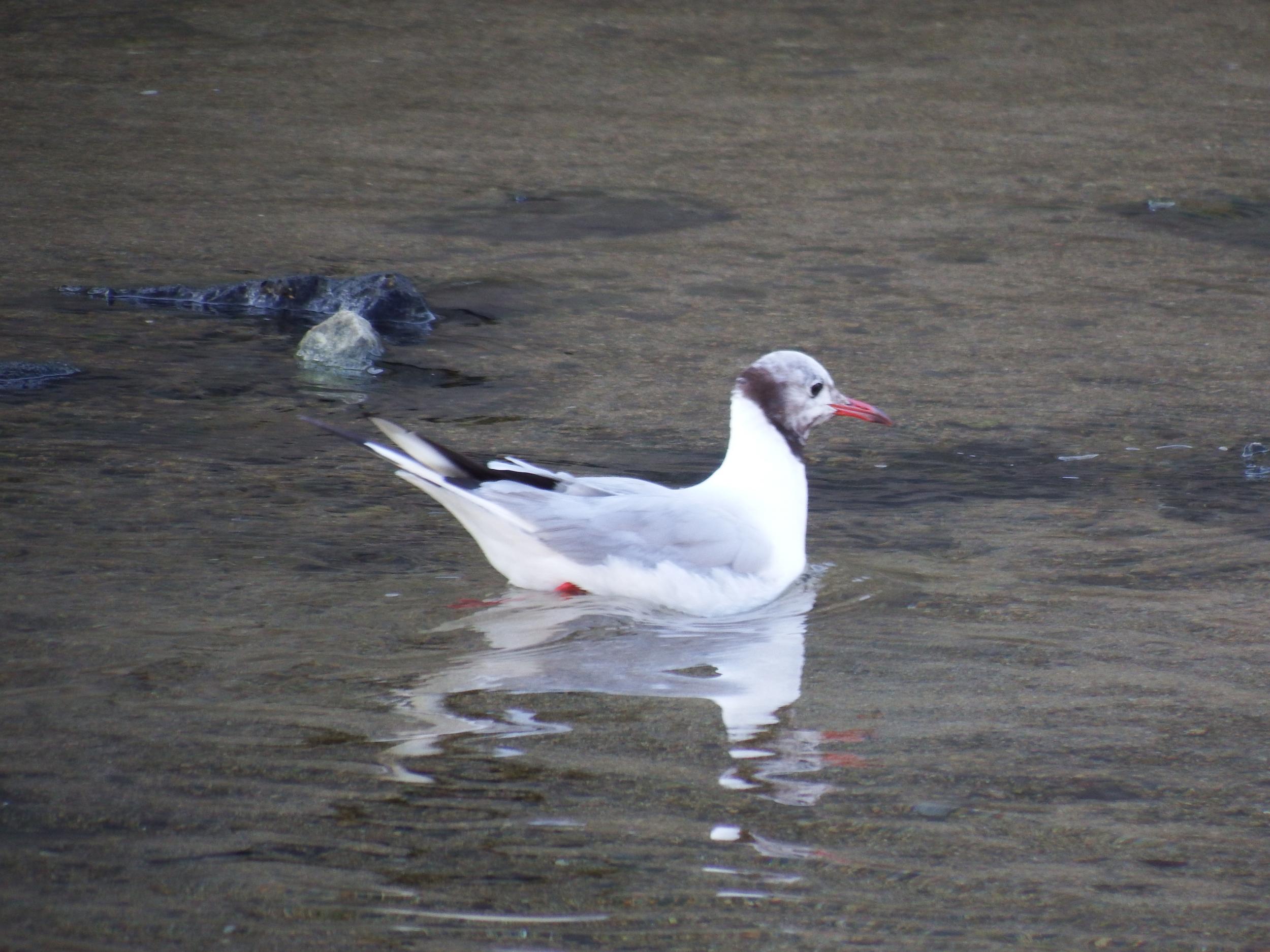 変な顔のユリカモメ。夏羽から冬羽に変わる途中のようですが、ユリカモメにあるまじき、かなりブサイクです。それに嘴や脚が赤すぎるように思うのですが、目つきはやはりユリカモメです。