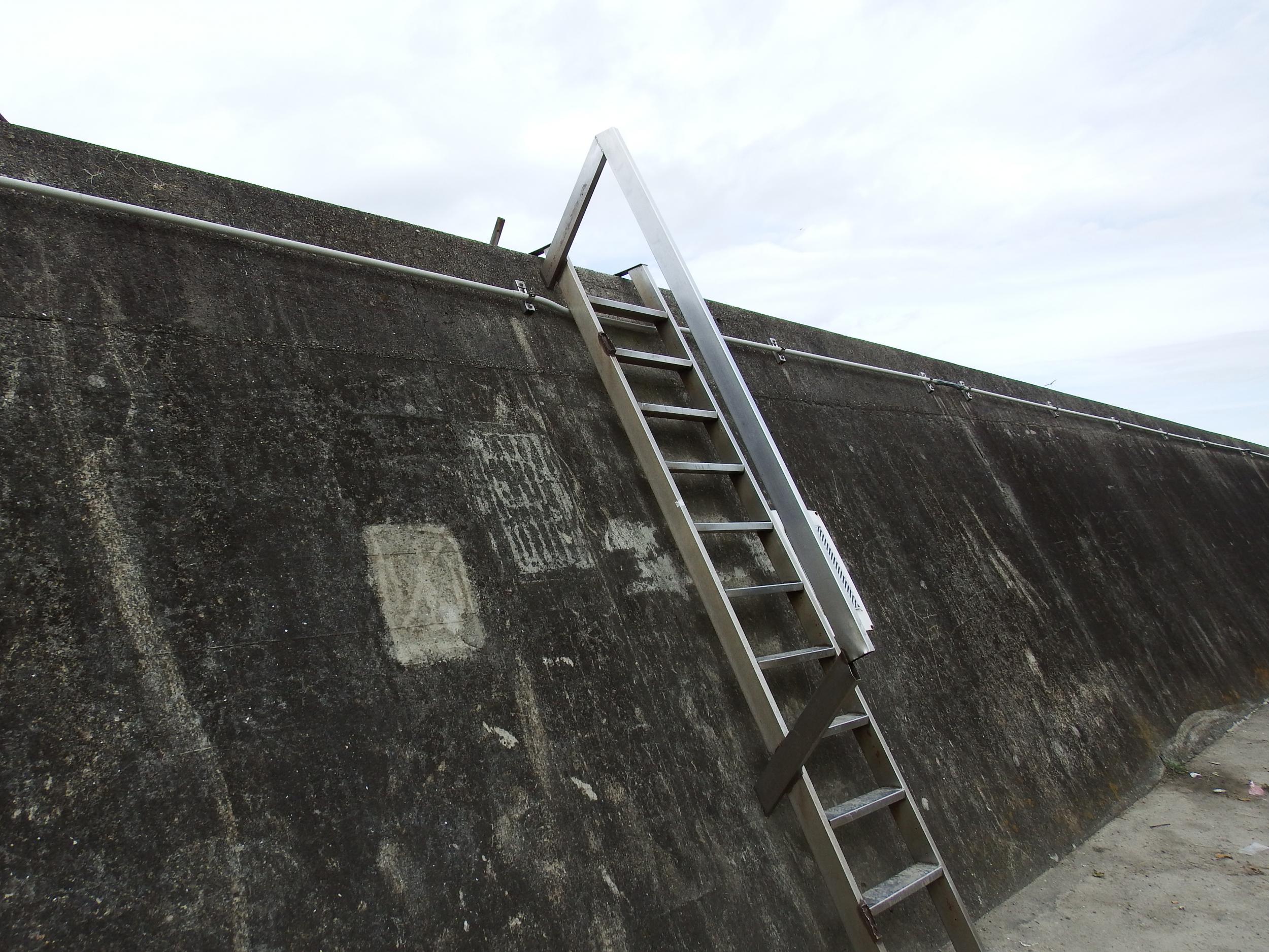 今日は関空の離陸は南向きです。多奈川駅から10分弱歩いて目的地に到着も、高い堤防に囲まれています。釣り人が架けたものと思われるハシゴを上らせてもらいます。