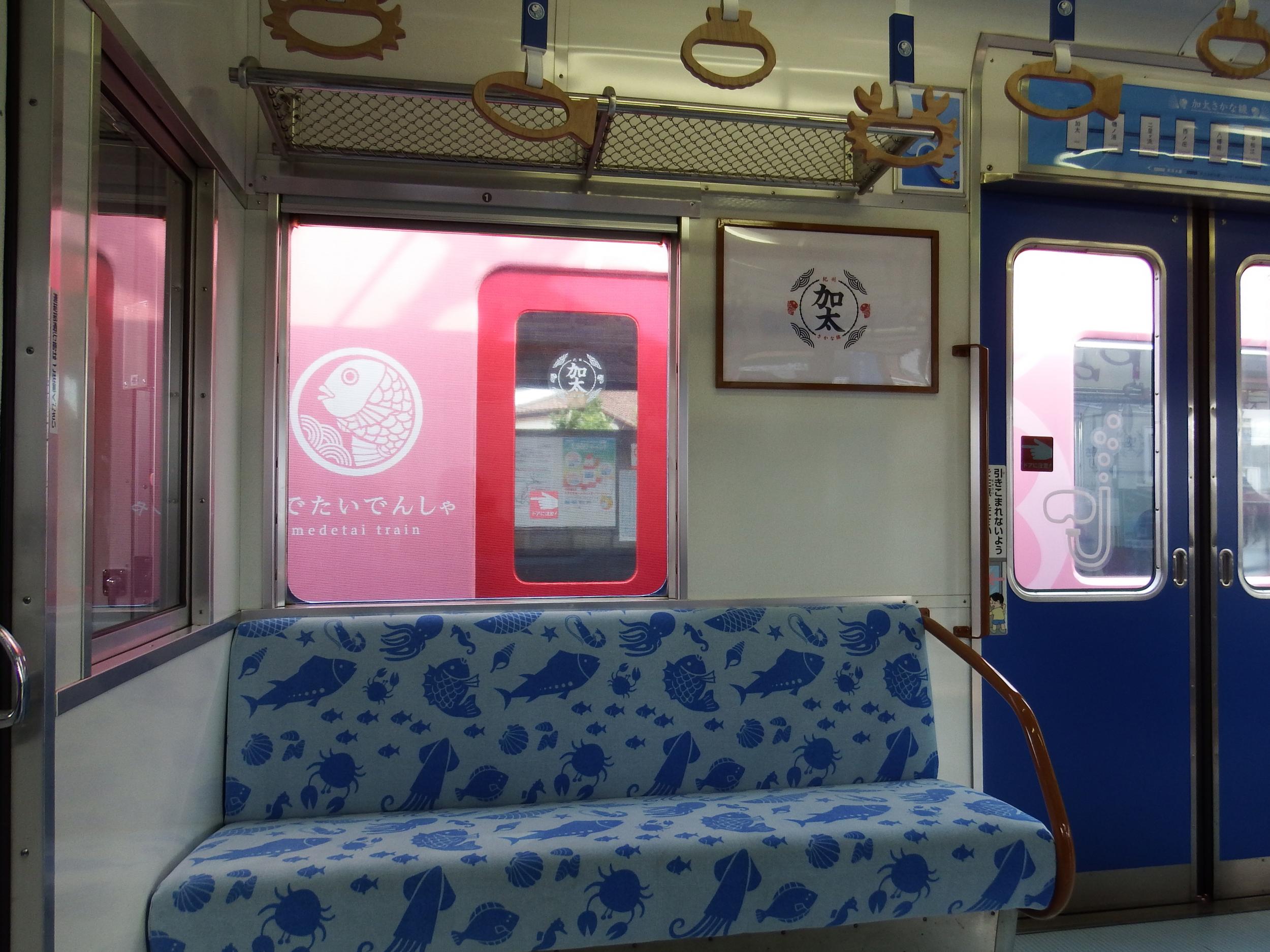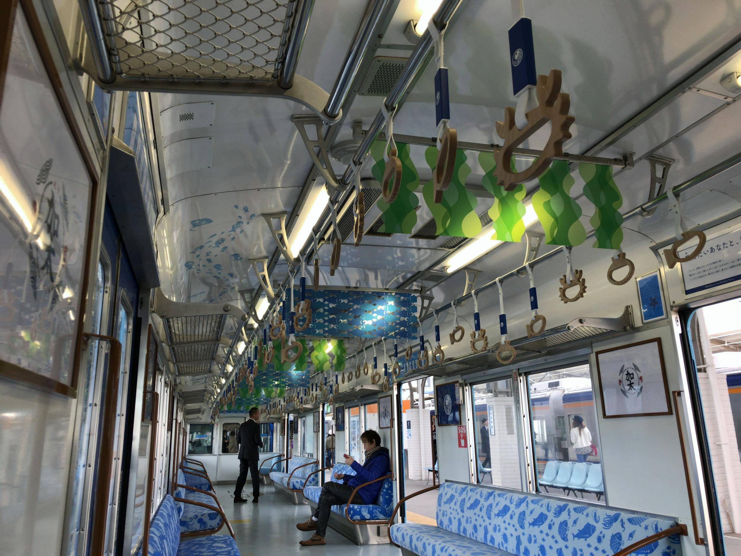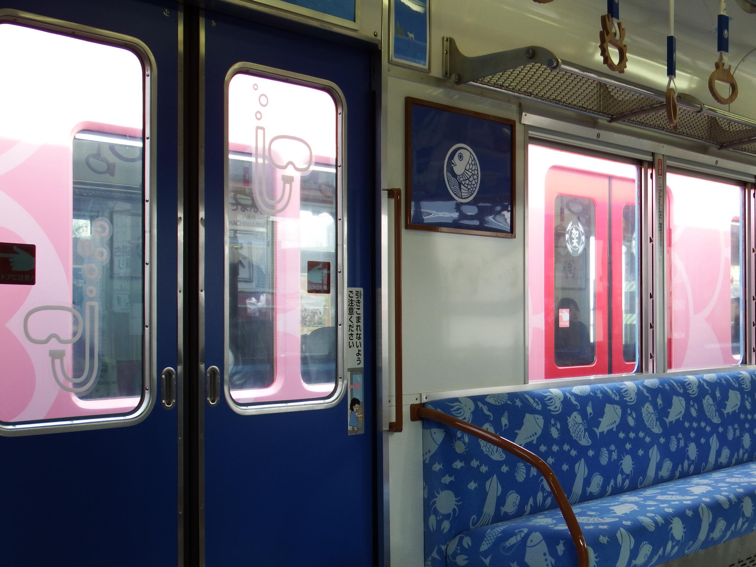 シートモケット、吊革も海をモチーフにめでたいピンクとは異なるデザイン、床も張り替えられ海釣りしている気分が味わえるようになってます。
