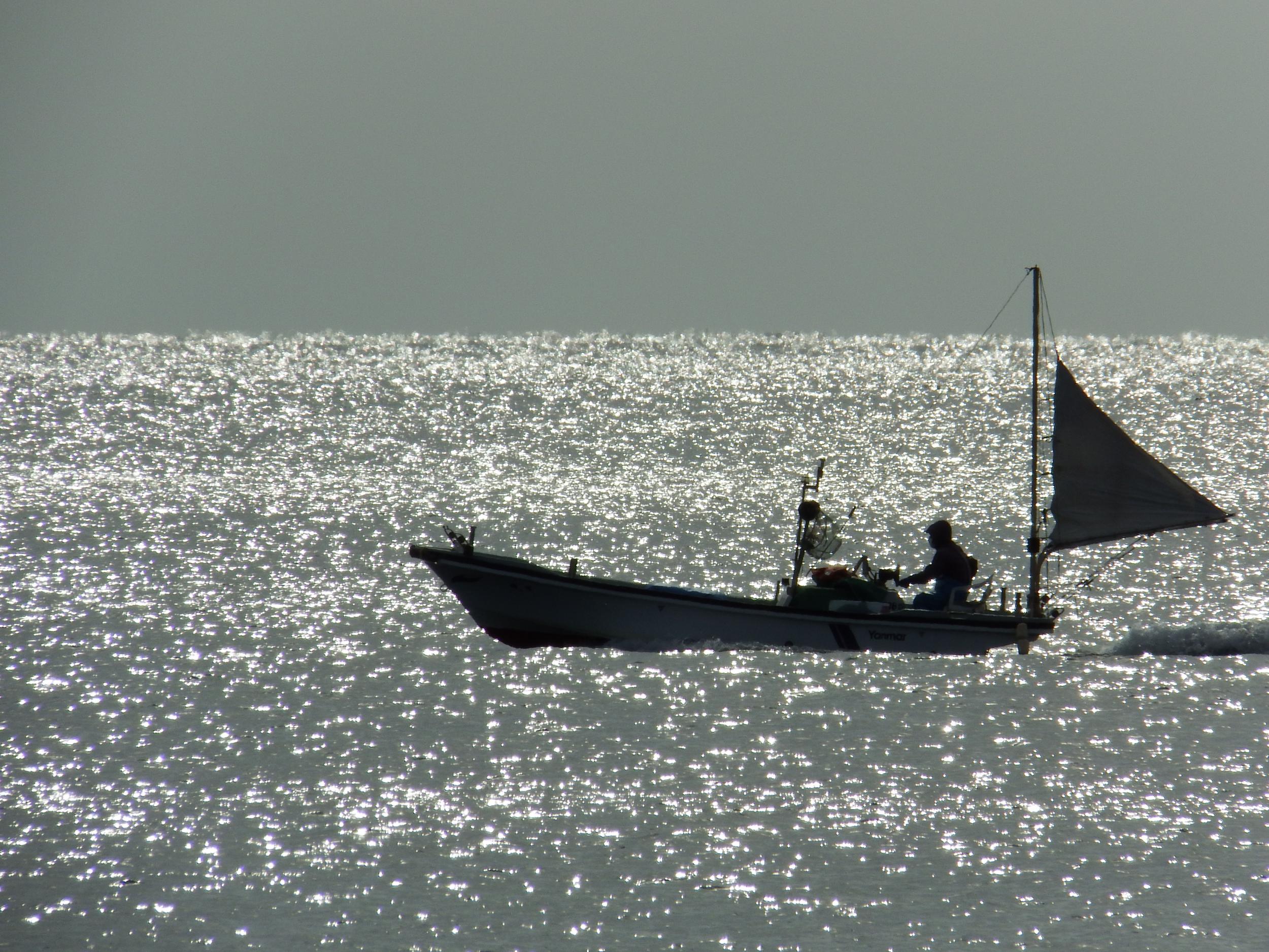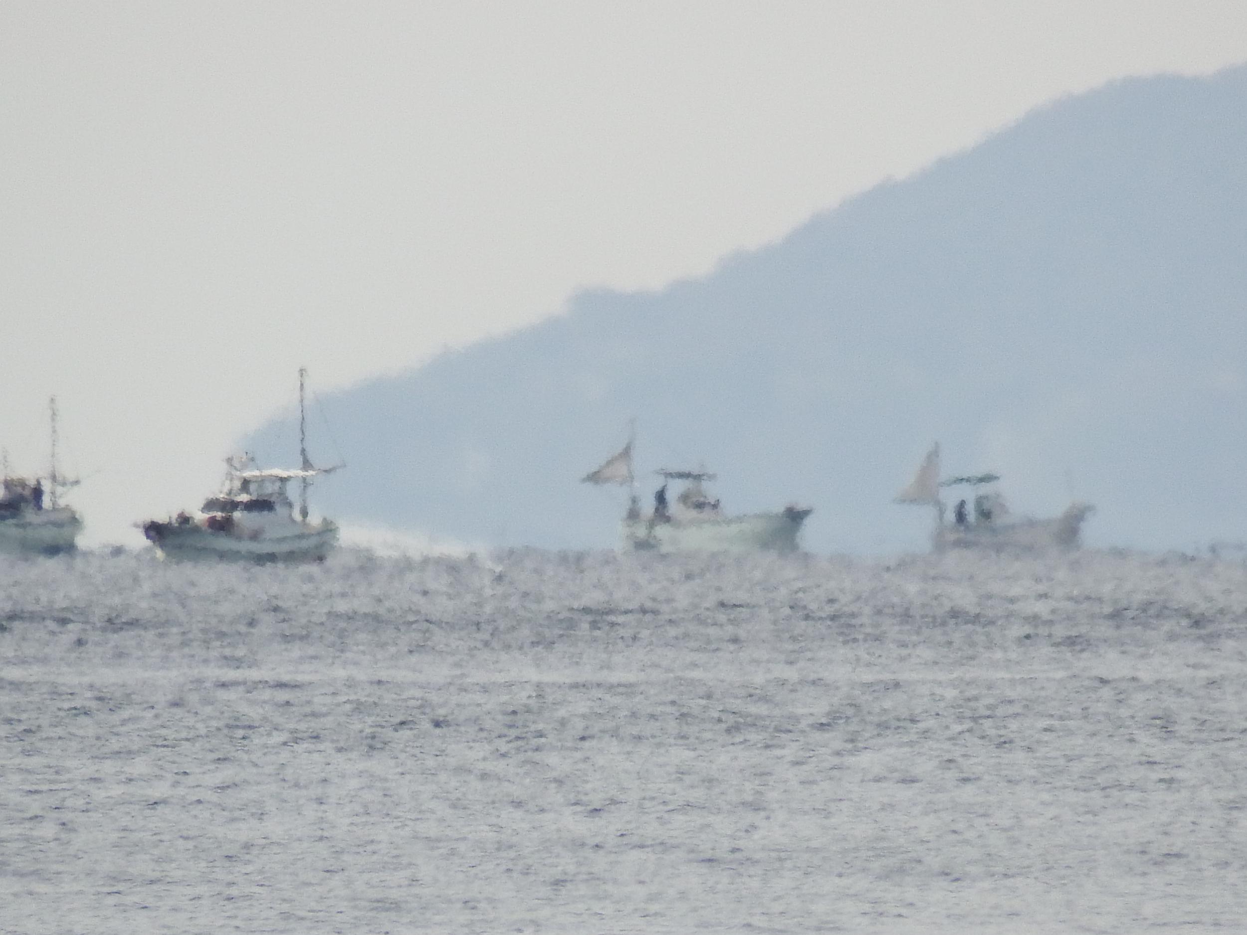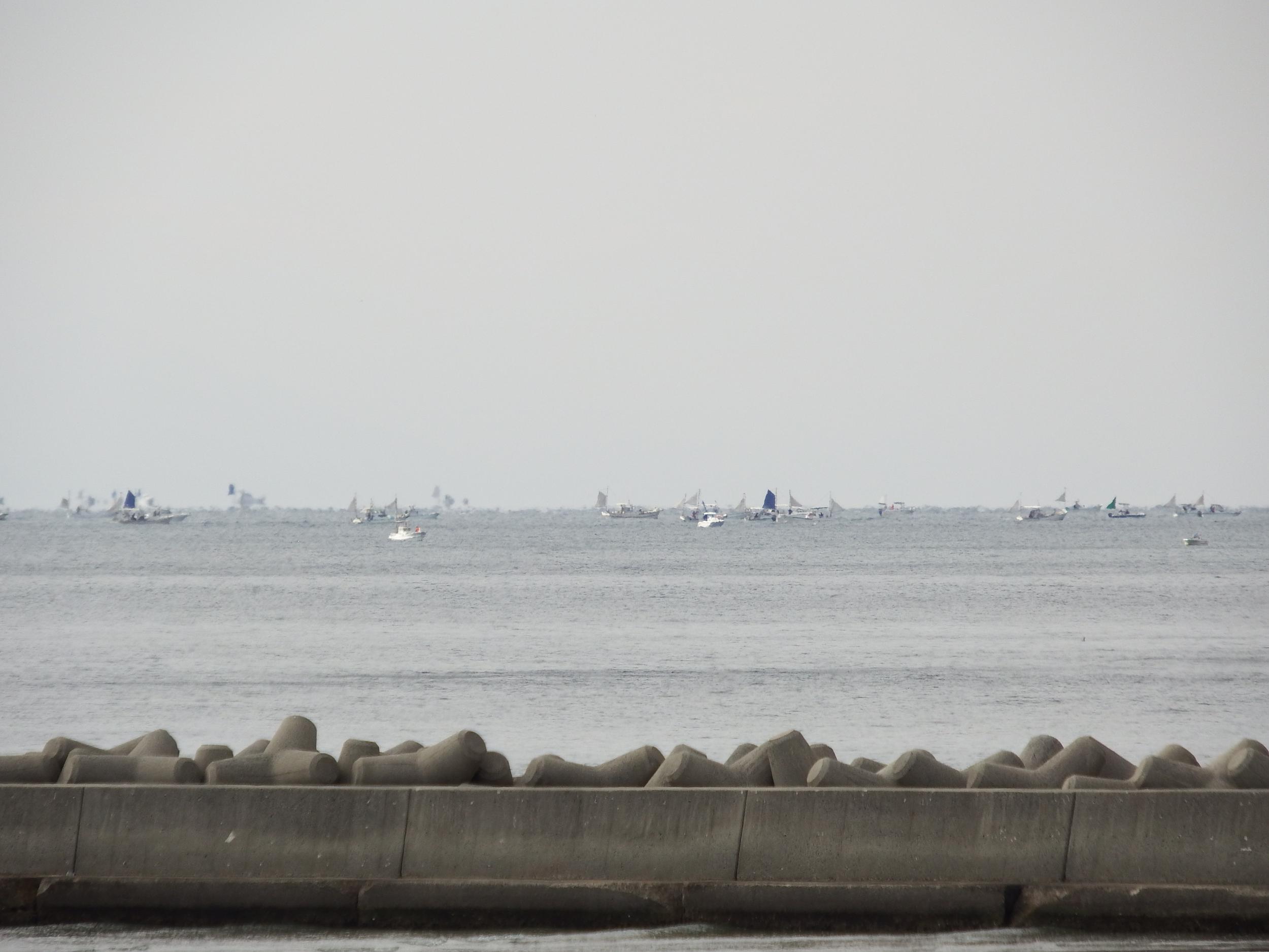 沖の漁船軍団をアップで撮ってみました。陽炎でボケボケです。何を獲っているのかは分かりませんが、どの船も一人乗りか二人乗りくらいの小さな船、というより舟で三角の帆を上げています。