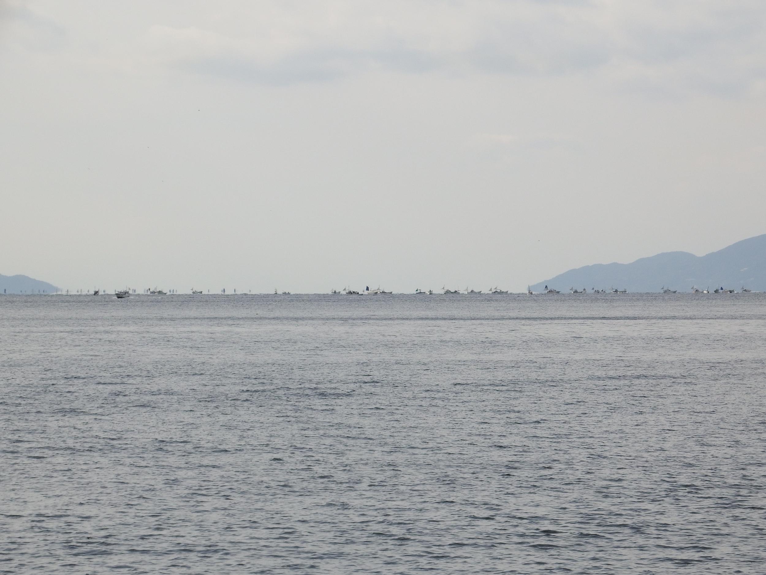 堤防の向こう、沖の方に漁船の大軍団が見えます。左側の島影はここから25kmほどの沼島です。