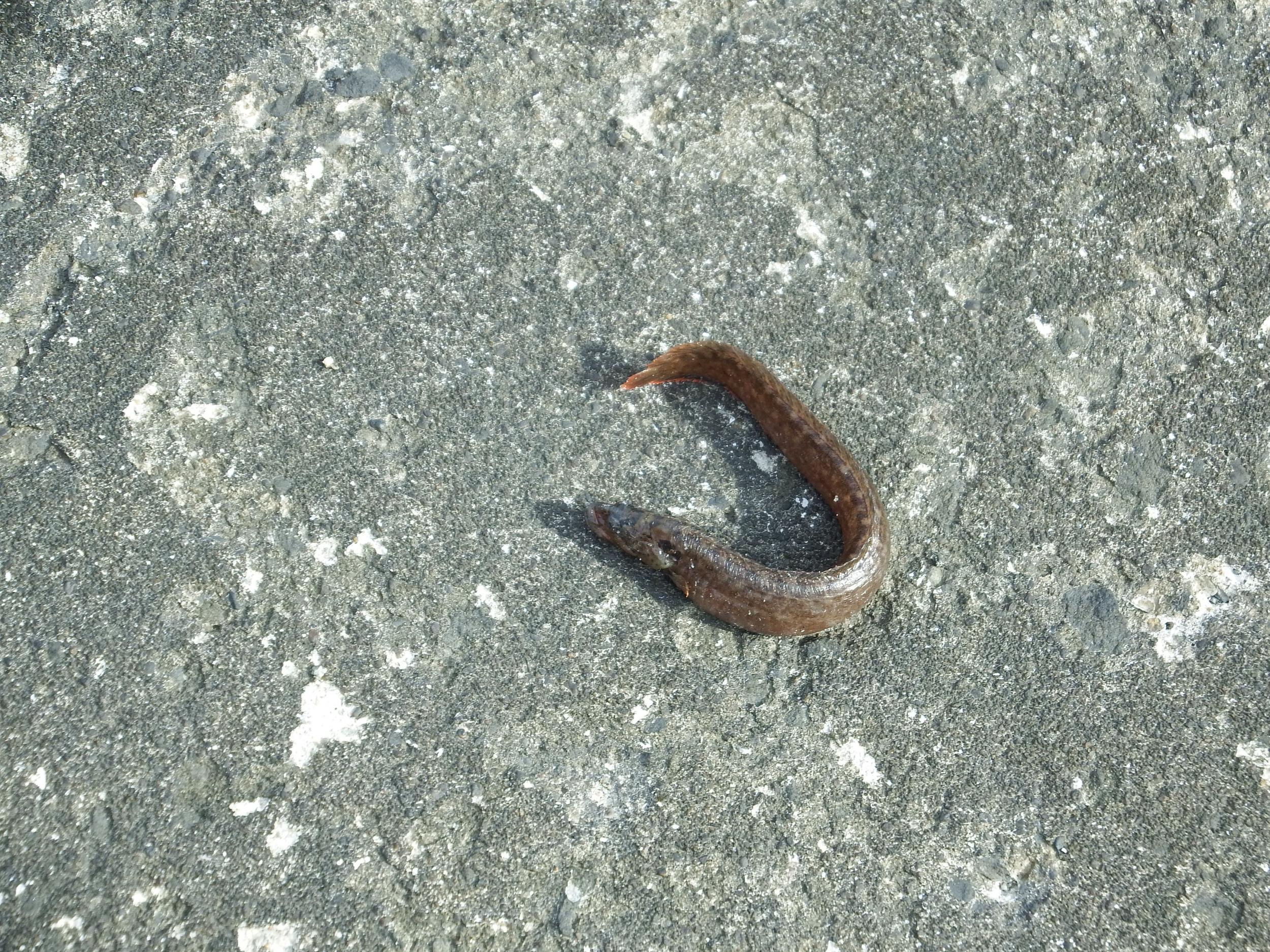 堤防に干からびたでっかいミミズ、じゃなくて何かの魚です。まだ生きています。海に返してやると体をクネクネさせて泳いで行きました。