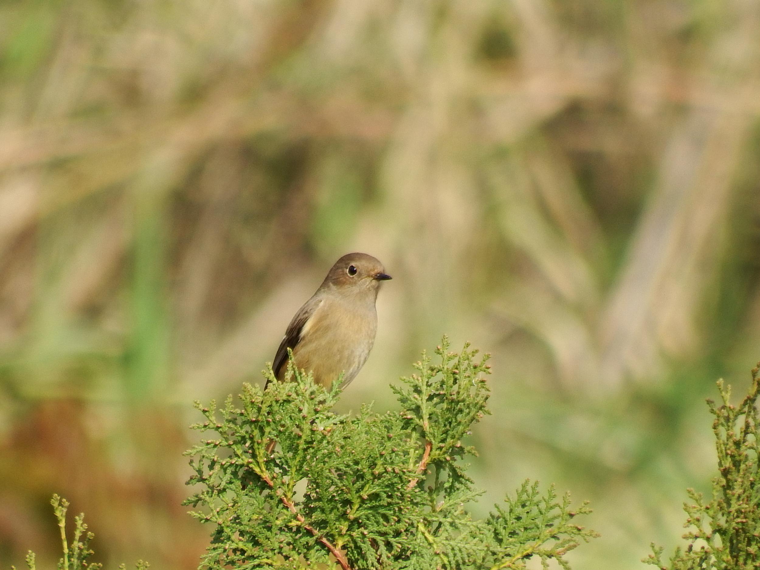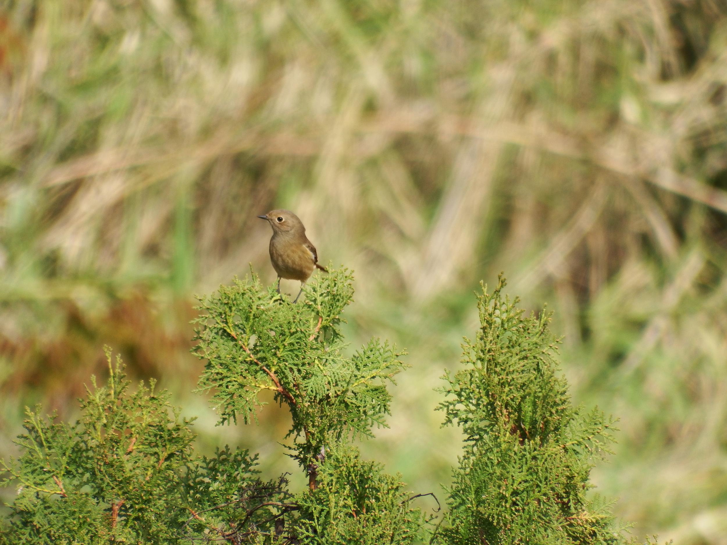 堤防の外の高い木のてっぺんにジョウビタキ♀、可愛い。