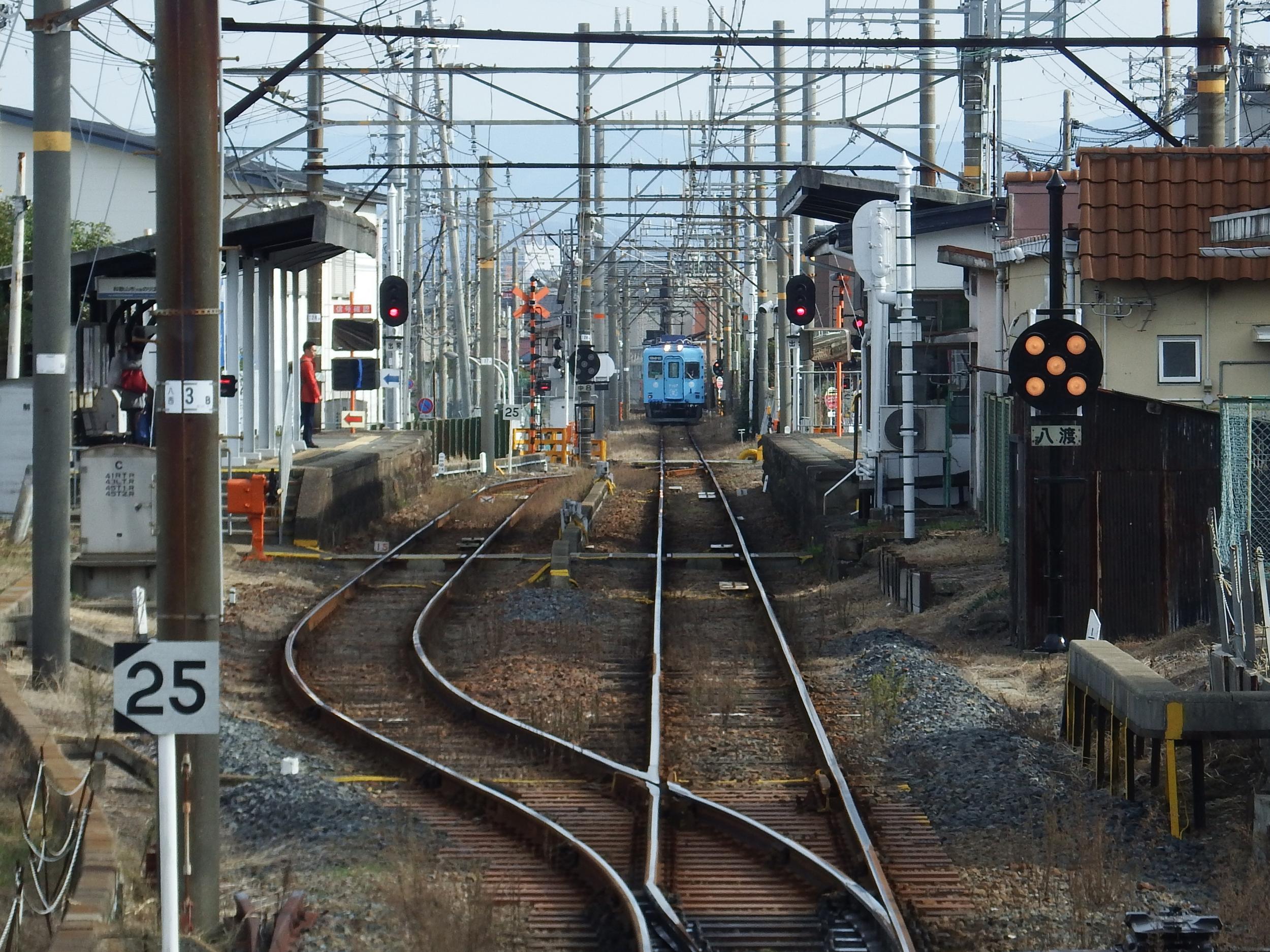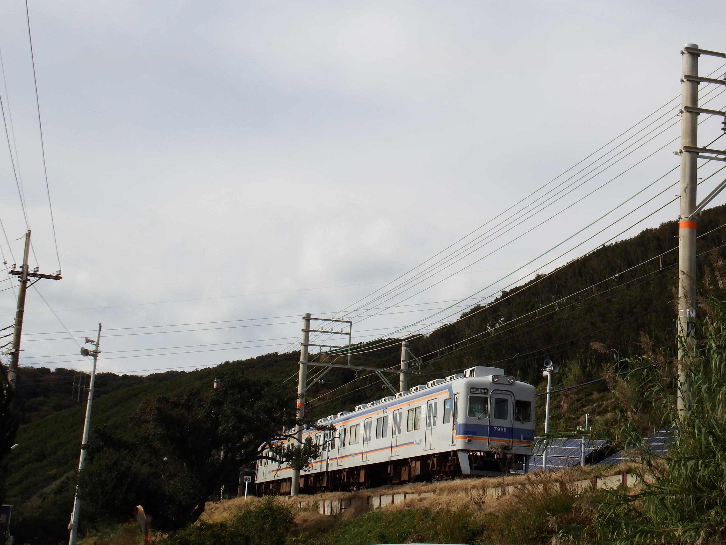 多奈川駅から深日港駅に入線する2230系、坂の向こうに2駅先の深日町駅ホームも見えます。
