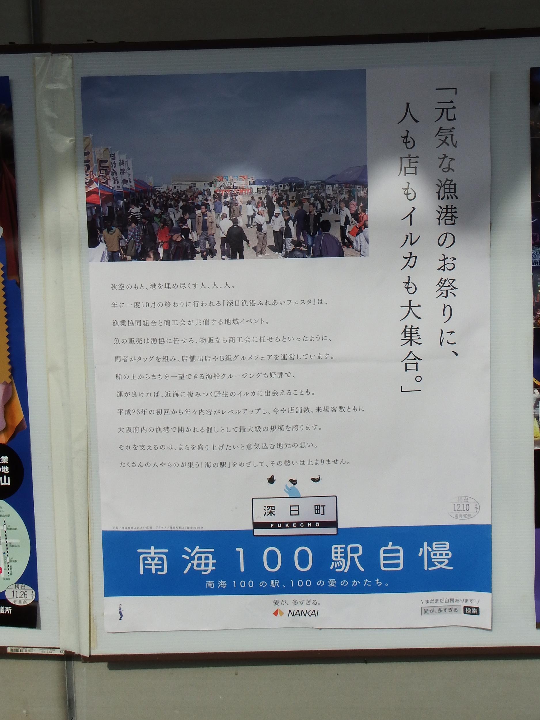 めだたいピンクは一般の7100系に交代していました。駅に貼ってあった深日町駅紹介のポスター、やはり「運が良ければ」イルカに会えるそうです。