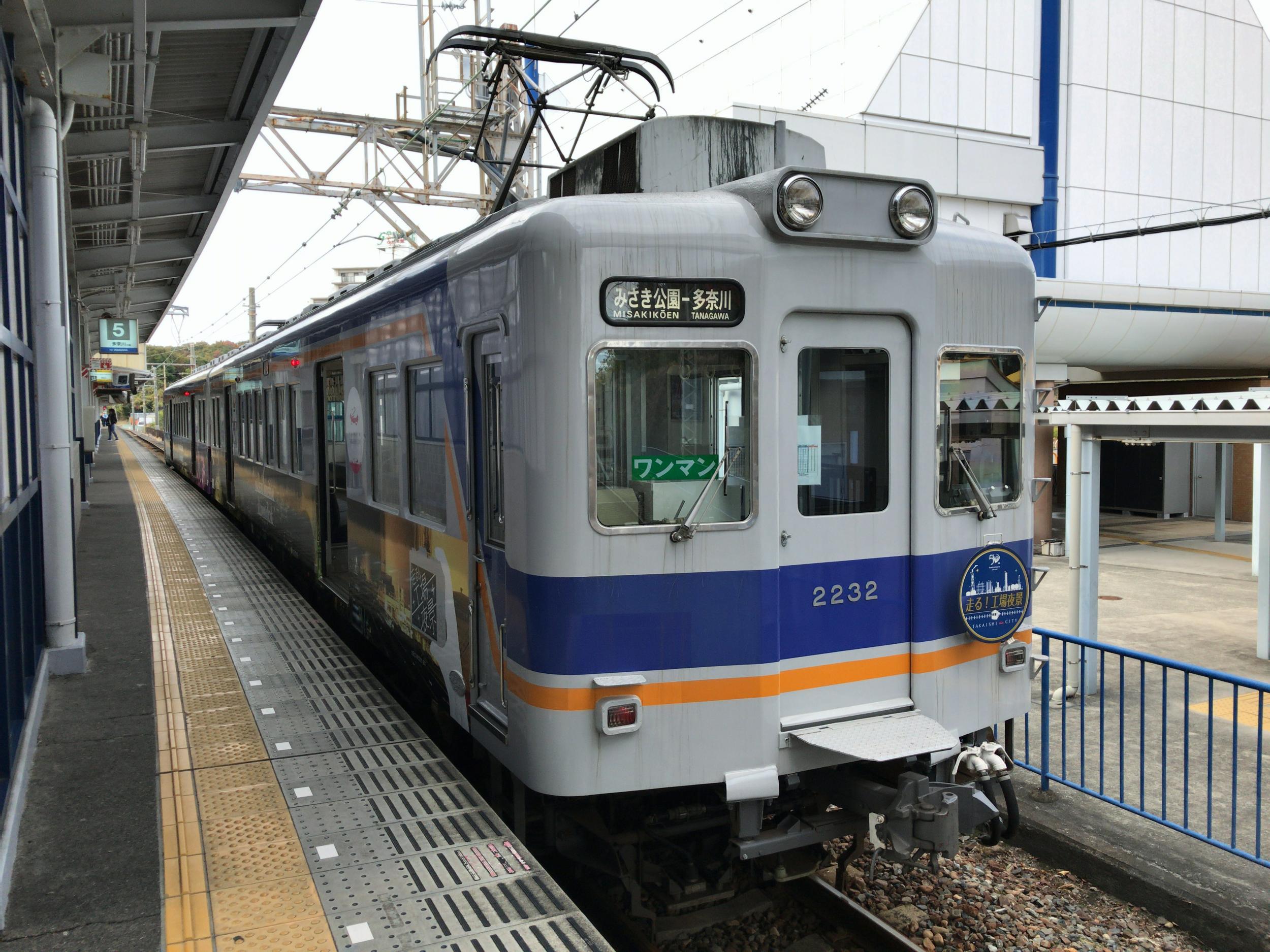 みさき公園到着、多奈川線に乗り換え。何故か高師浜線用の「走る!工場夜景」号です。