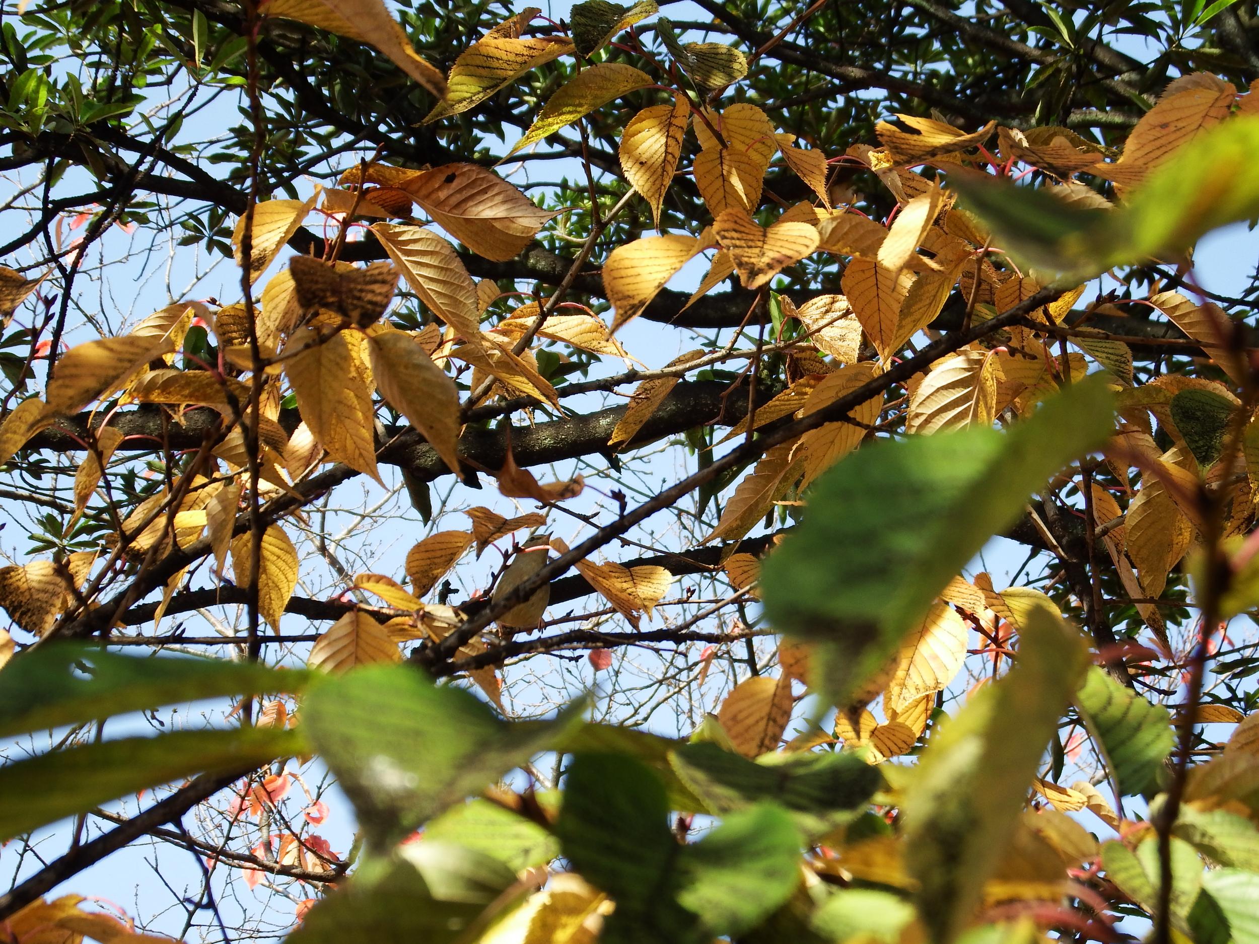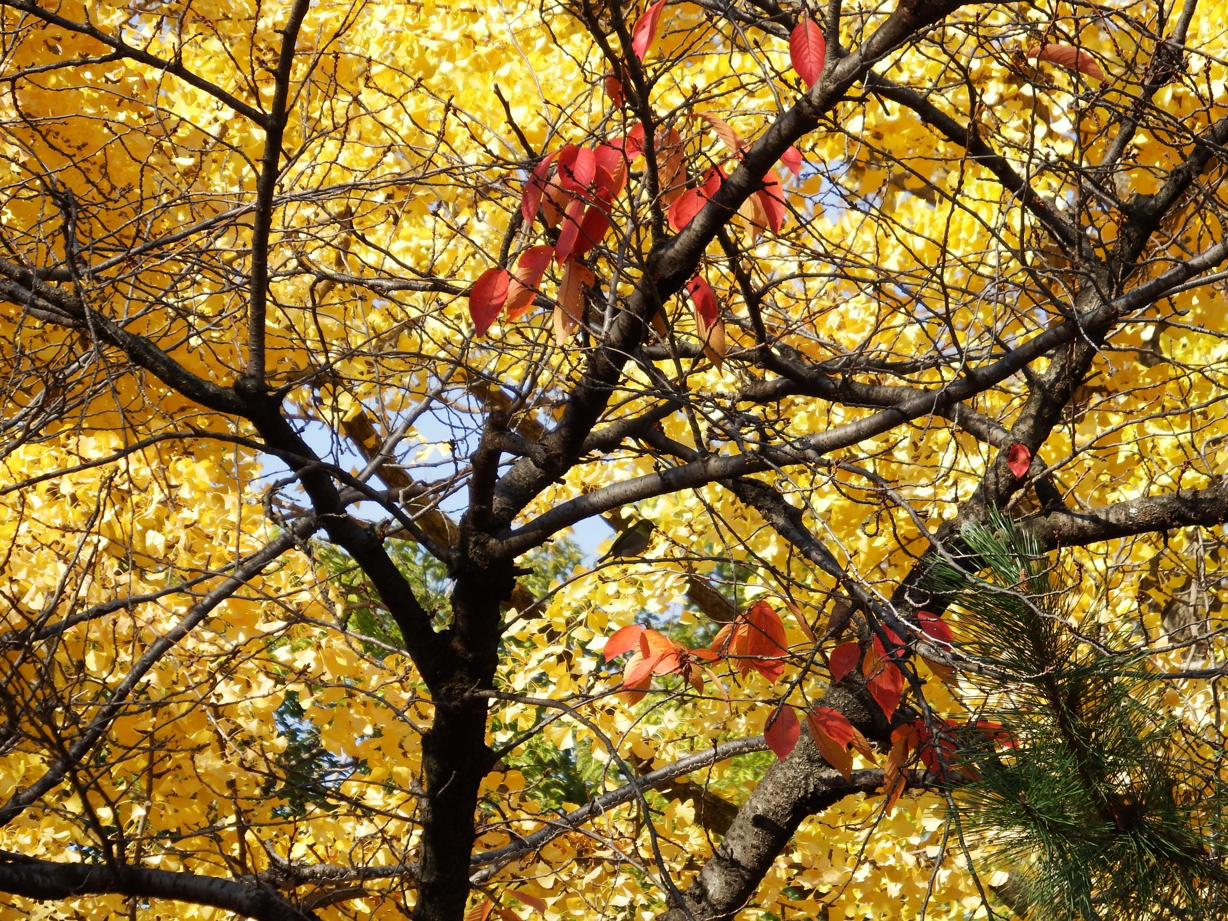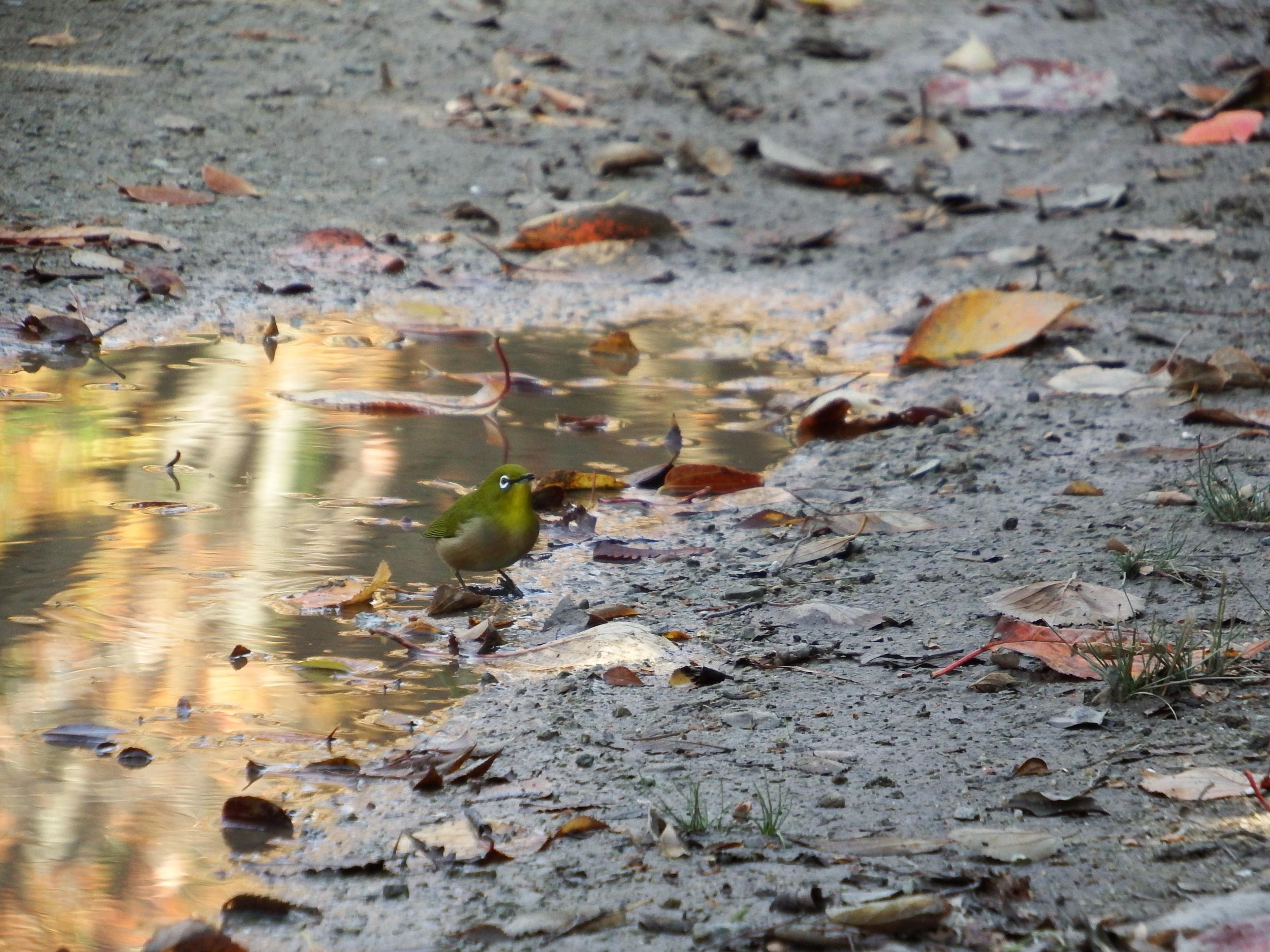 イチョウとメジロ、でも止まっているのは手前のサクラの木です。枯葉が舞う度に鳥と間違います。
