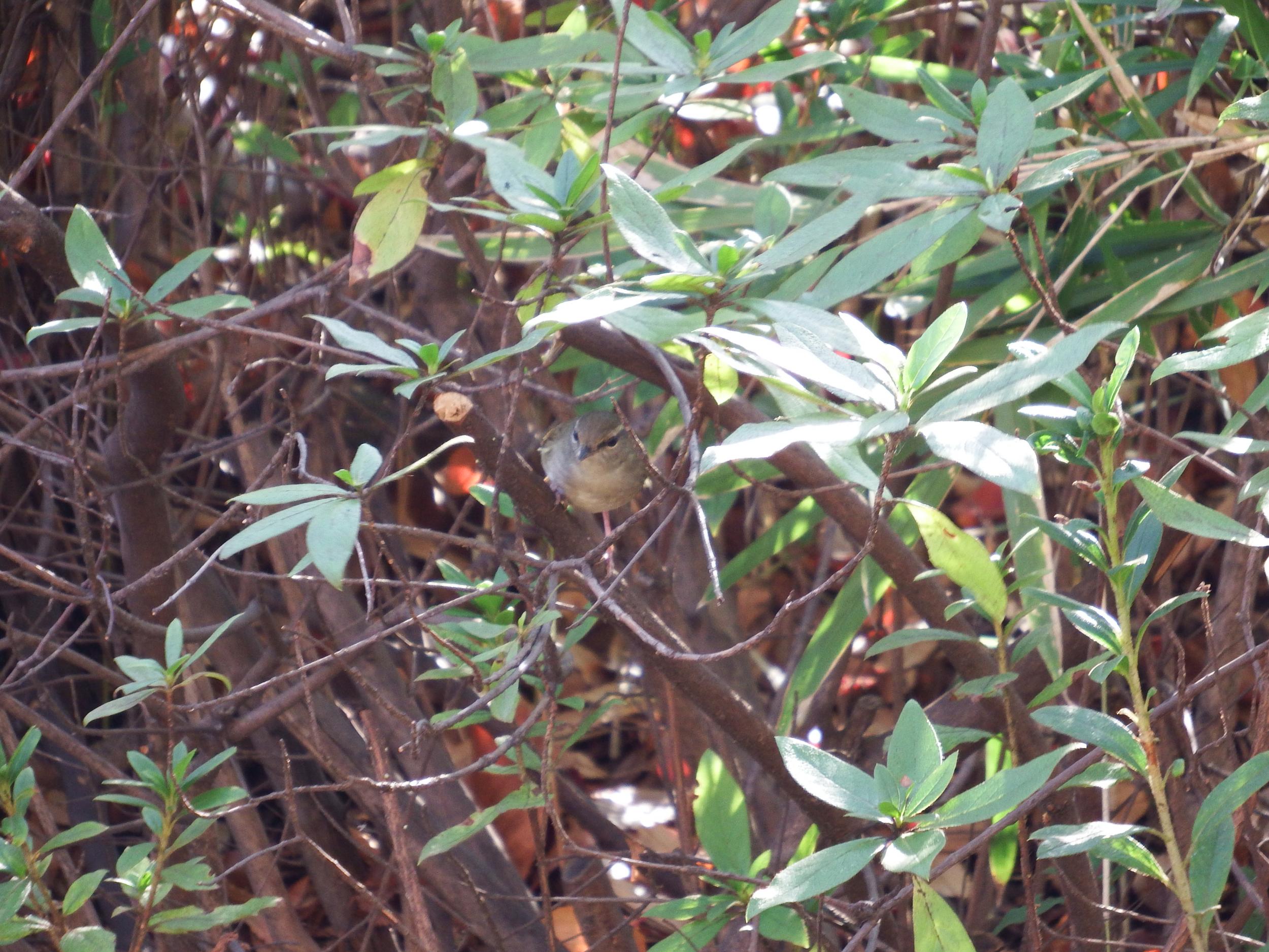 六番櫓近くの垣根からかなり大きな声でジッ、ジッ、ジッ、と地鳴きがしきりに聞こえてきます。ムシクイウグイスです。垣根の隙間を器用に飛び回っています。