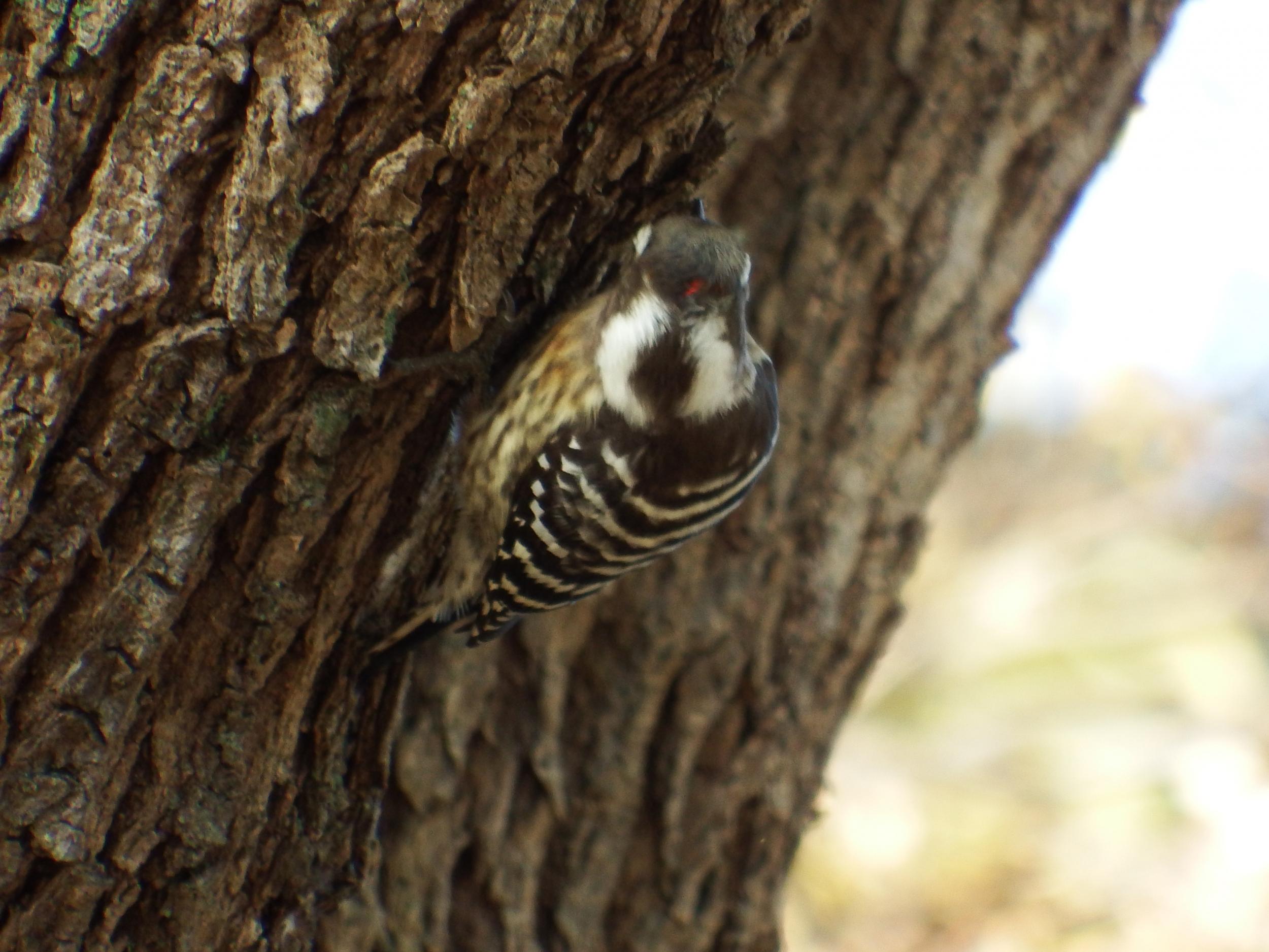 さっきのとは別のコゲラ、頭のてっぺんの赤い羽も見えます。あっ、瞬膜も写ってました。
