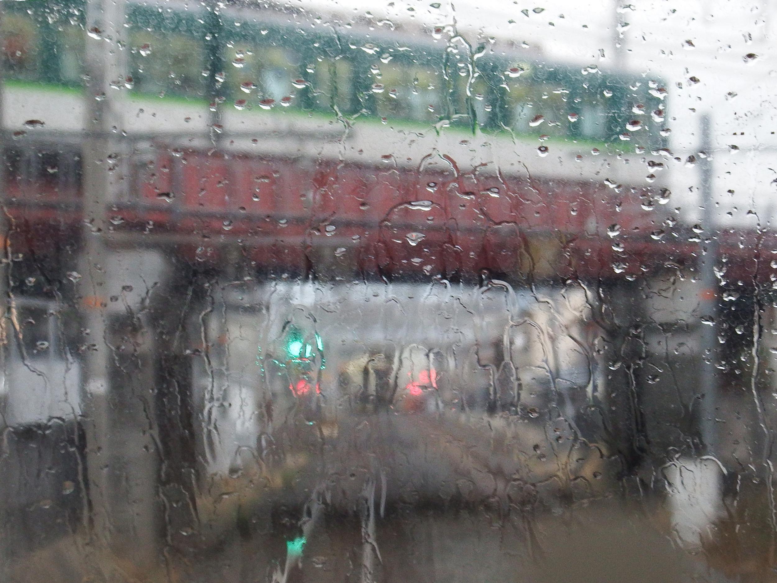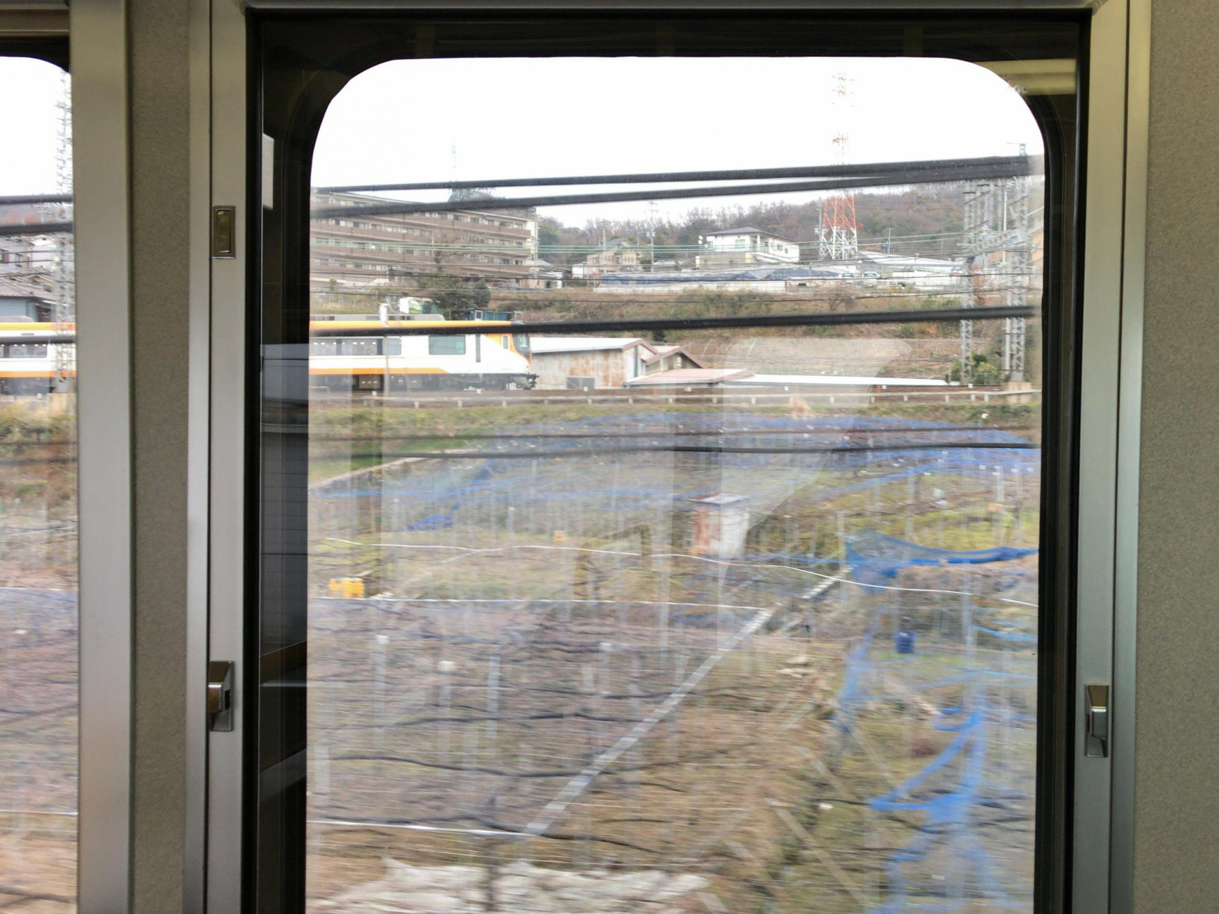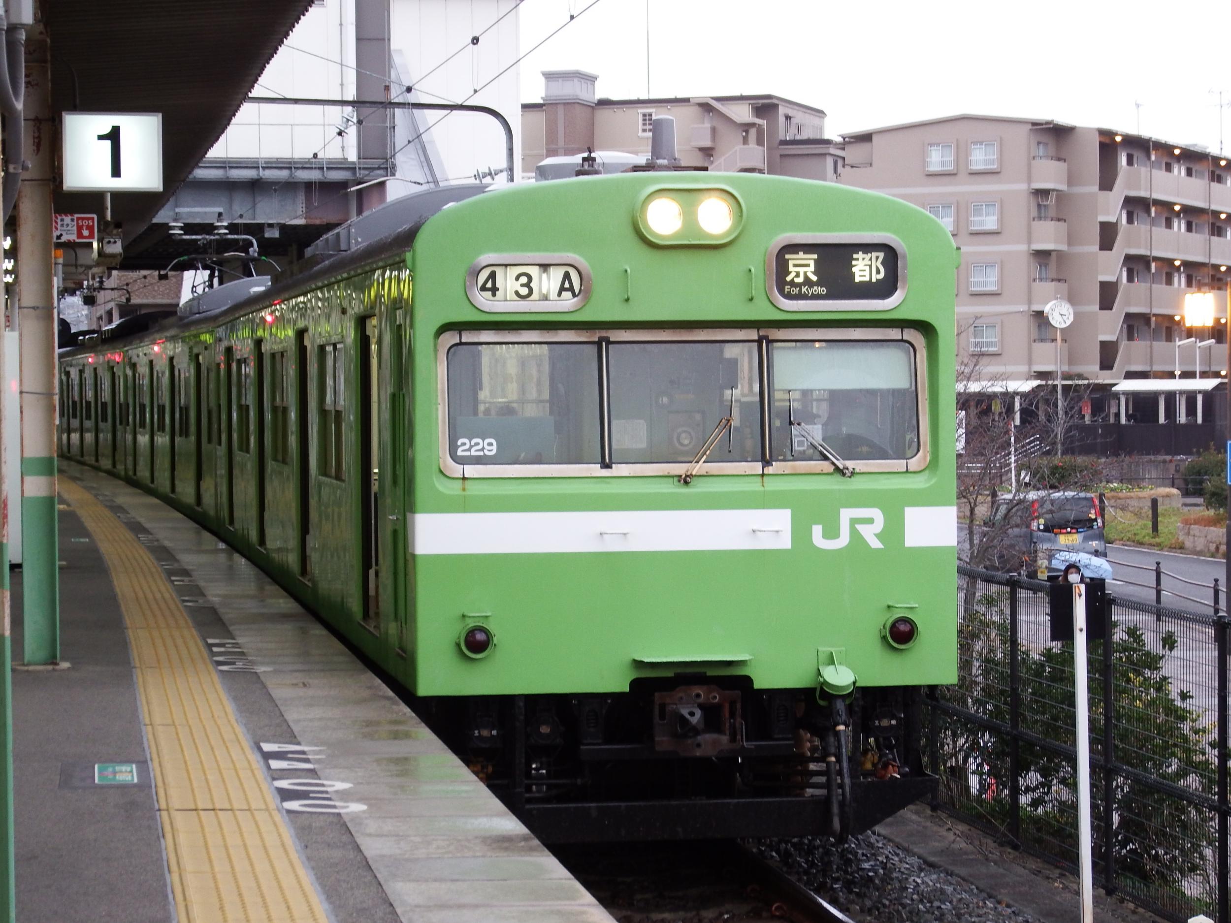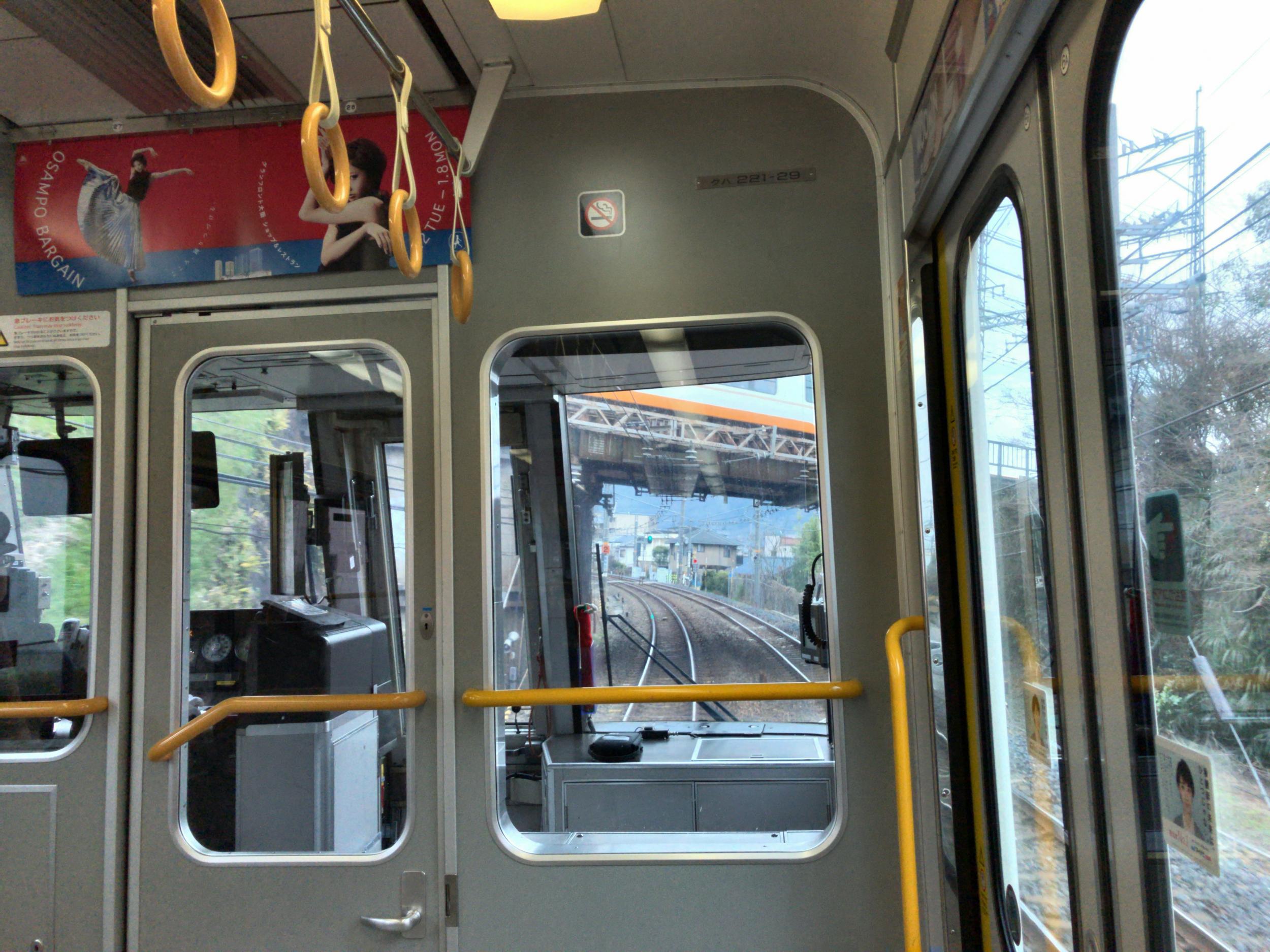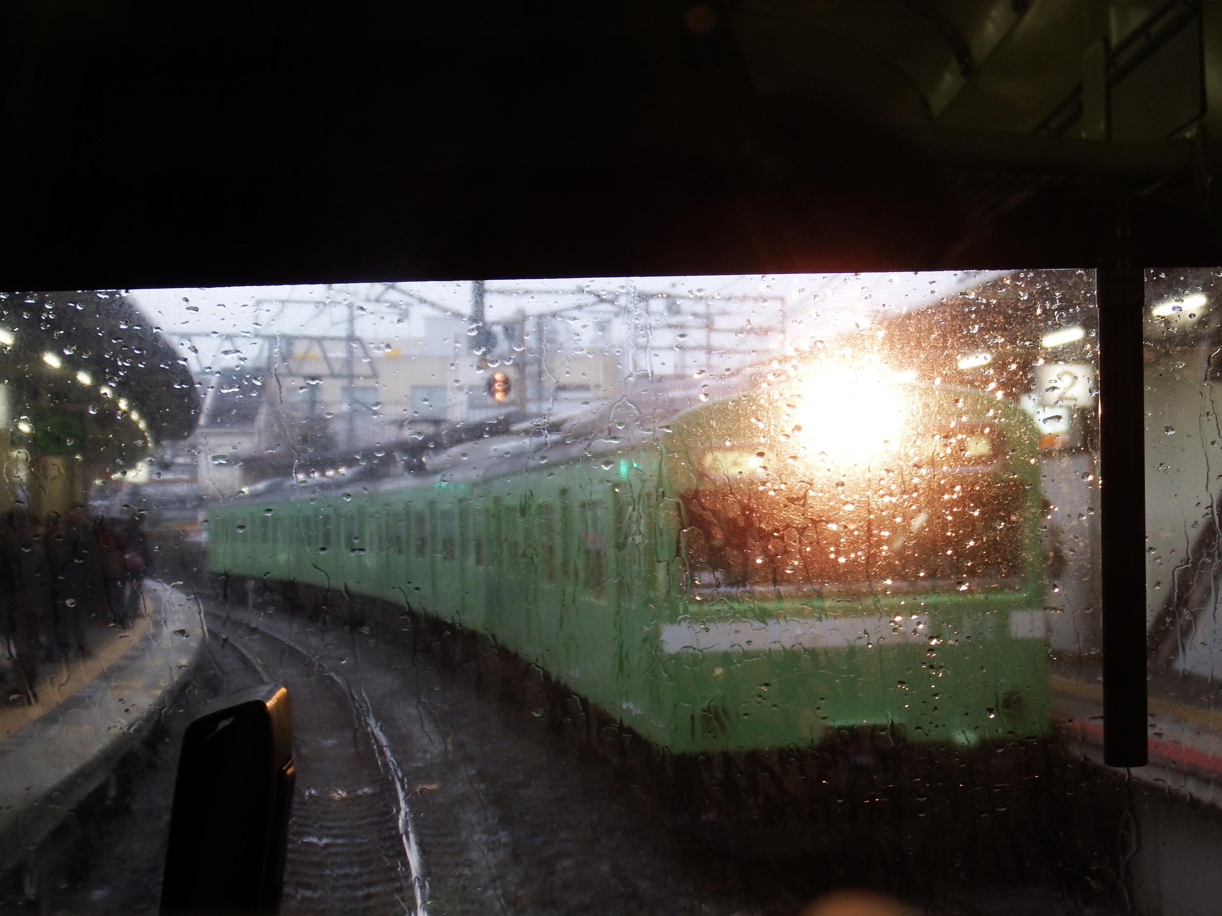阪和線の103系にはなかった液晶のモニタが追加されています。雨が降ってきました。しばらく京阪宇治線と並走して黄檗に到着。
