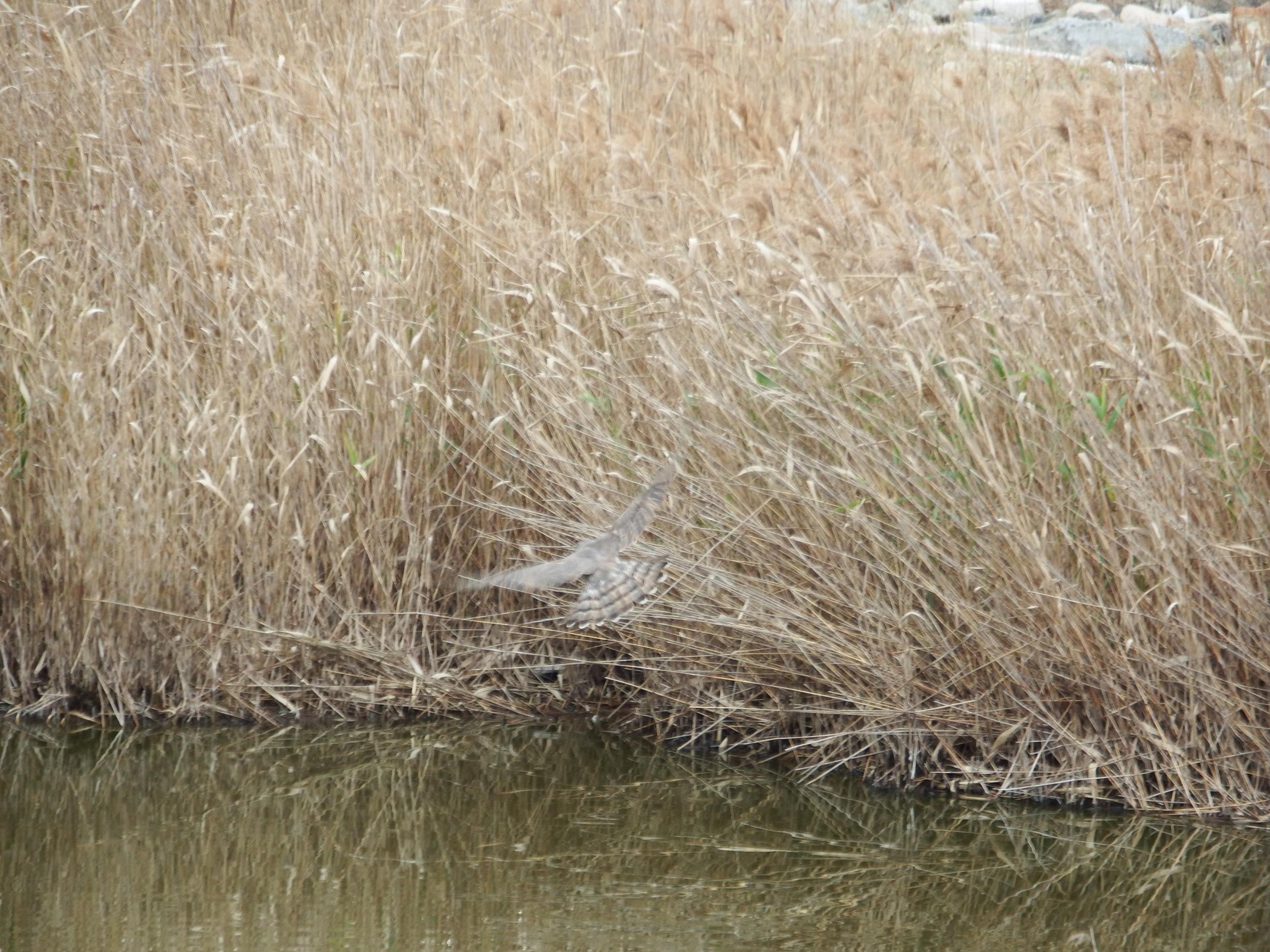 南池のヨシ原の陰にオオタカ。時々池のオオバンの上を旋回するのですが、狩りをしているシリアスさが感じられないです。