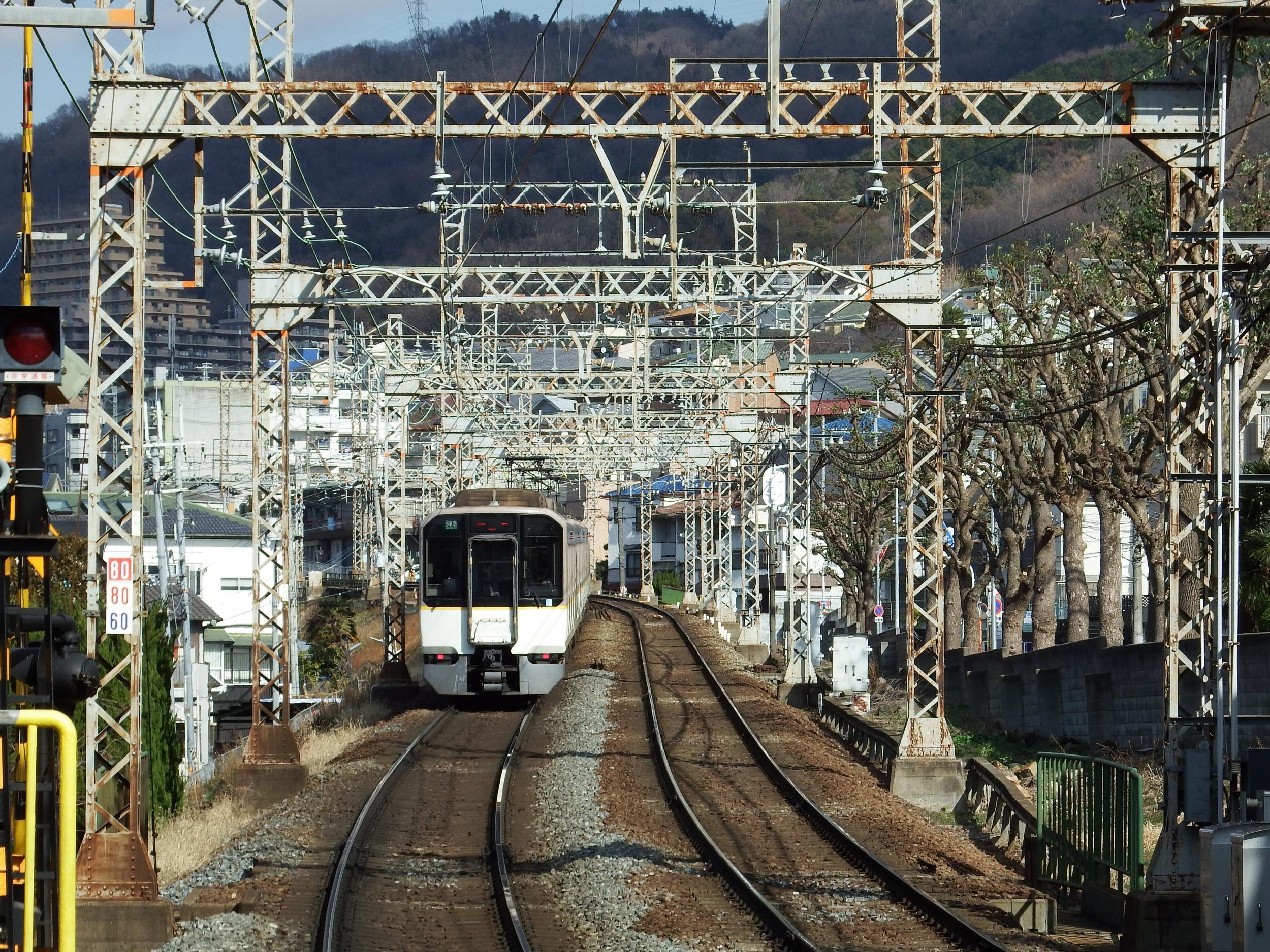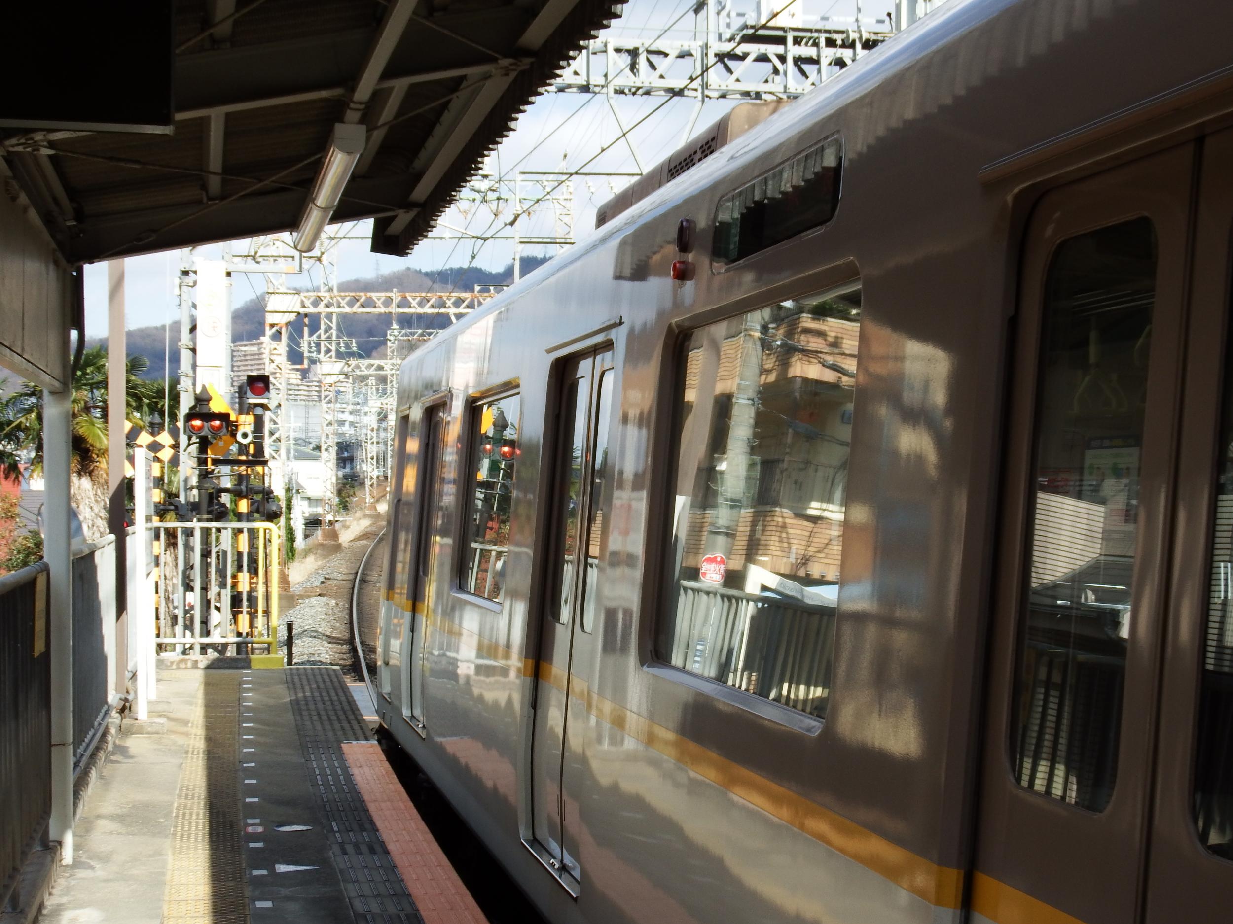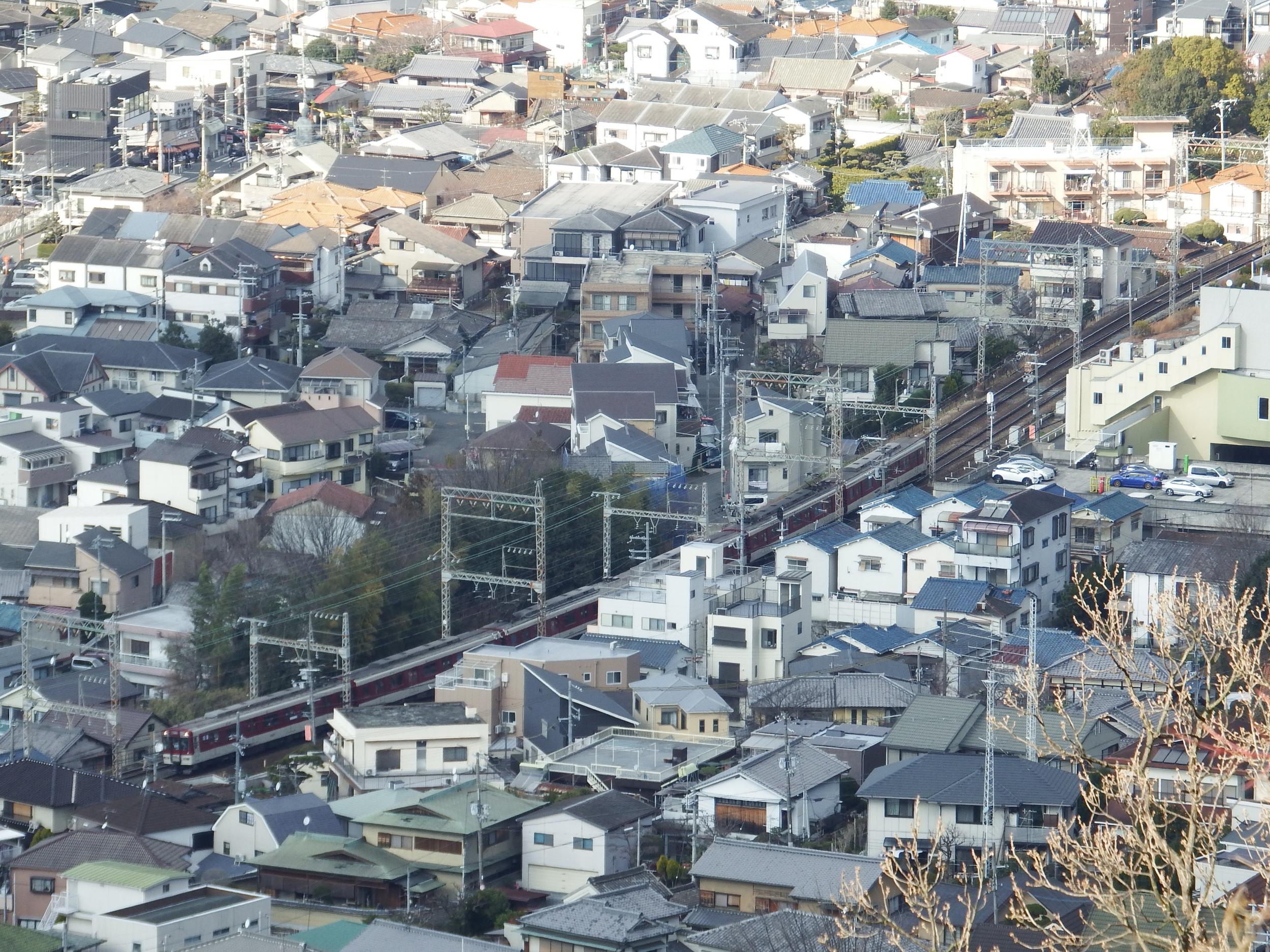額田山展望台にやってきました。下界を行く8連は奈良行急行、6連は神戸三宮行快速急行。