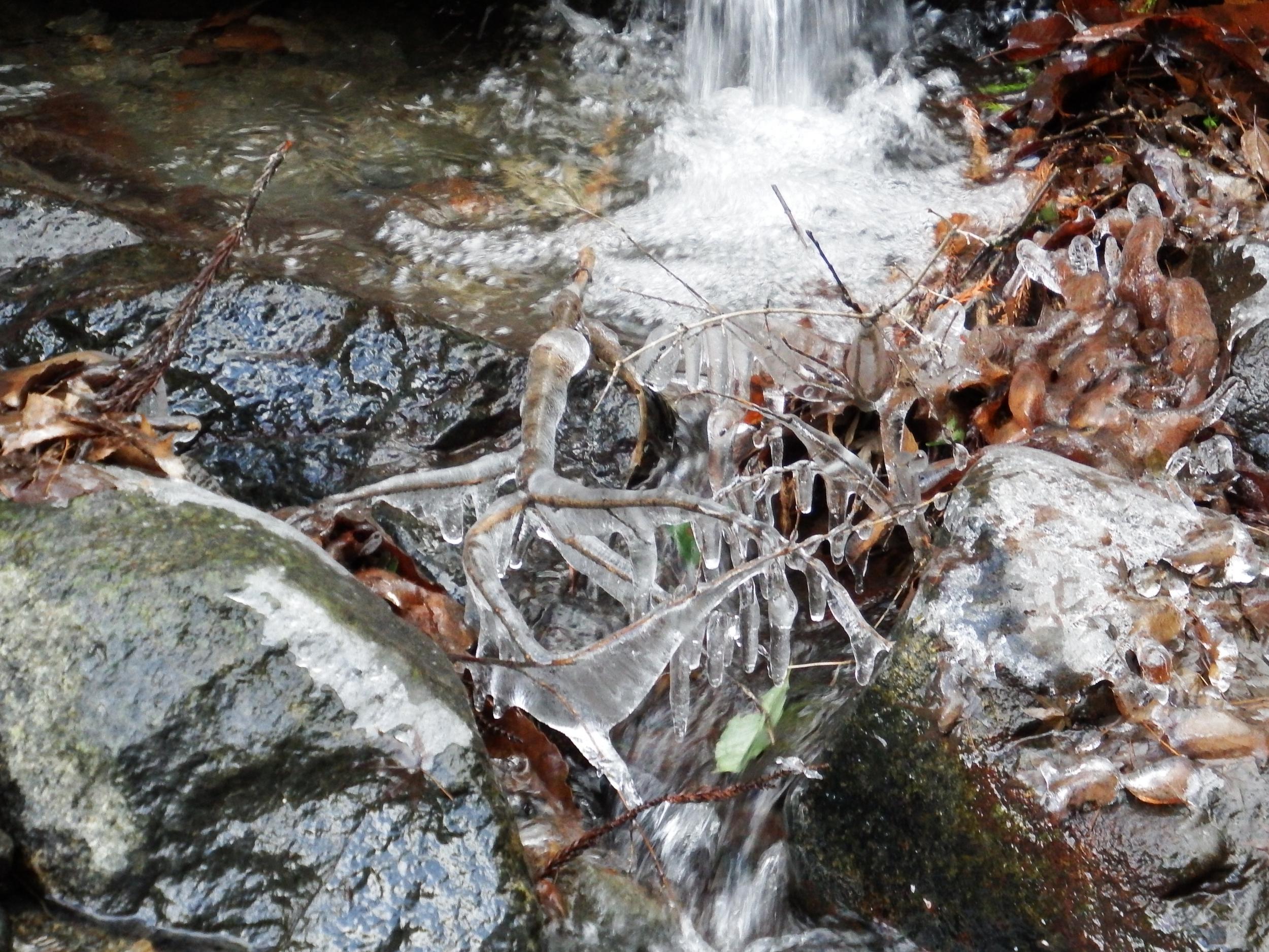 椋ケ根橋から豊浦橋へ渓流沿いを行くと不思議な光景。豊浦川の流れの岩に引っかかった木の枝が凍っています。どうしてこんな凍り方ができるのか、たぶん木の枝に積もった雪が氷になったんではないでしょうか。