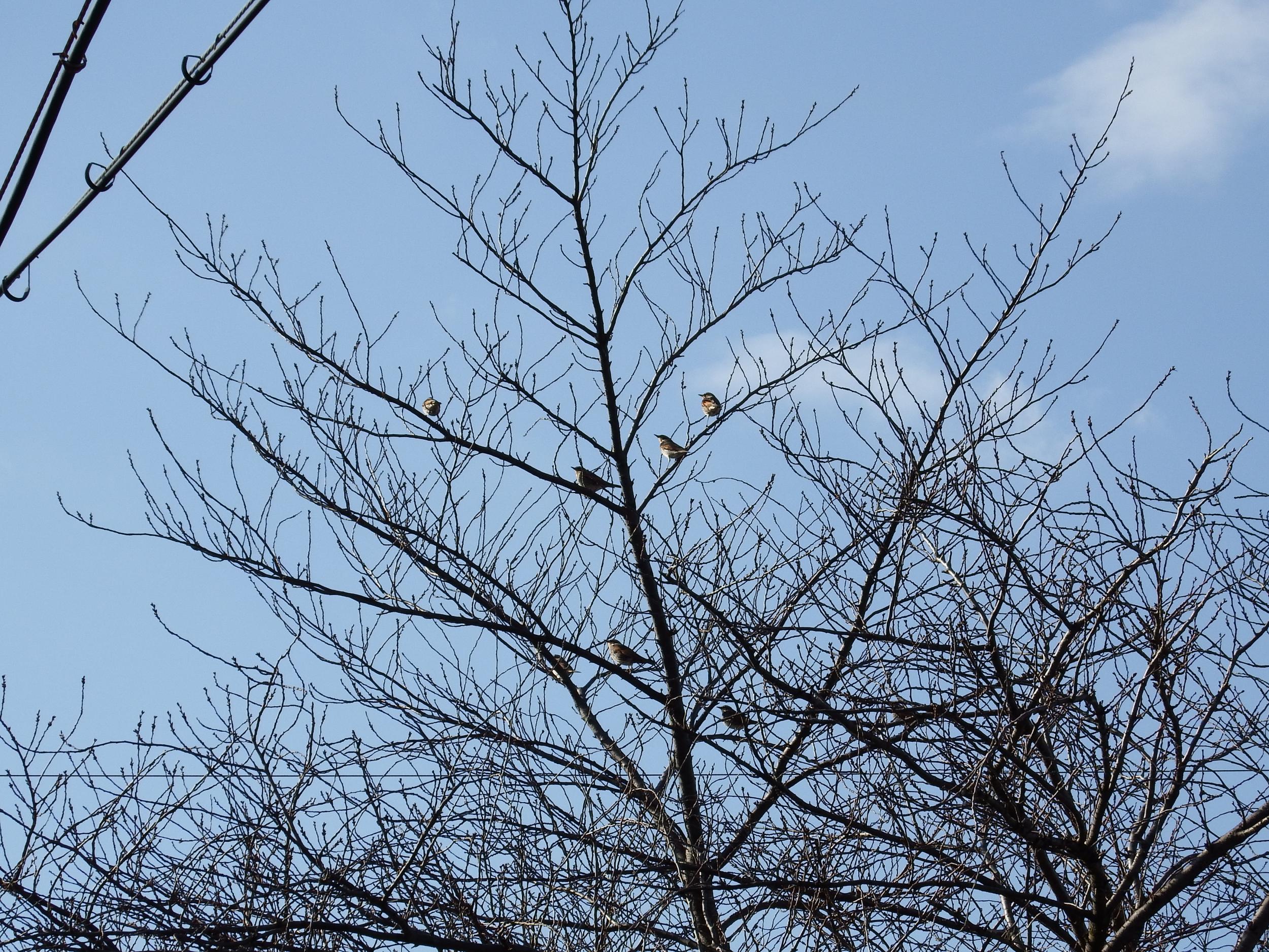 額田駅まで下りてきました。駅前の桜の大木にツグミが8羽。