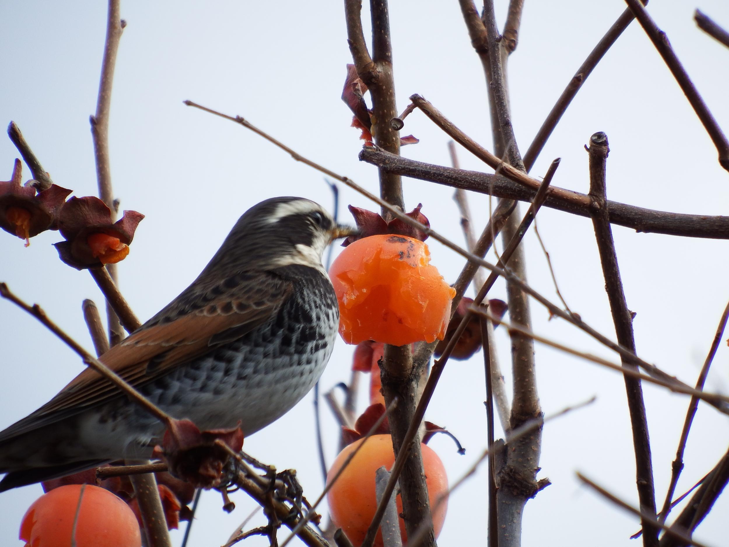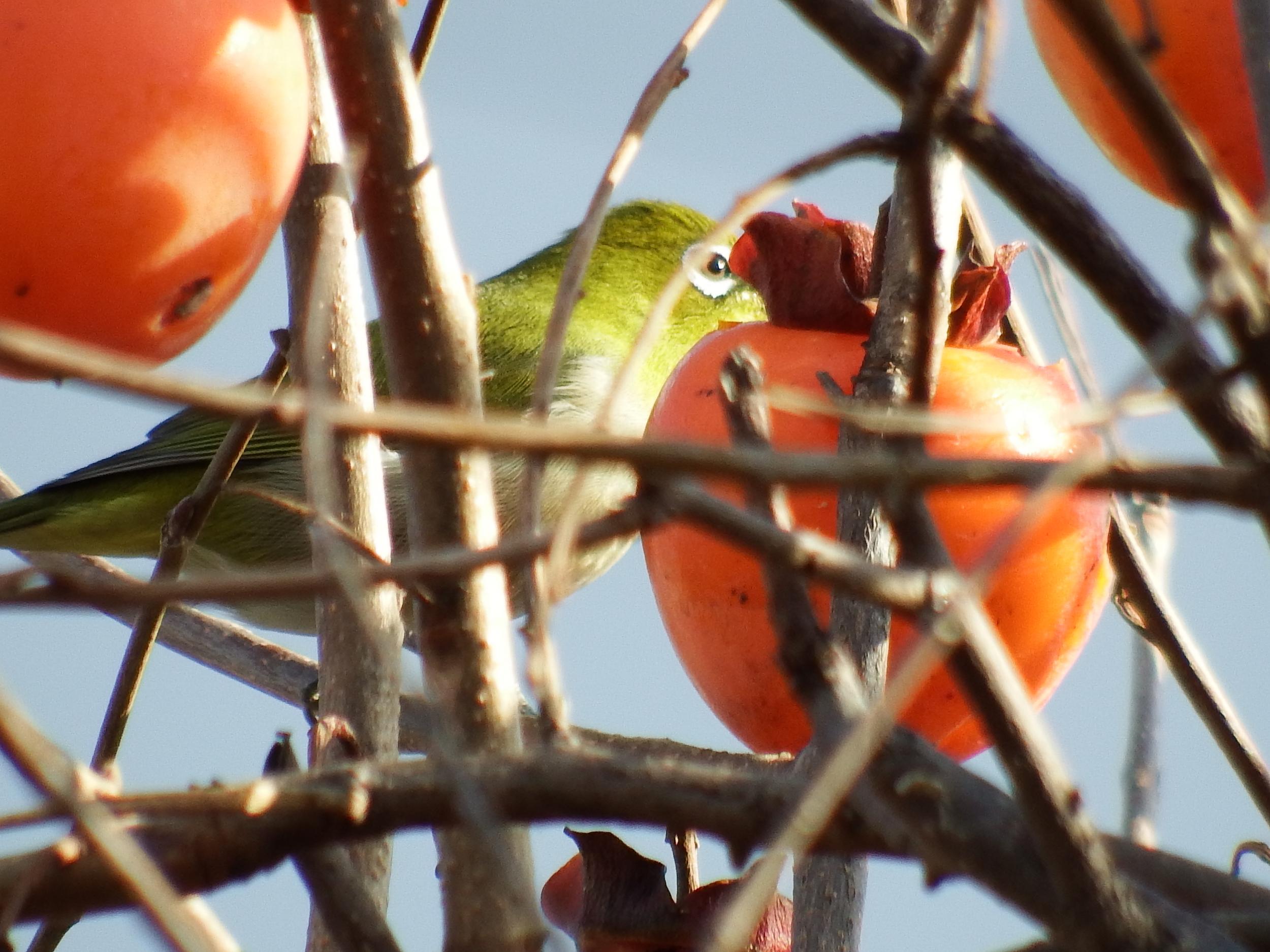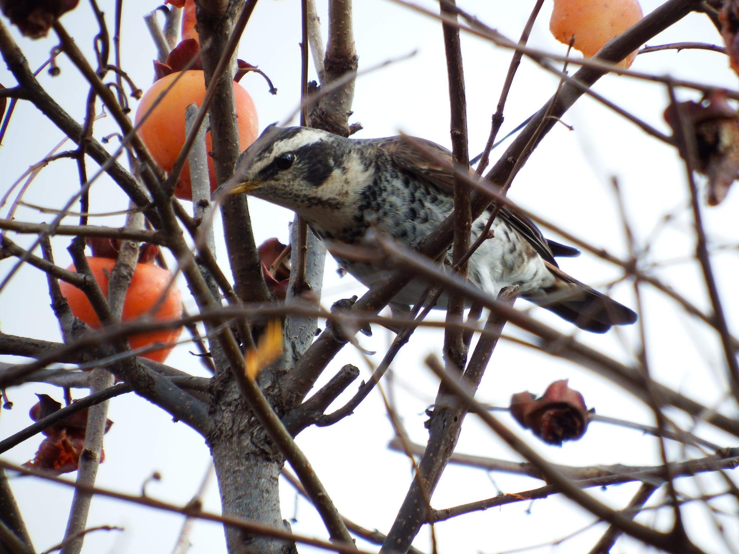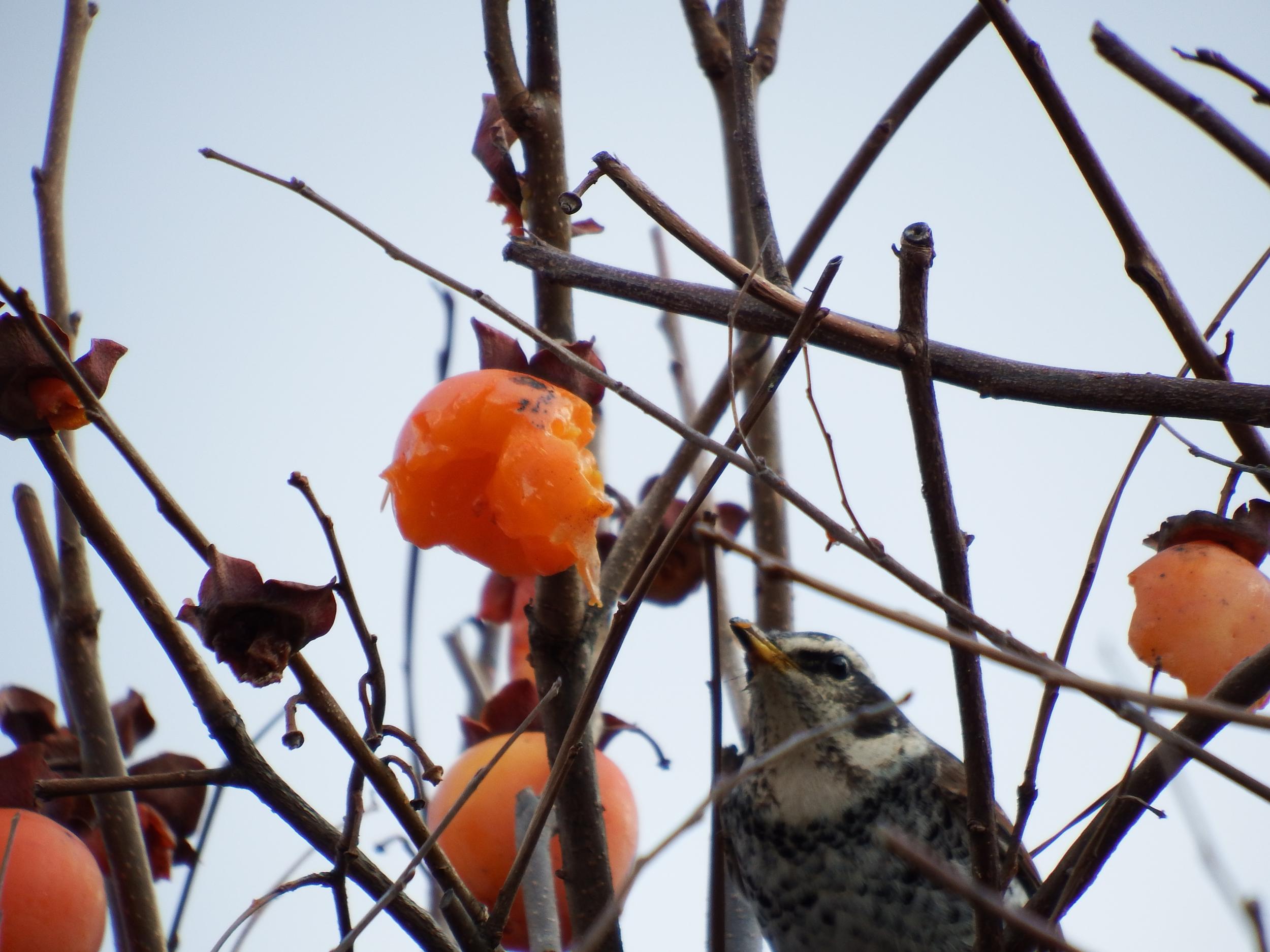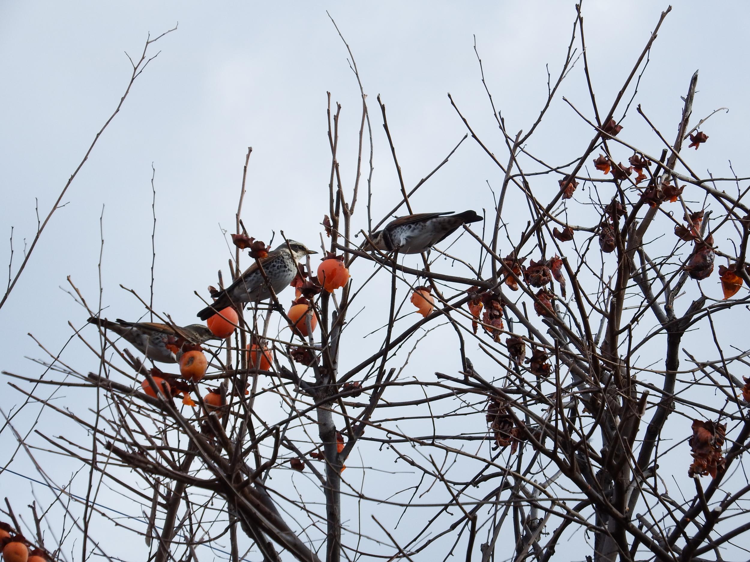 駅前のクリーニング屋さんの工場の柿の木にツグミがいっぱい、メジロも混じっています。