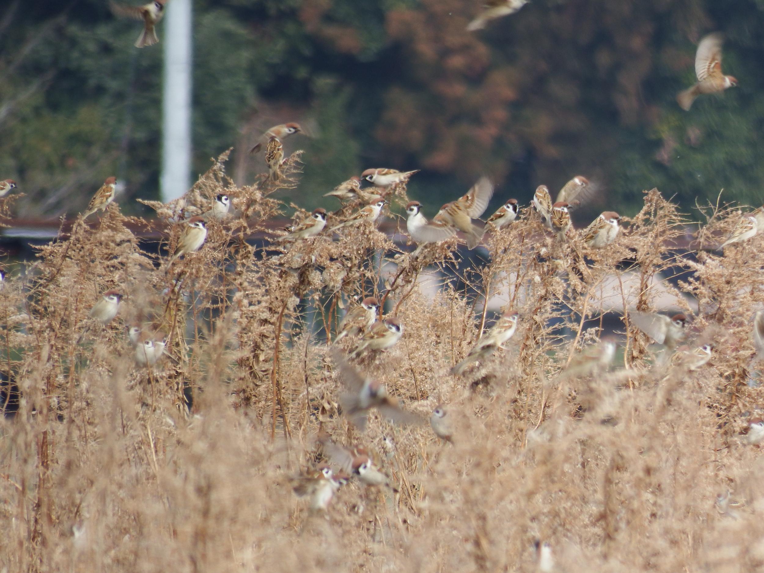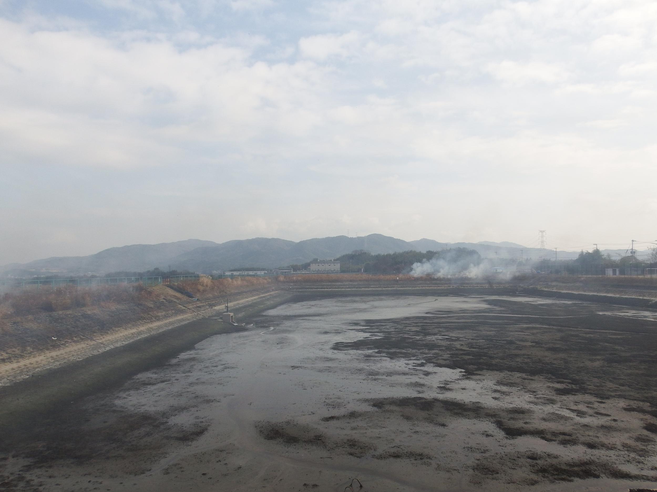 五の坪池も一丁田池も野焼きで煙に包まれていました。煙いからか焼き鳥になるのを恐れてかチドリたちも見つかりません。池周辺の田んぼもスズメの大軍団がいるばかり。