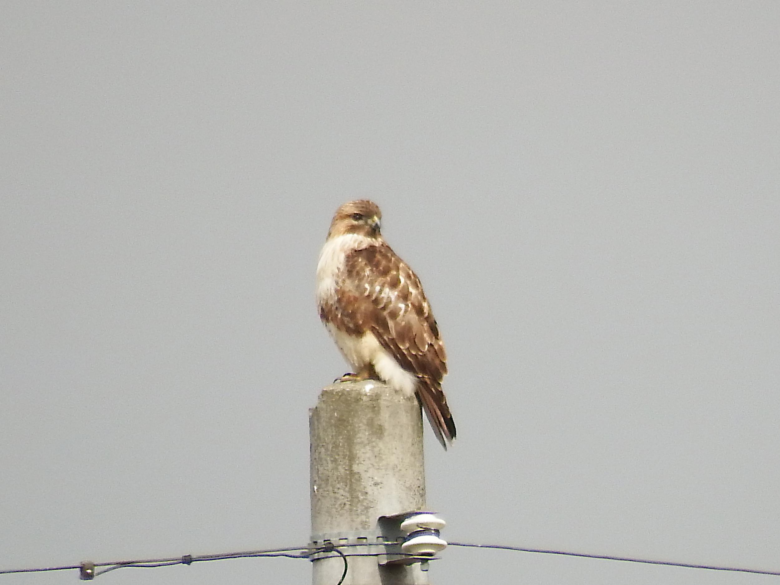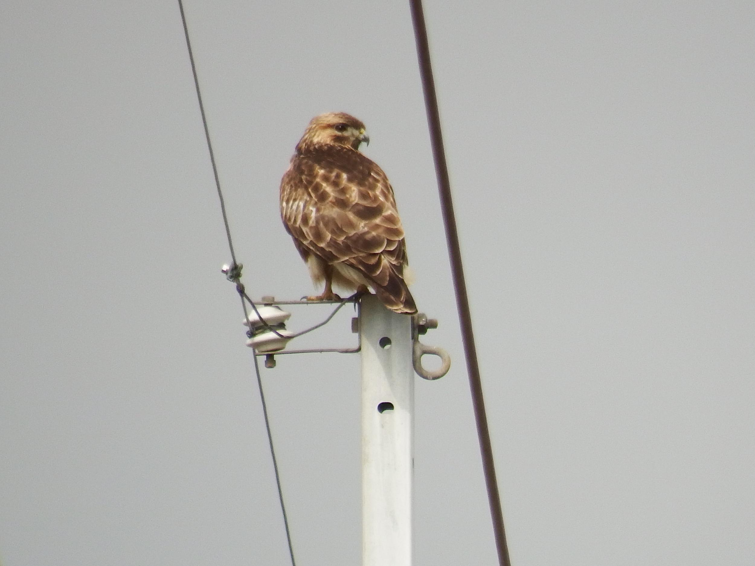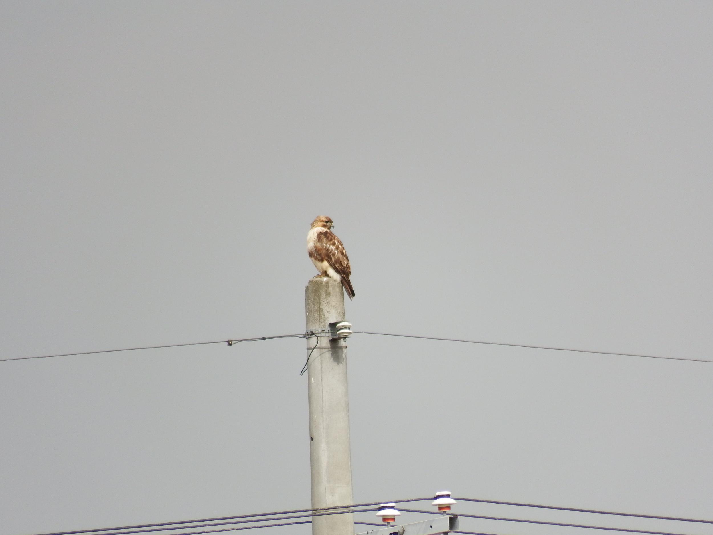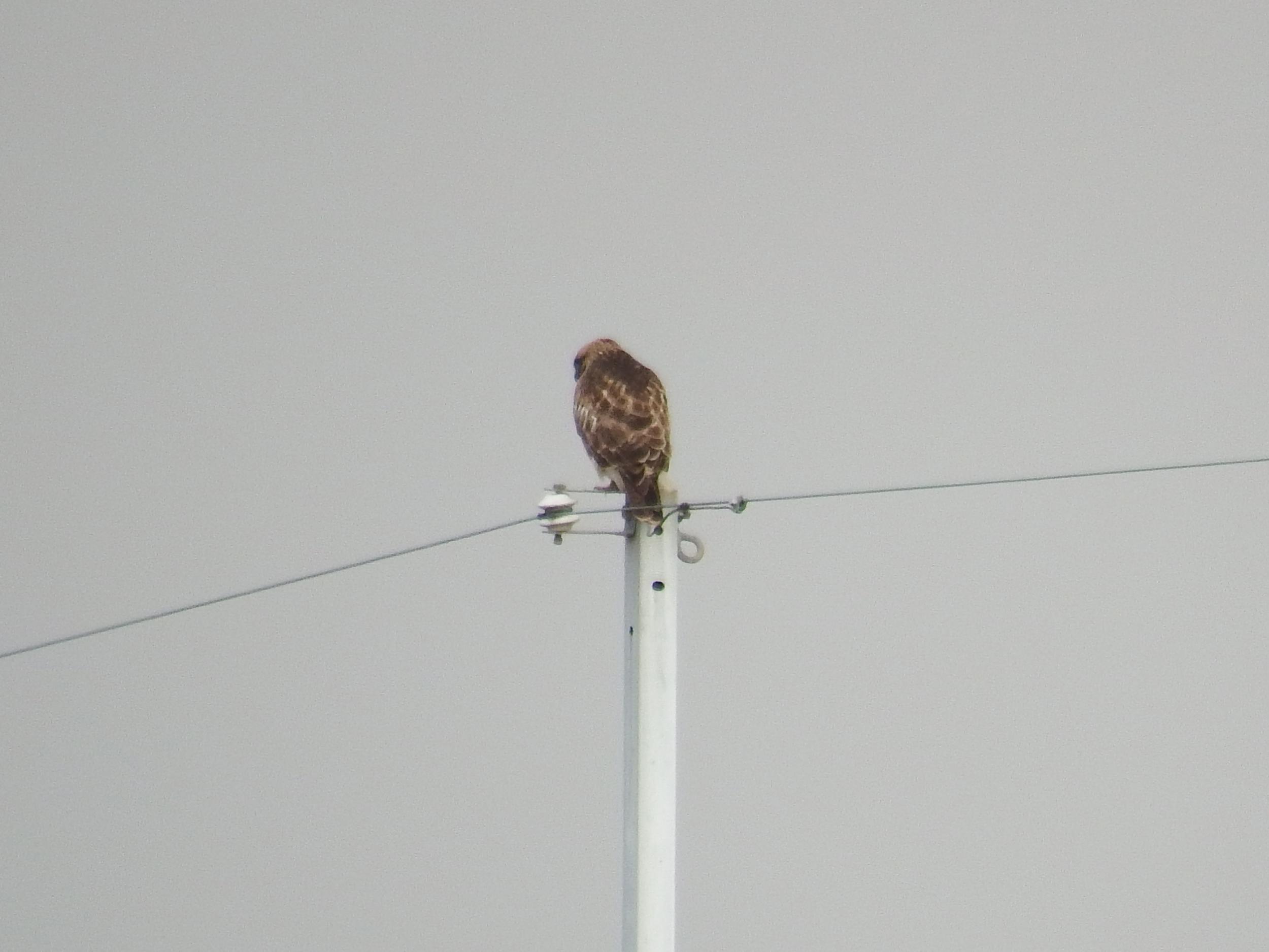 電柱にノスリ、後ろ姿はトビに似ていますが、トビより小柄、それに優しい目をしています。