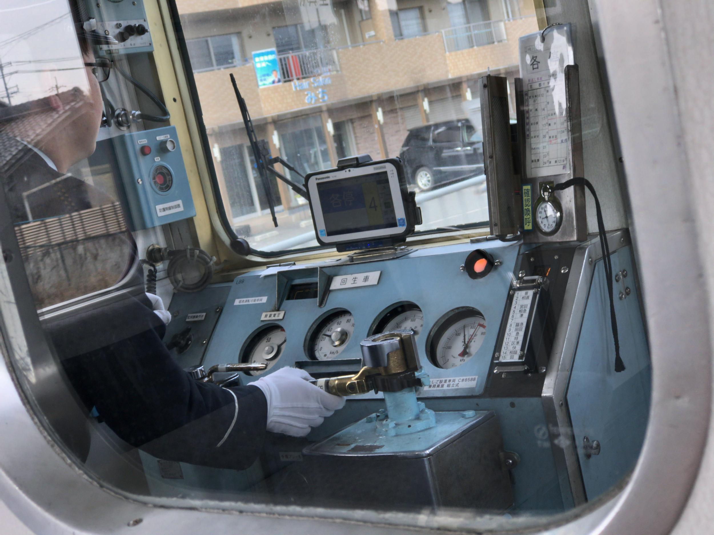 液晶モニタが取り付けられた以外50年間殆ど変化していないと思われる運転台です。興戸に到着。