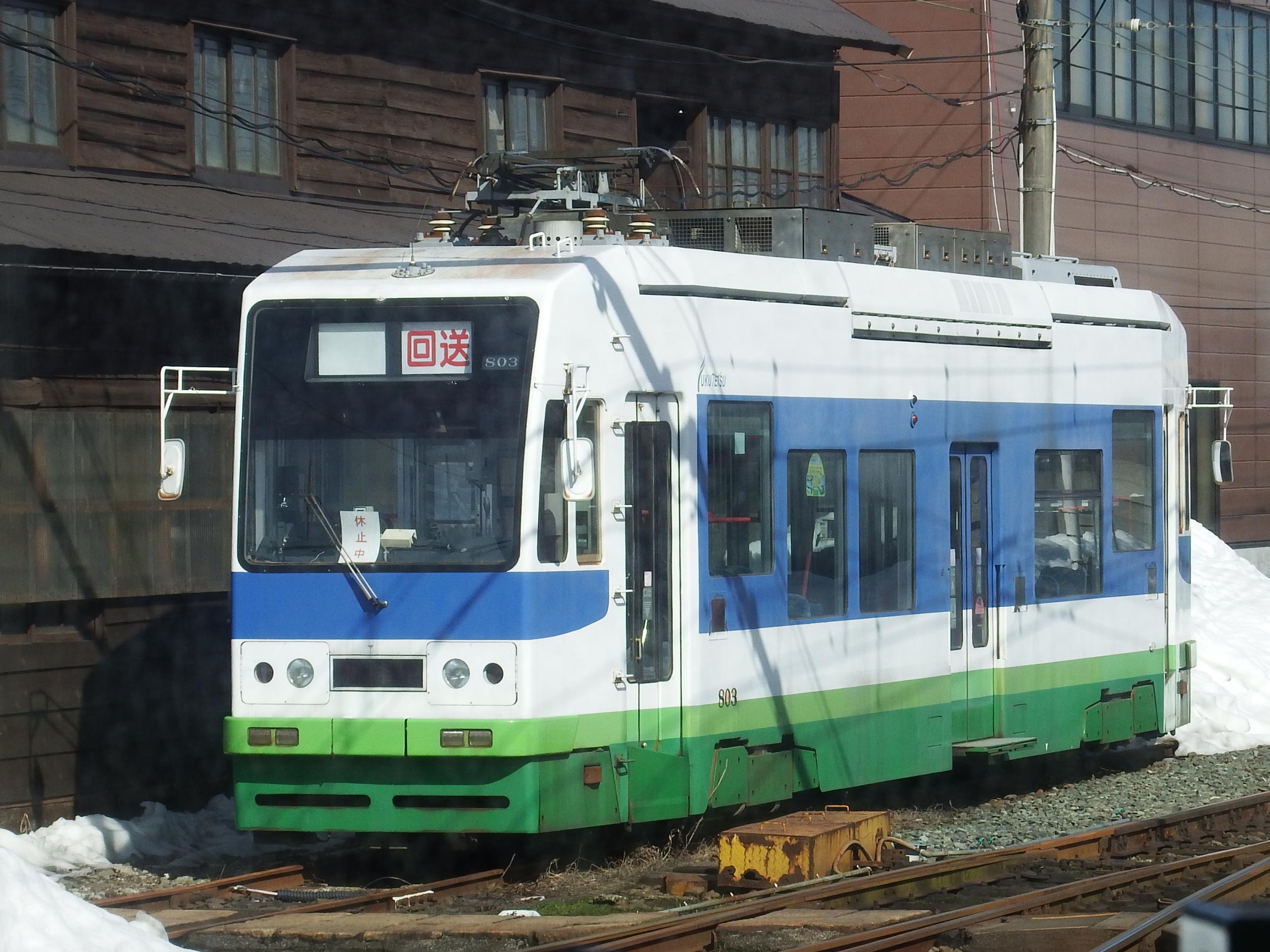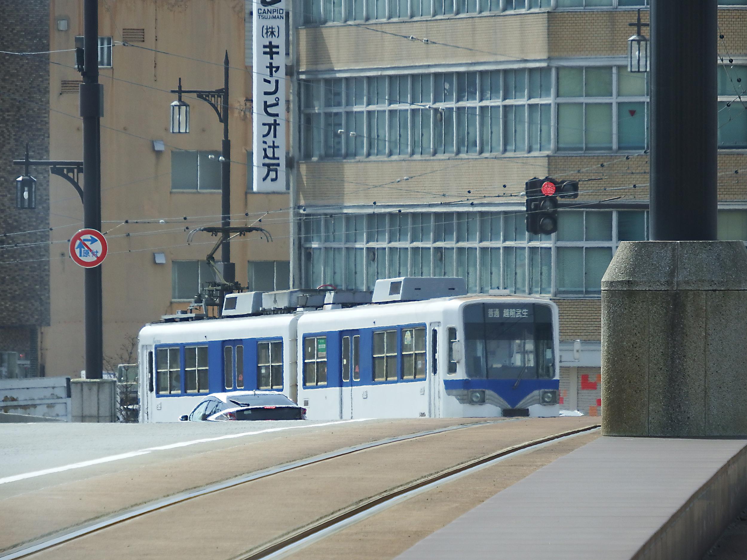 その先の800形は前面窓に休止中と張り紙。クロスシートの超低床車ですが、フクラムが4編成も導入されたので、出番が無くなったようです。名鉄美濃町線でモ600を置き換え冷房化バリアフリー化対応した複電圧車で国産初の超低床車、廃車するにはあまりにももったいない車両です。