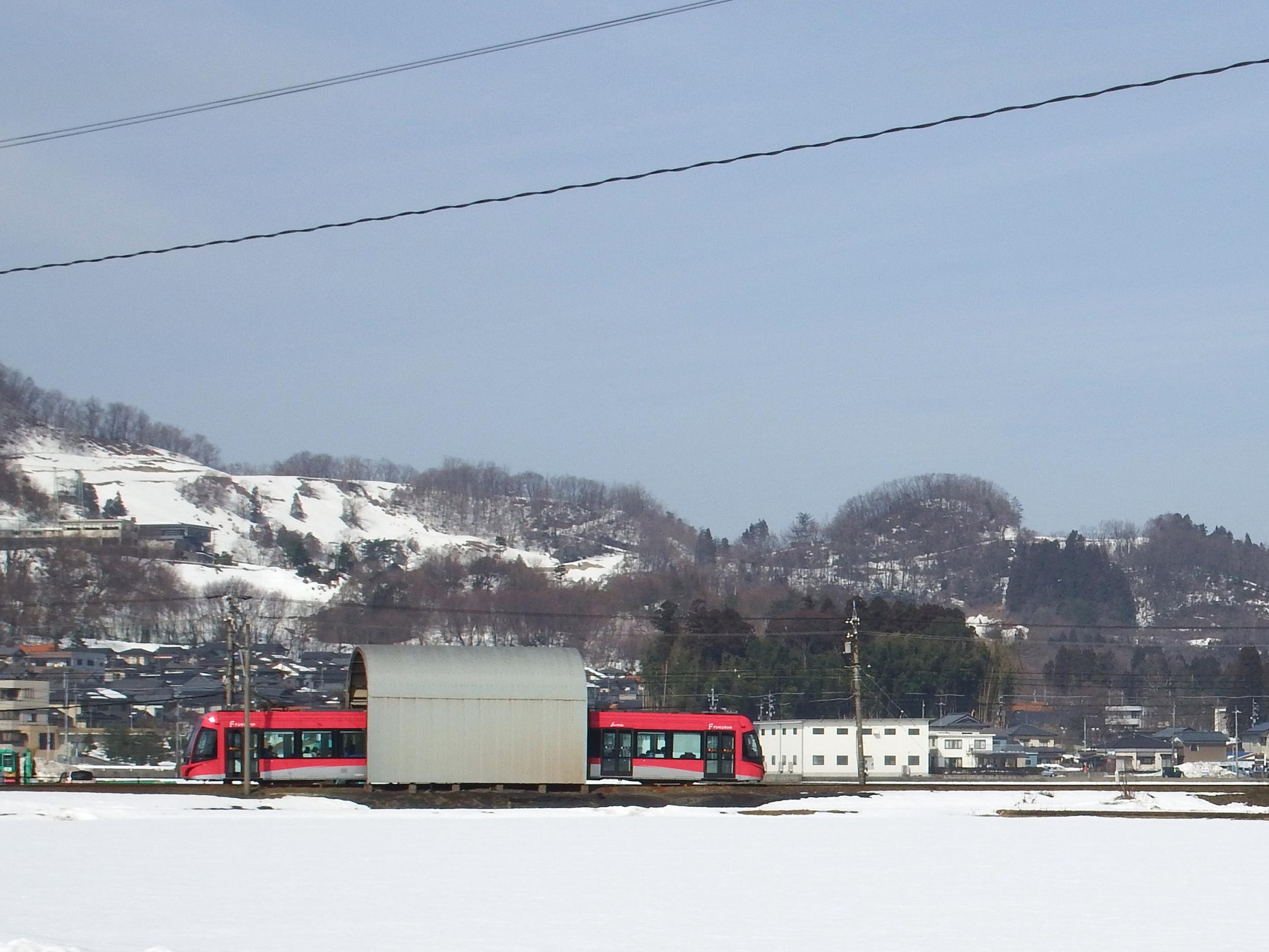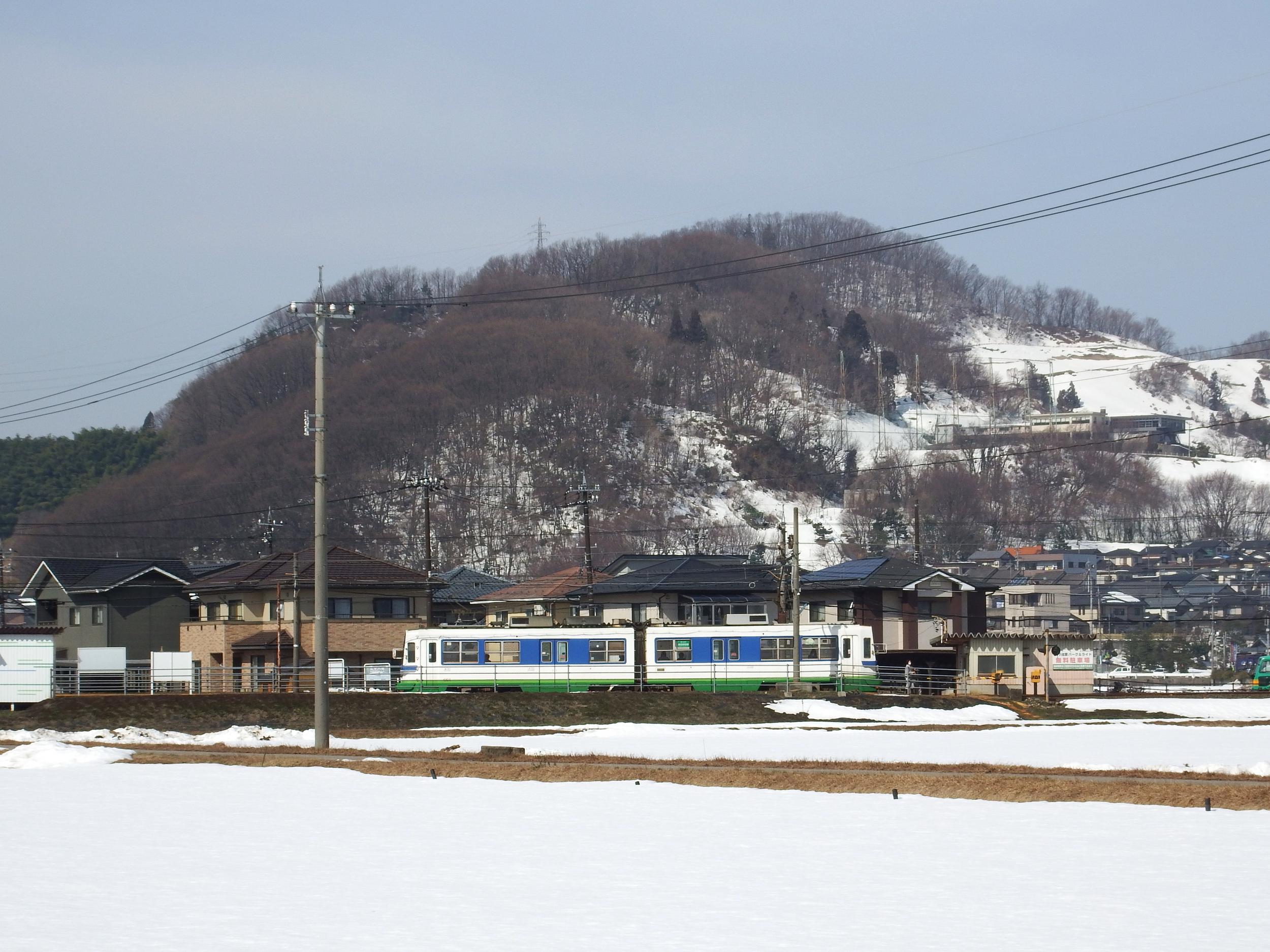 最初の目的地、三十八社駅に到着、田んぼは真っ白。駅西側でキーボを狙うも逆光で駅東側へ移動。F1000形のフクラムさくら色がやってきました。急行なので三十八社は通過、ポイントをカバーするトンネルを抜けていきます。