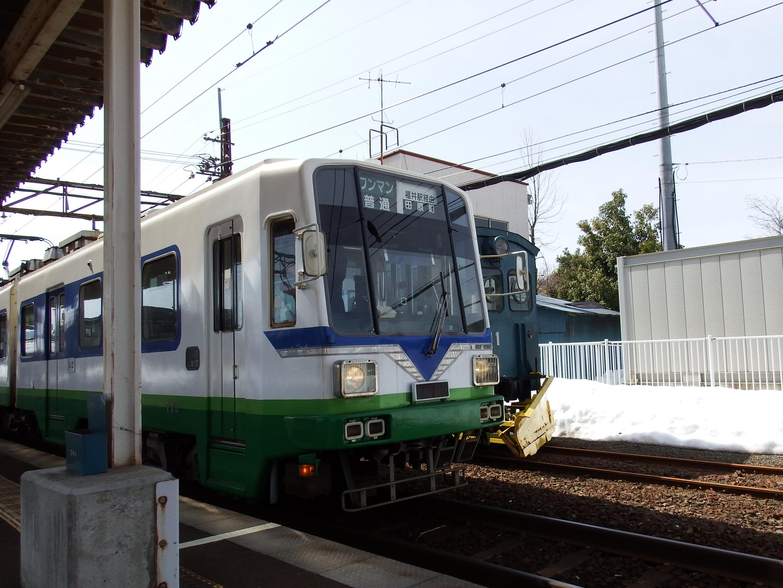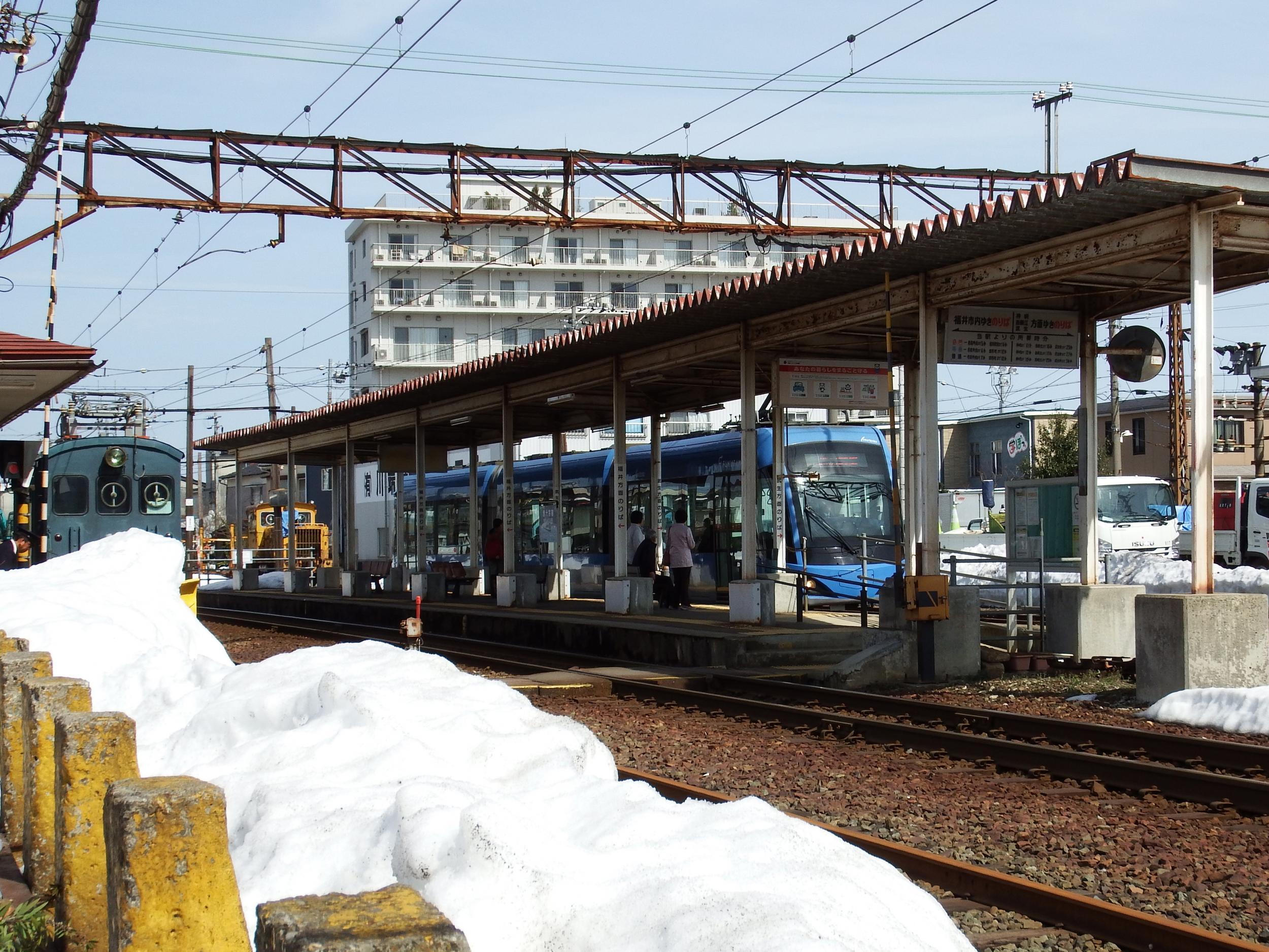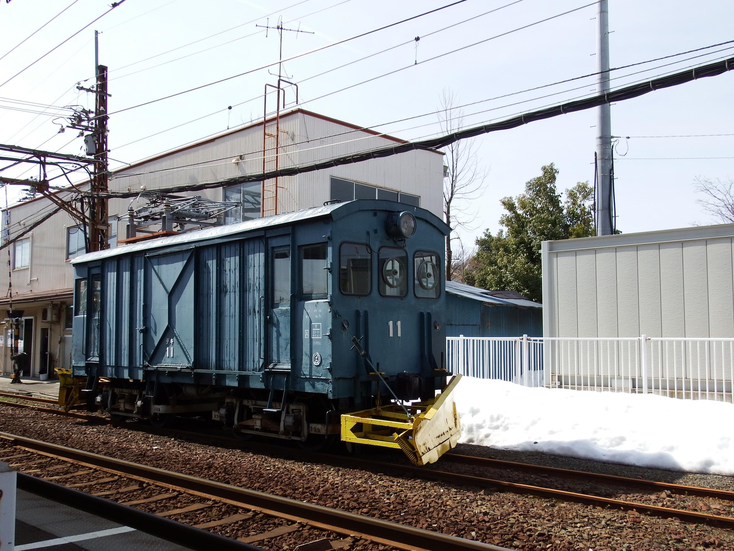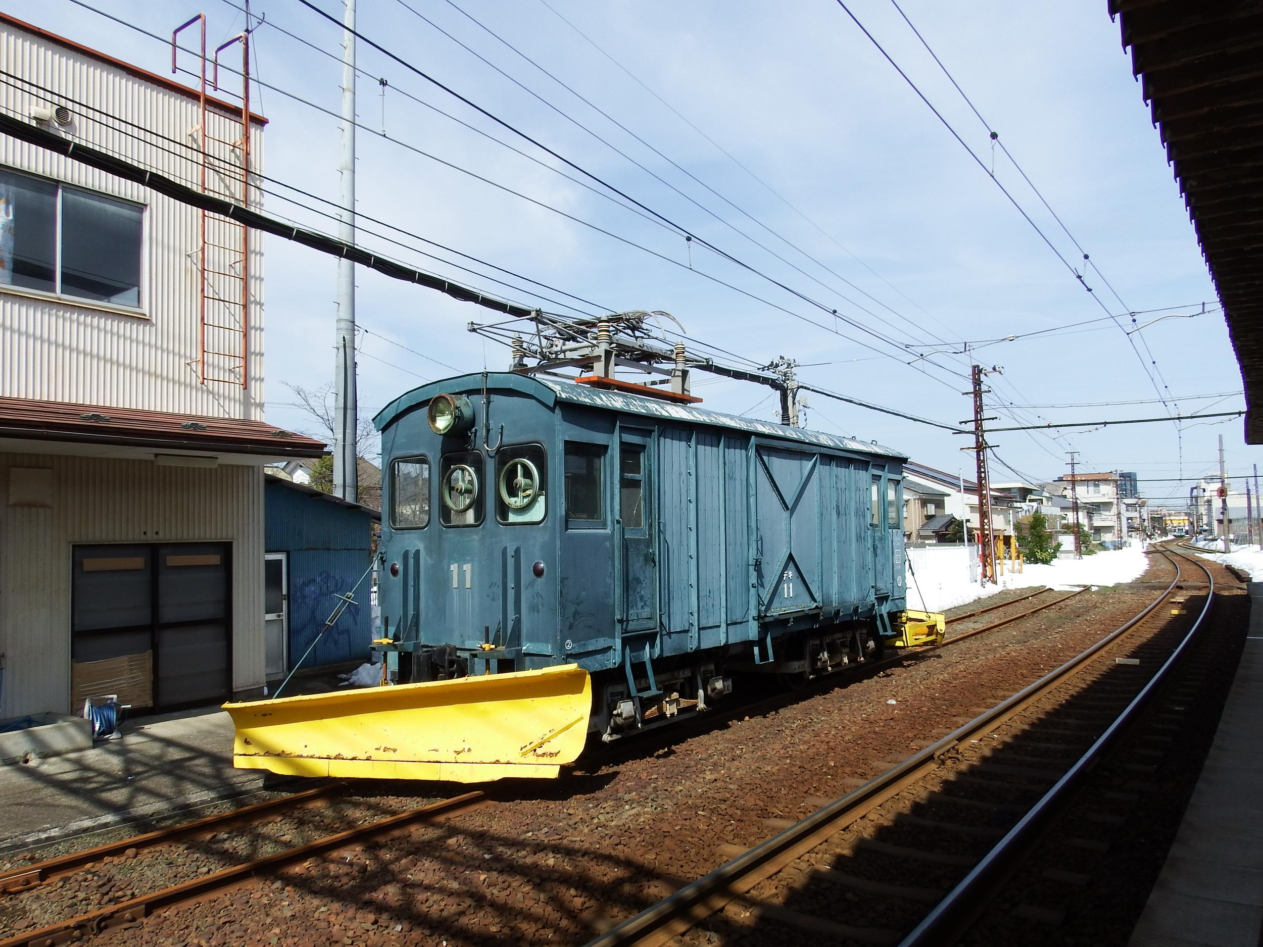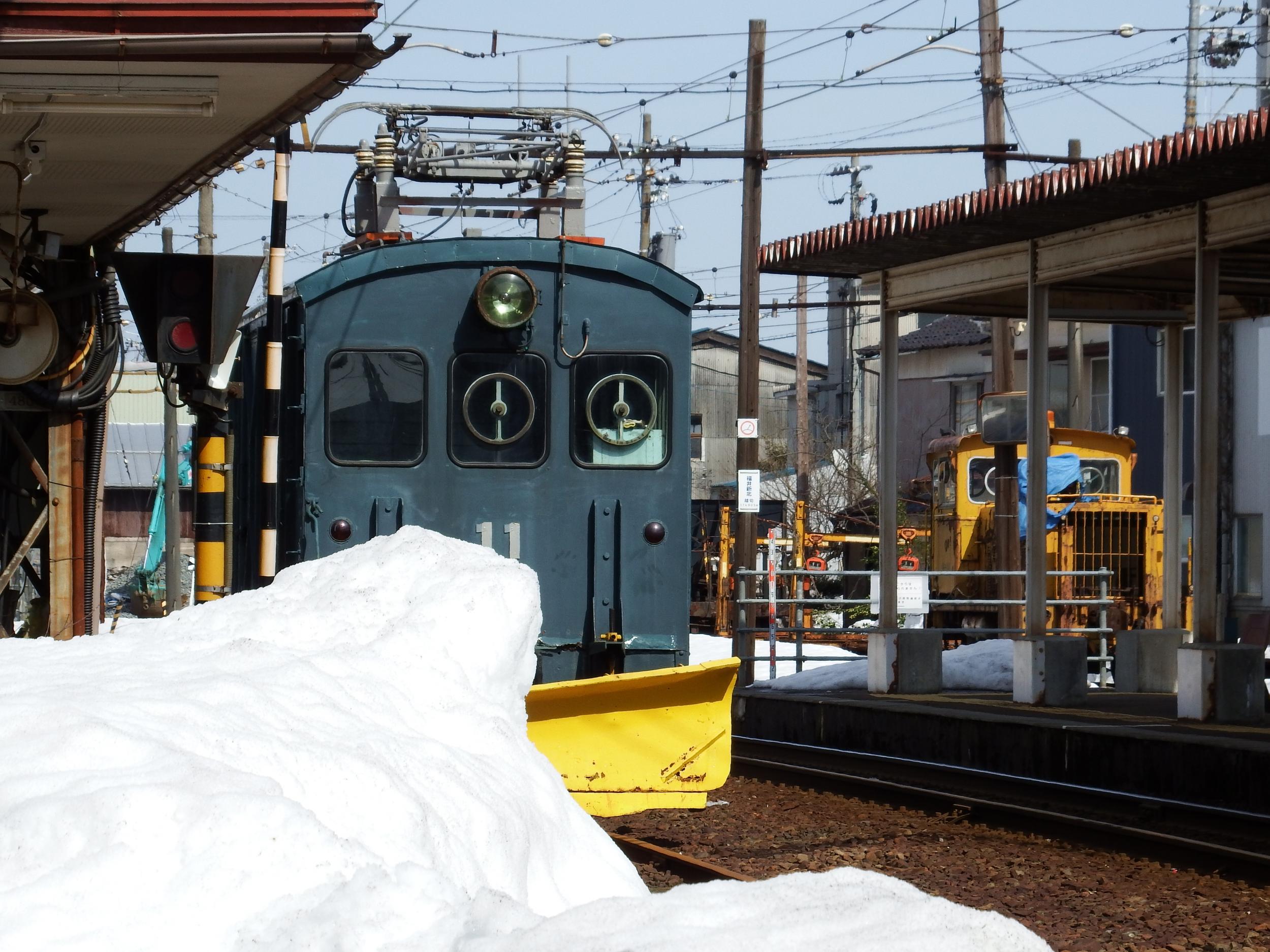 赤十字前に到着、駅の外れの留置線に保線車両と並んでいるはずのデキ11が見当たらず一瞬焦ったものの、880形が出ていくと目の前の駅舎前に留置されていてビックリ。2月の豪雪では大活躍、またいつでも出動できるようにスタンバイしているようで、じっくり観察できました。