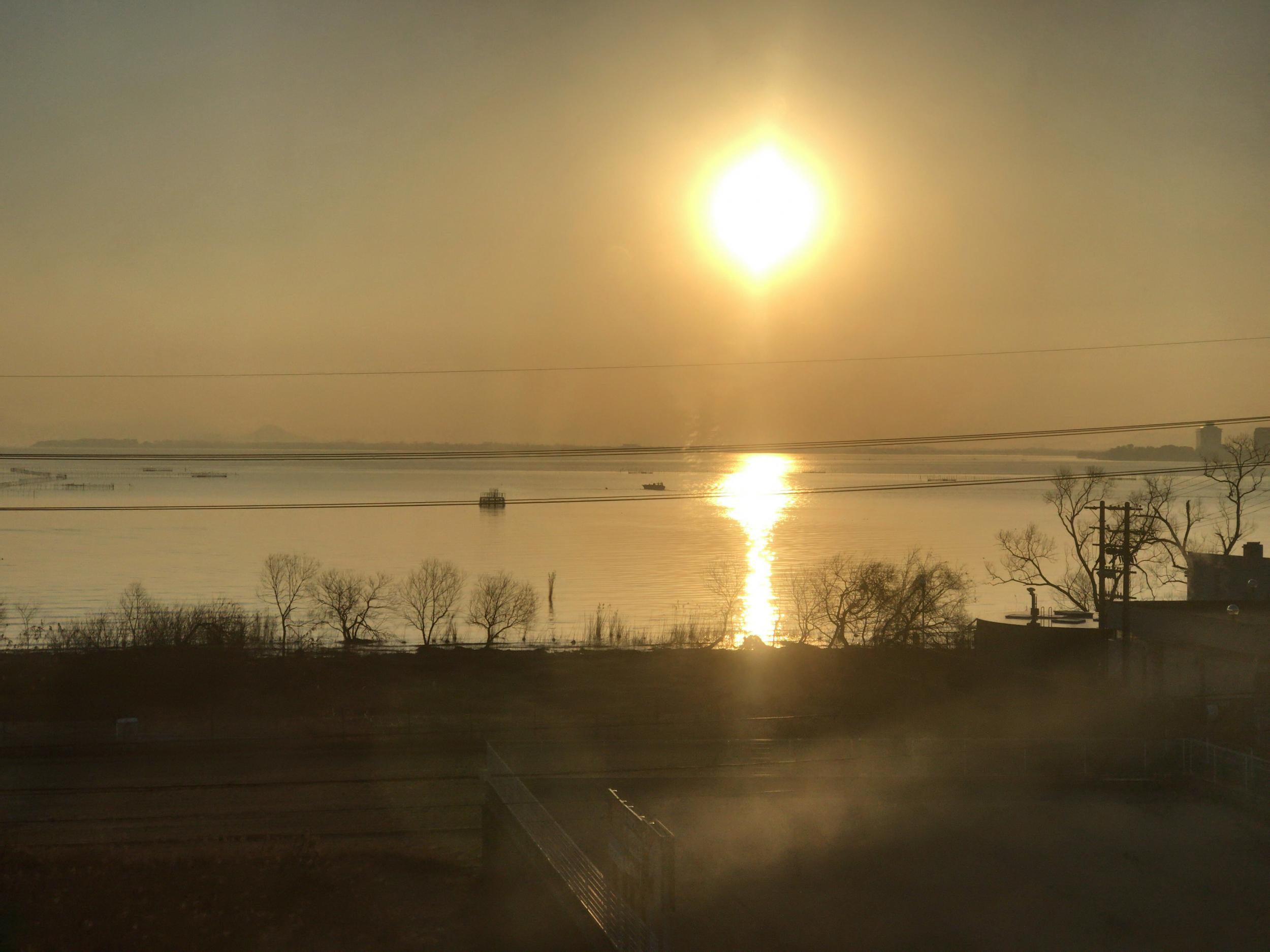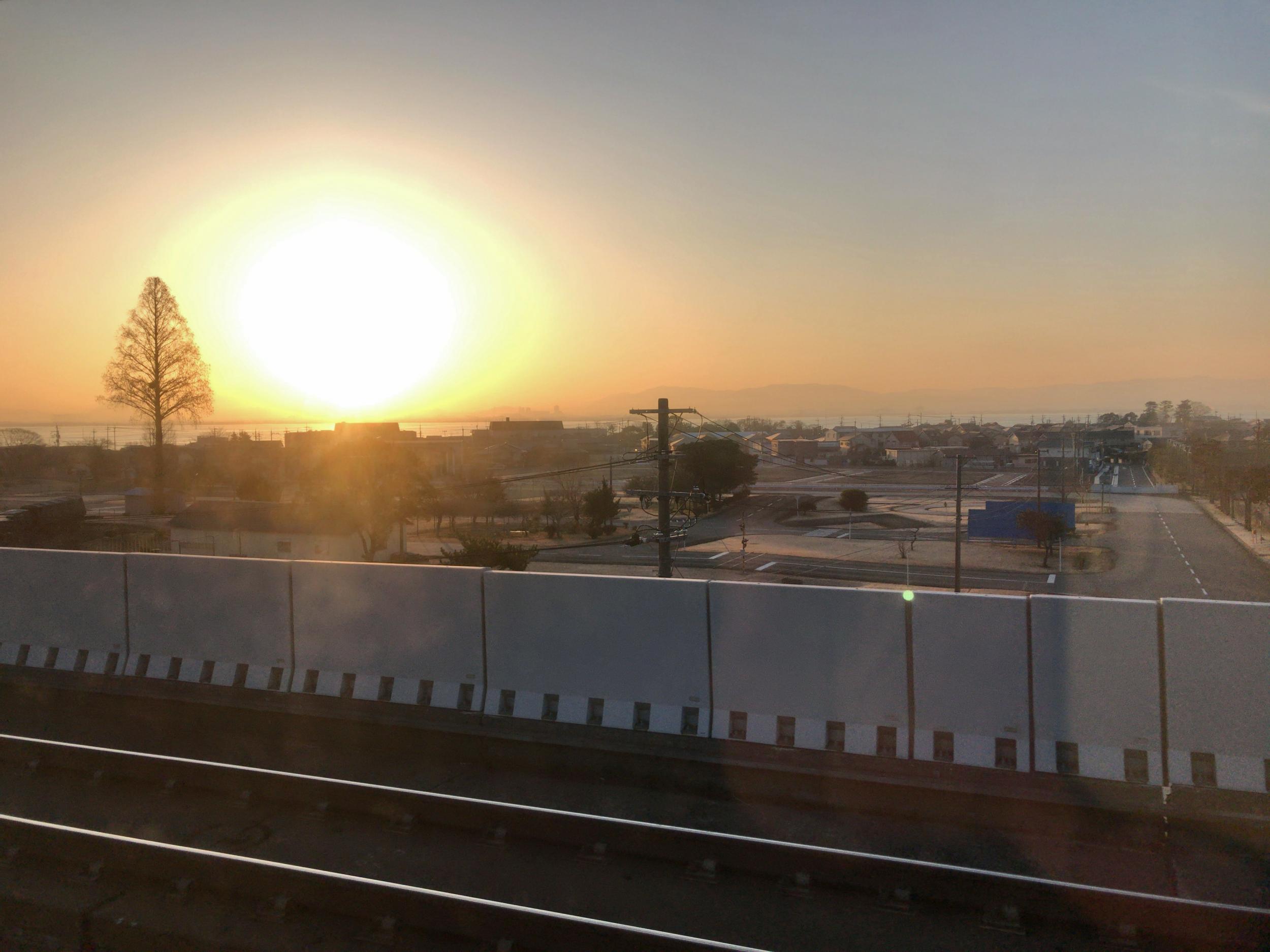 琵琶湖の朝日がきれいです。ところが湖西線ドドメグリーン117系の車内放送がめちゃうるさくて、落ち着いて景色を眺めることも、眠ることもできません。アプリで測ってみたら90db、よほど車掌さんに文句を言いに行こうかと思ったのですが、先頭車に乗っていたので、がまんしました。