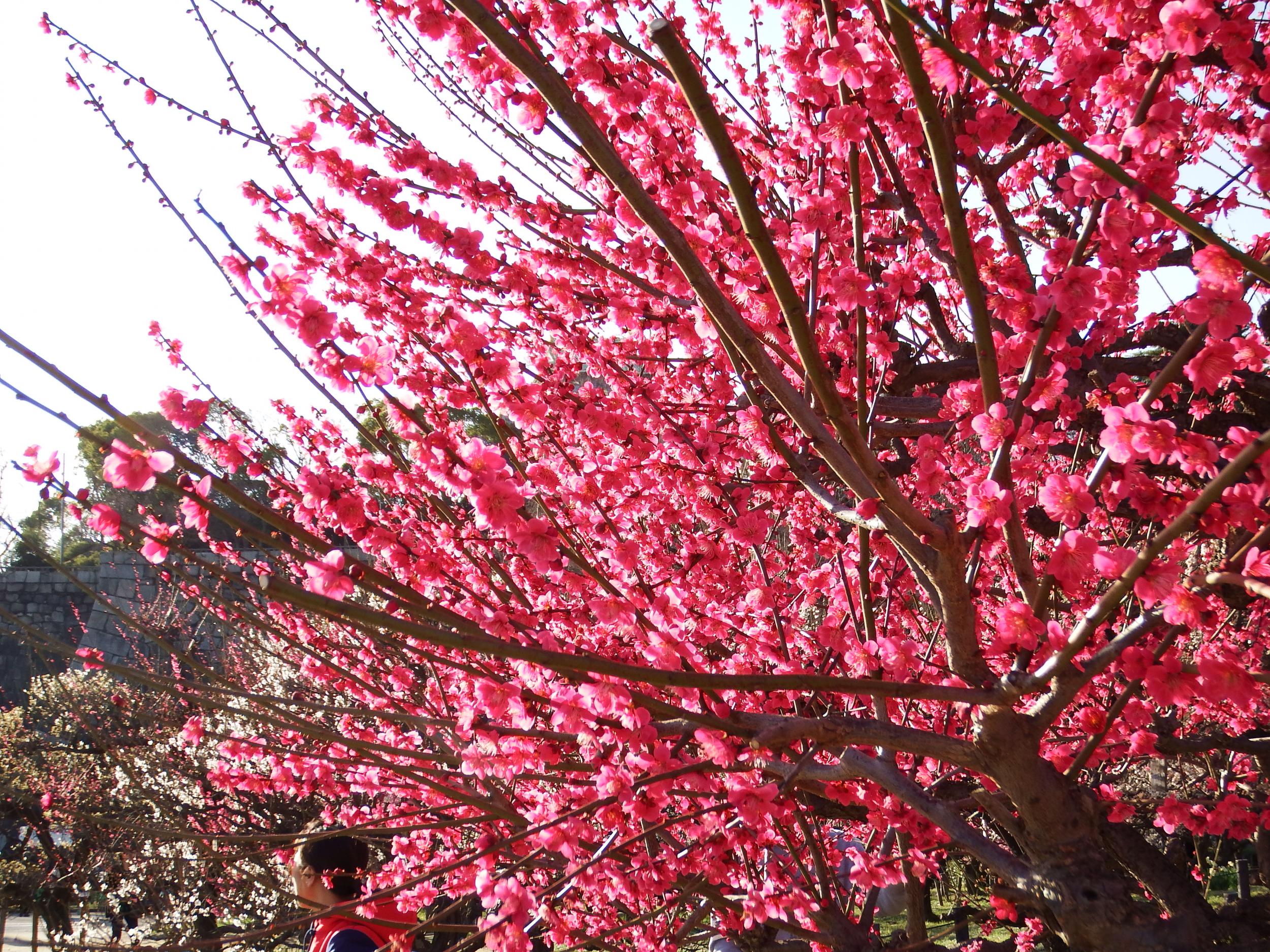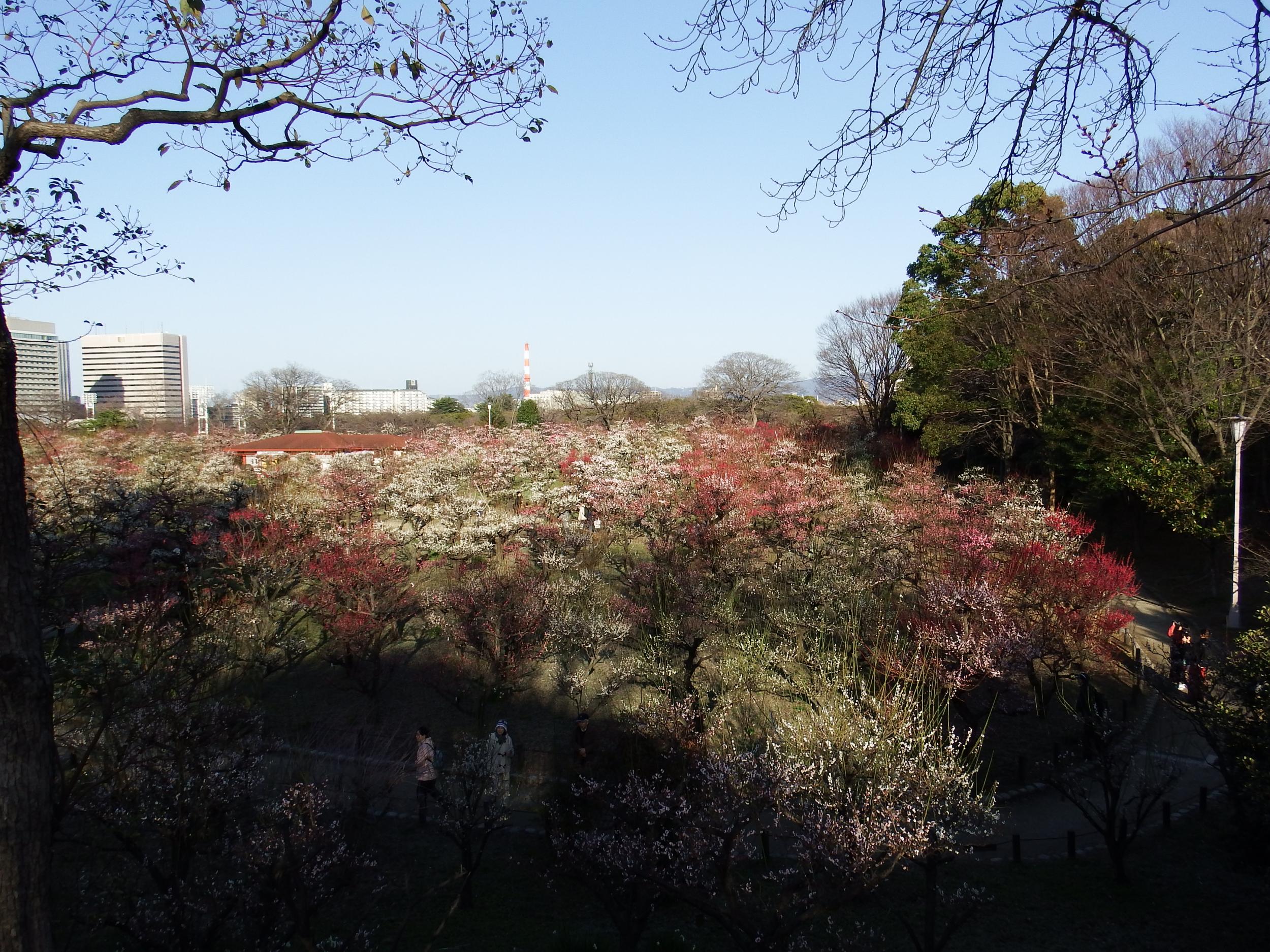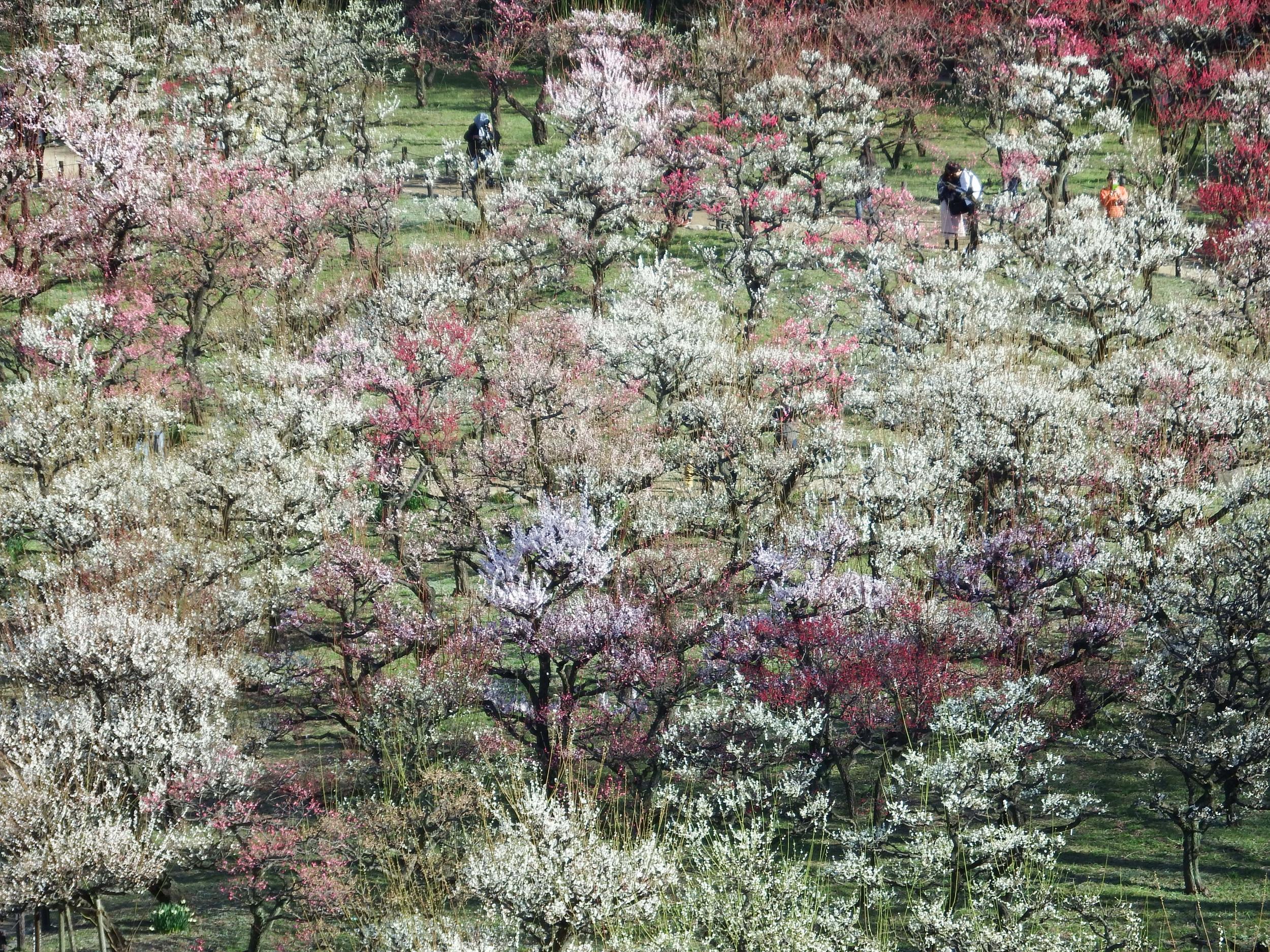 本丸から満開の梅林を俯瞰。真ん中のやたらと白い梅は何だろう、また行って調べて来ないと。