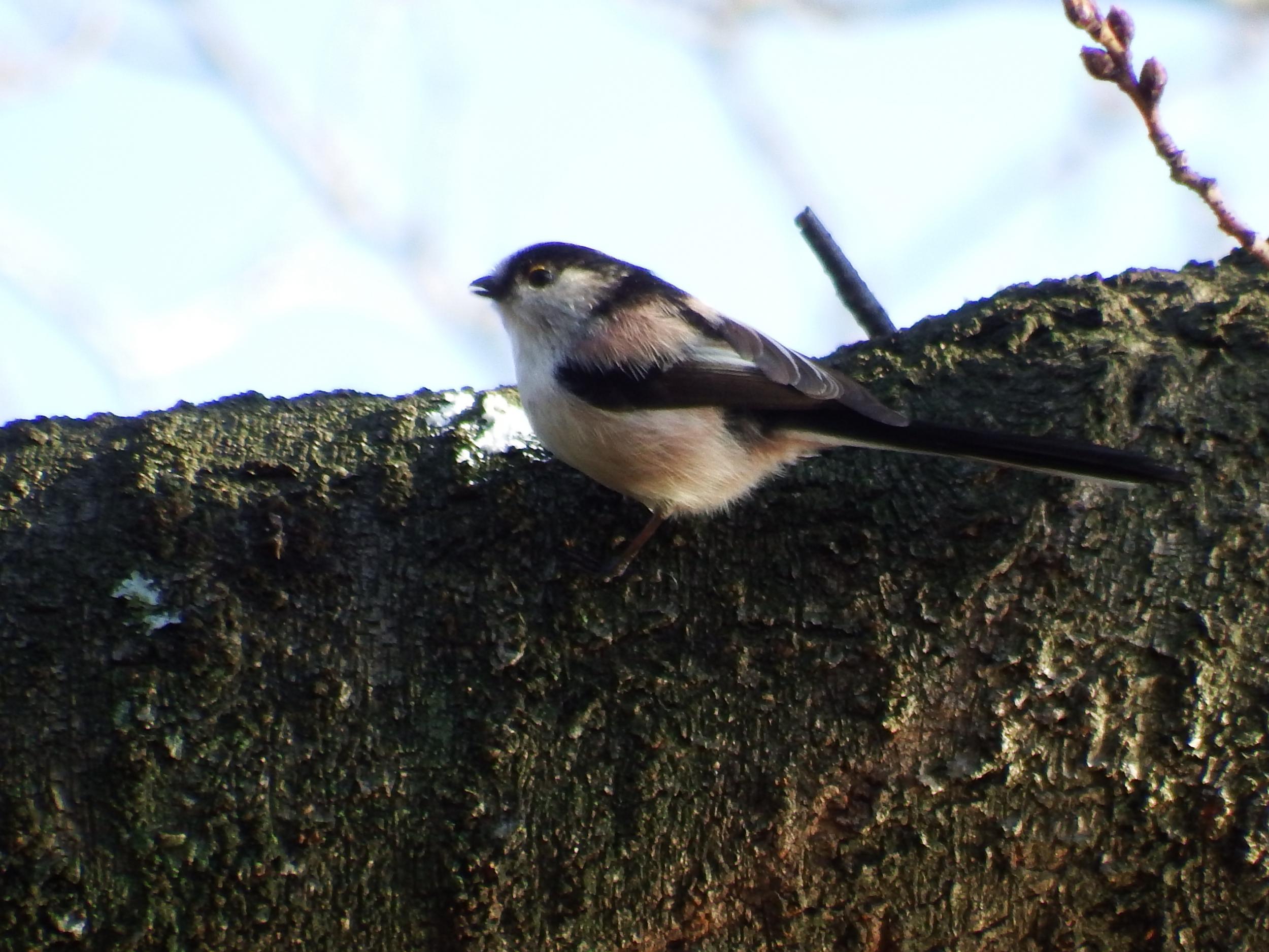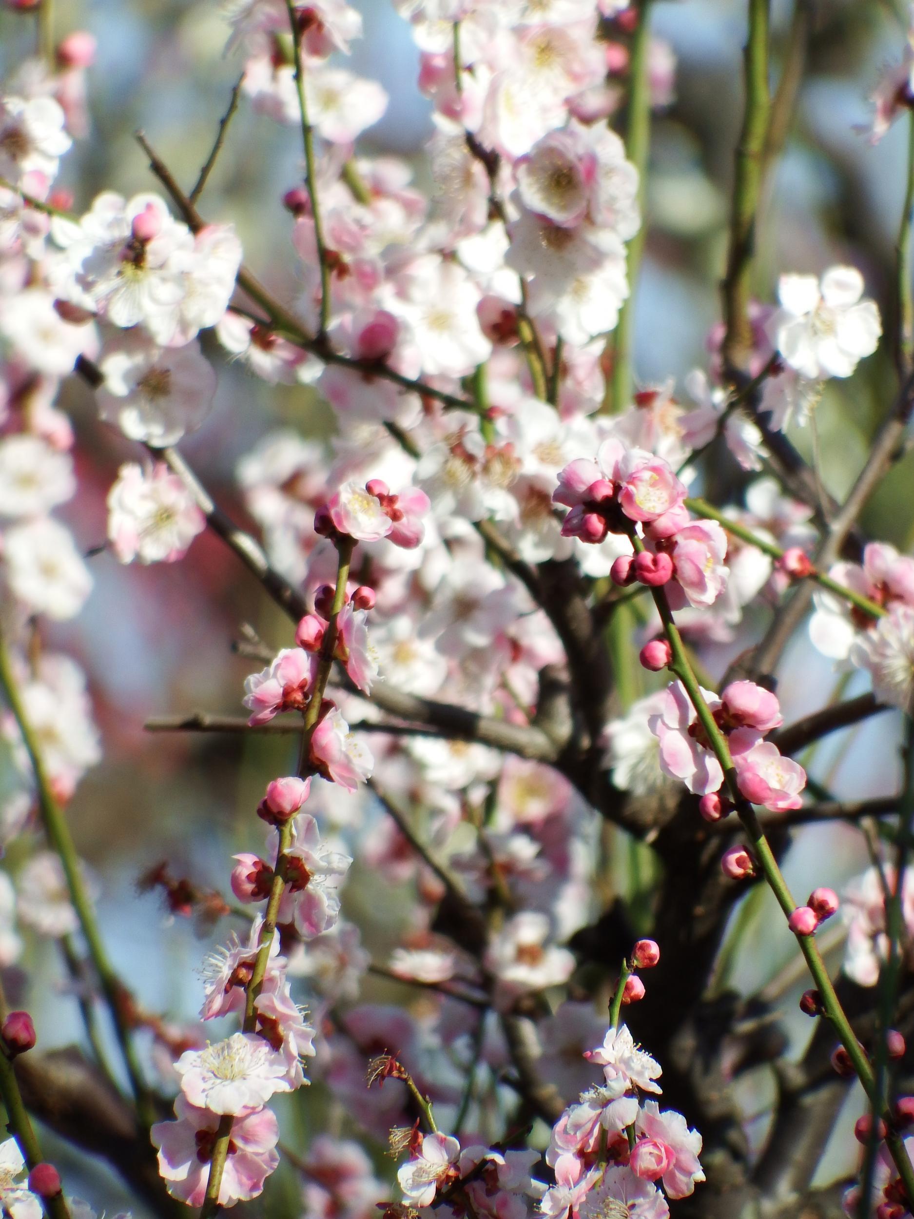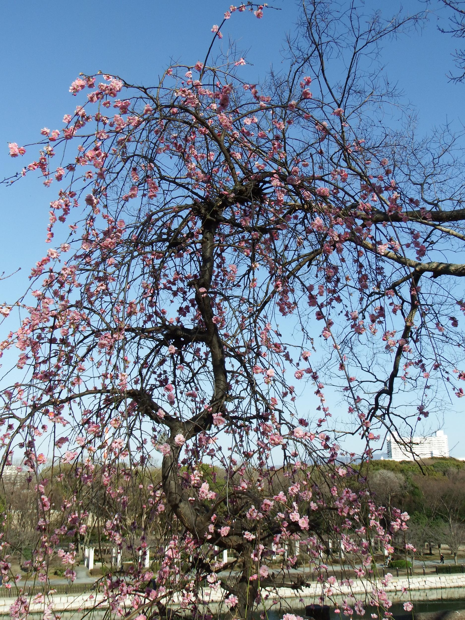 梅林からちょっと外れた東外堀に張り出した場所に1本だけある呉羽枝垂、まだつぼみが固い時この木にエナガが止まっていました。それにしても幹のクネクネ具合がすごいです。