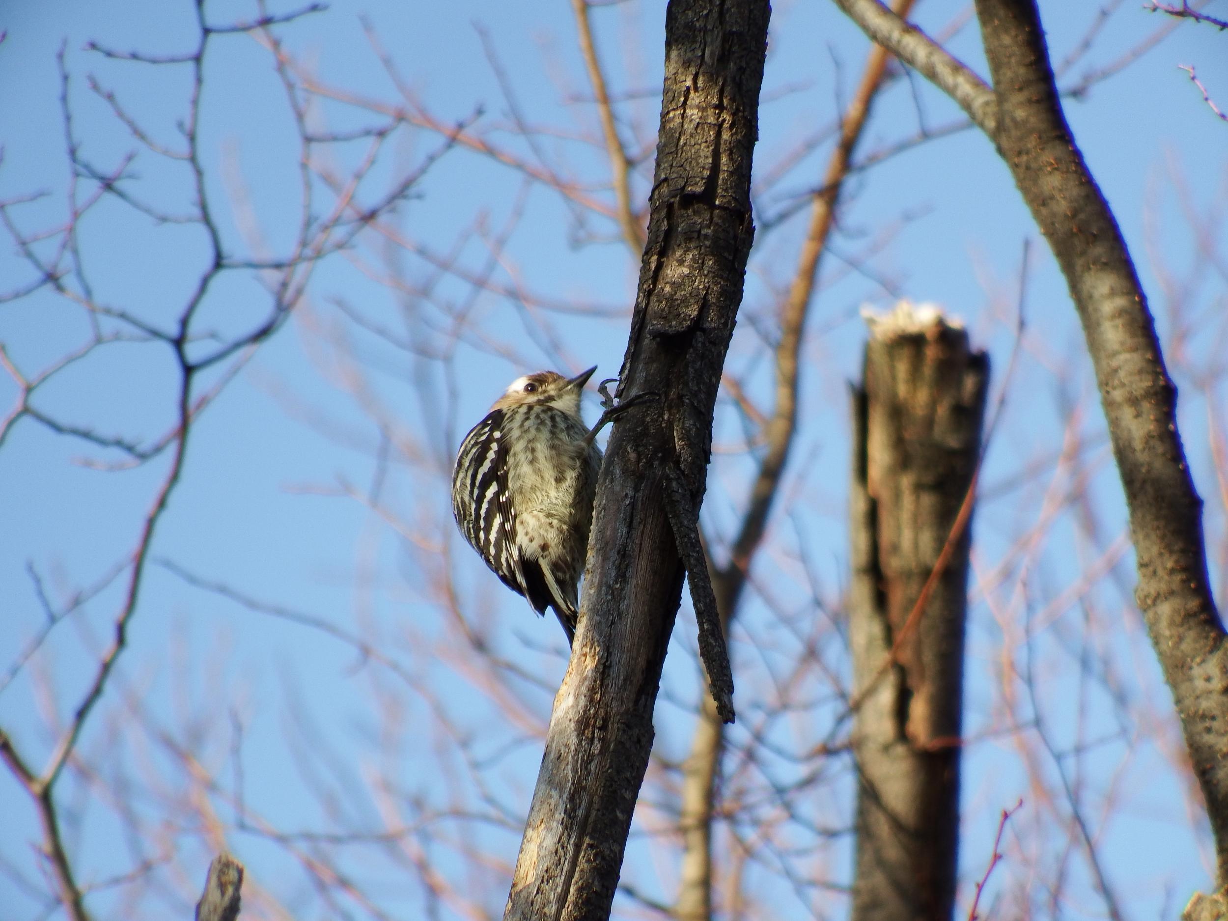 コゲラは細い木に移動、トントンやりながら少しずつ上って行きます。