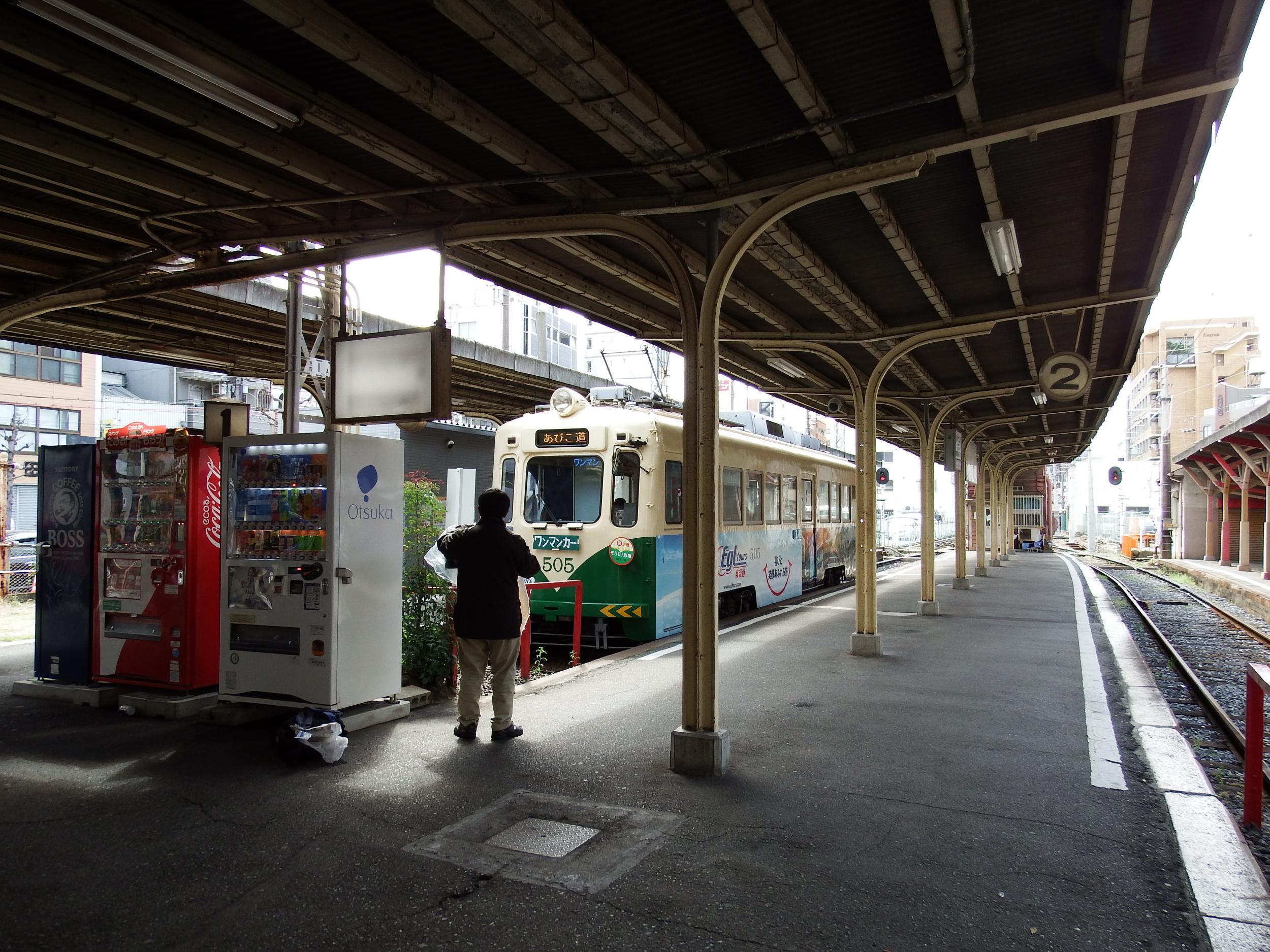 今池停留所はかつて南海天王寺支線と立体交差の接続駅で高架上にあります。モ701形のパンダが築堤を上ってきました。前々回、前回の経験から恵美須町12:21着がモ161形の運用のはずと狙ってきたのですが、やってきたのは岡崎屋質店。毎日同じ運用とは限らないと分かりました。