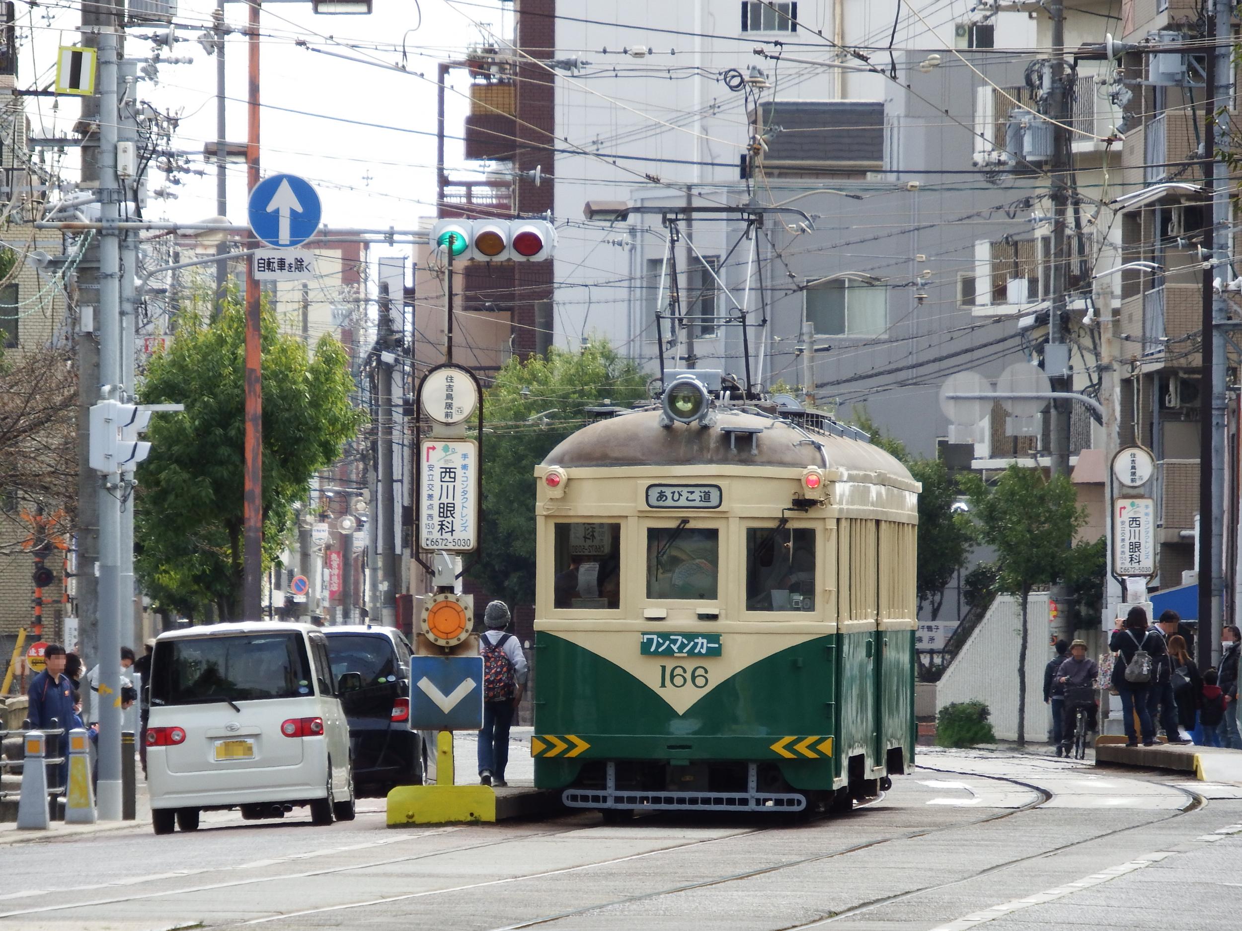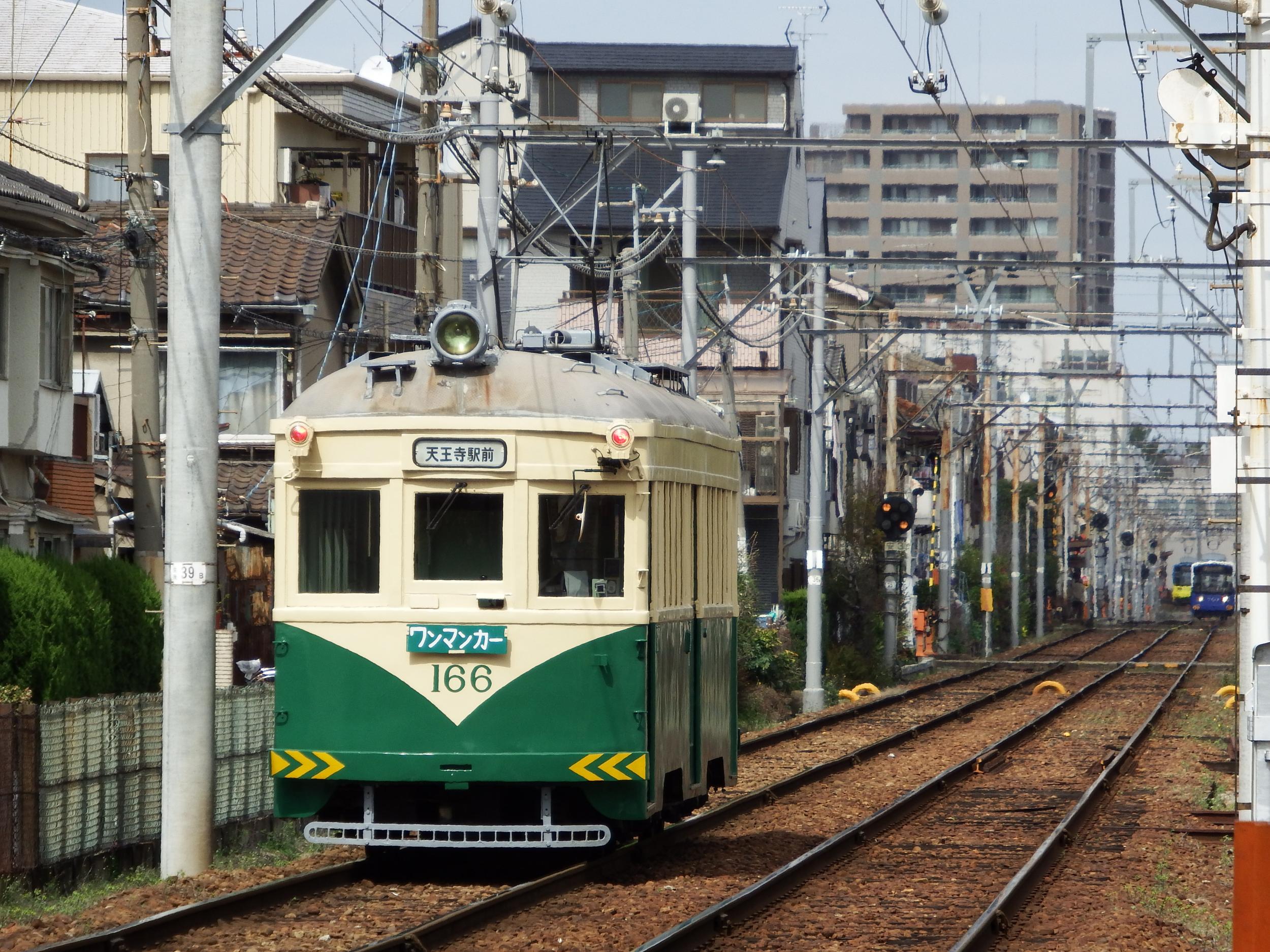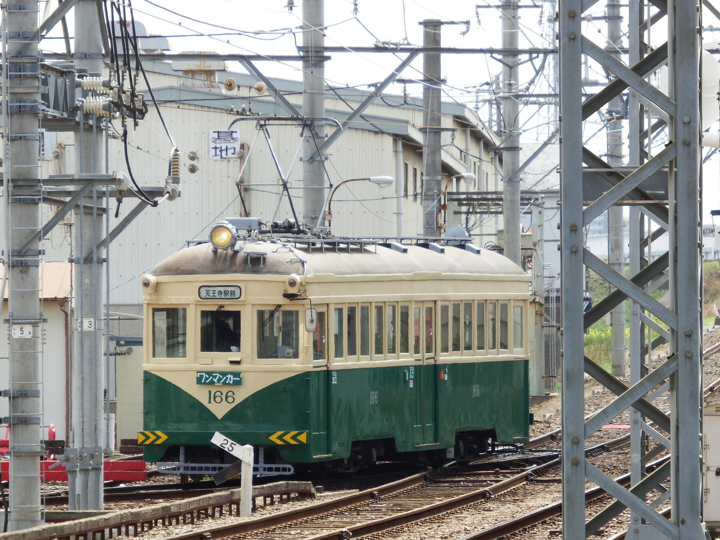 歩道橋に上がってみるとモ166がやってくるのが見え、乗り鉄することにします。阪堺線と違って乗客は多いです。