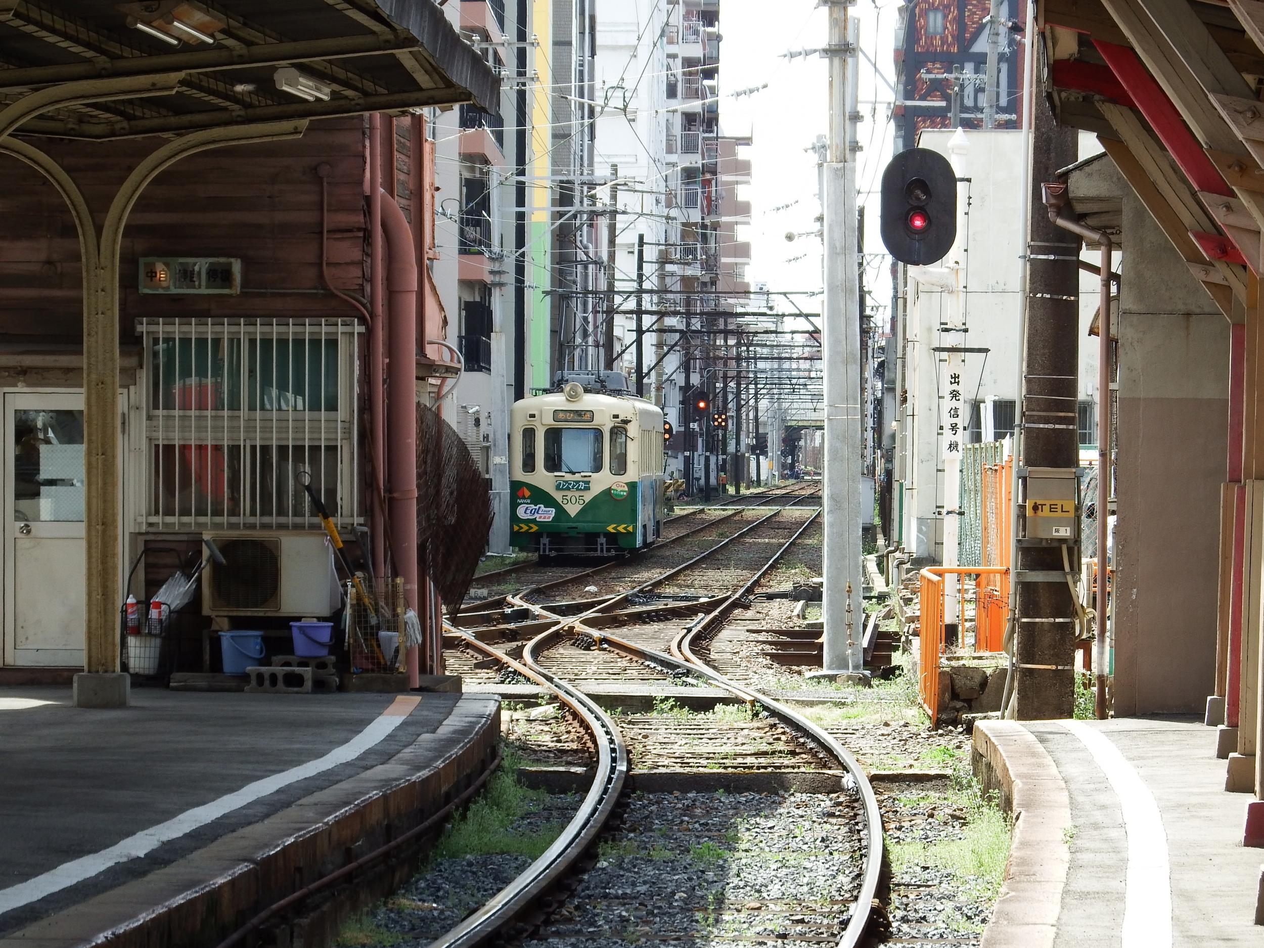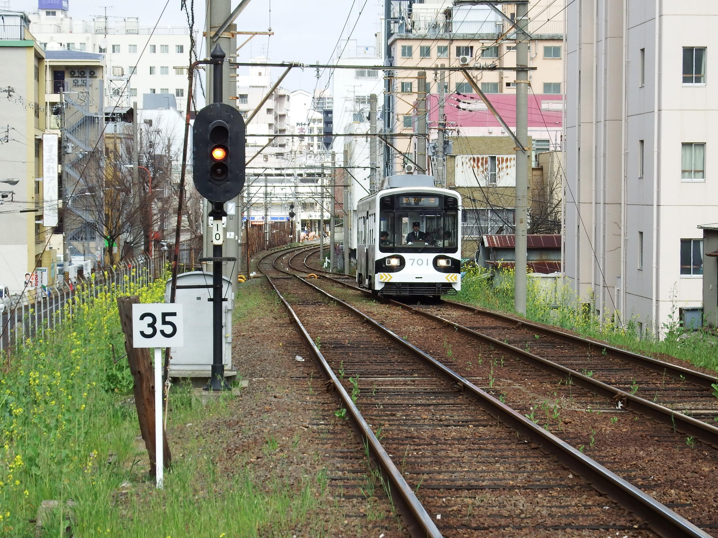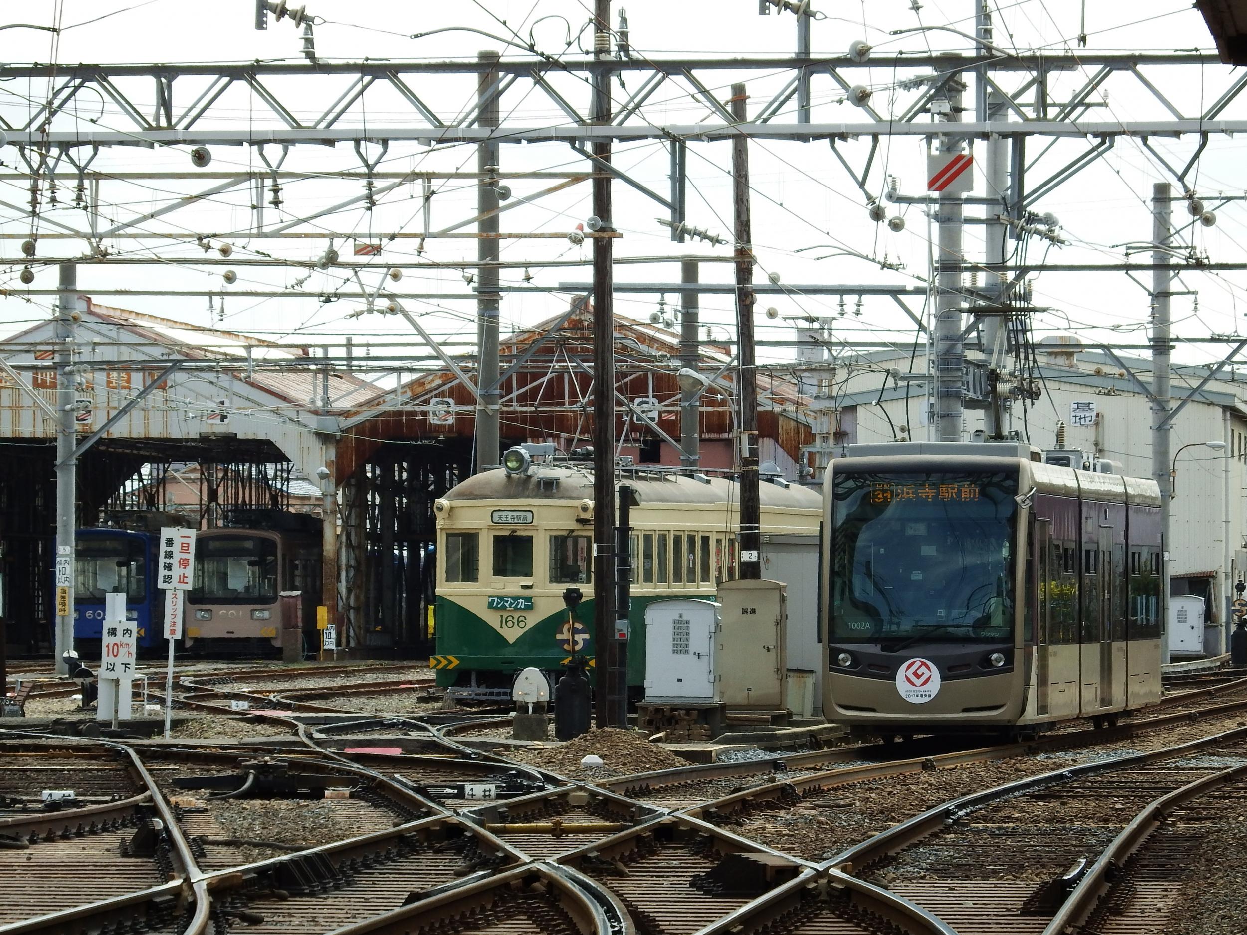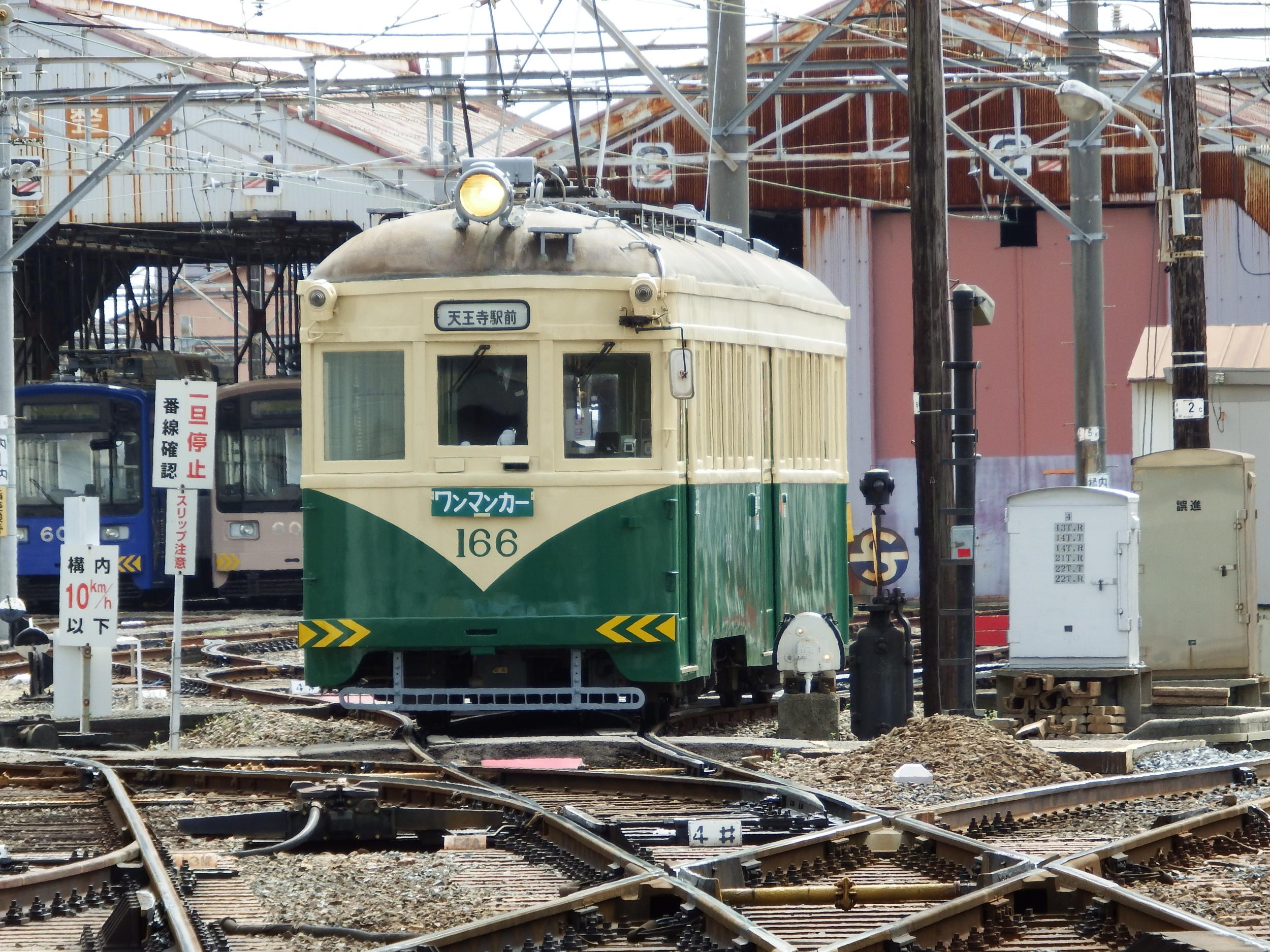 歩道橋に上がってみるとモ166がやってくるのが見え、乗り鉄することにします。阪堺線と違って乗客は多いです。