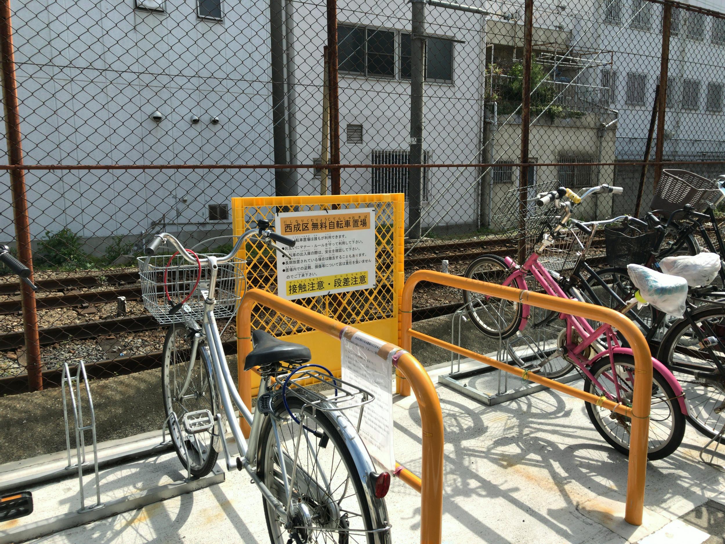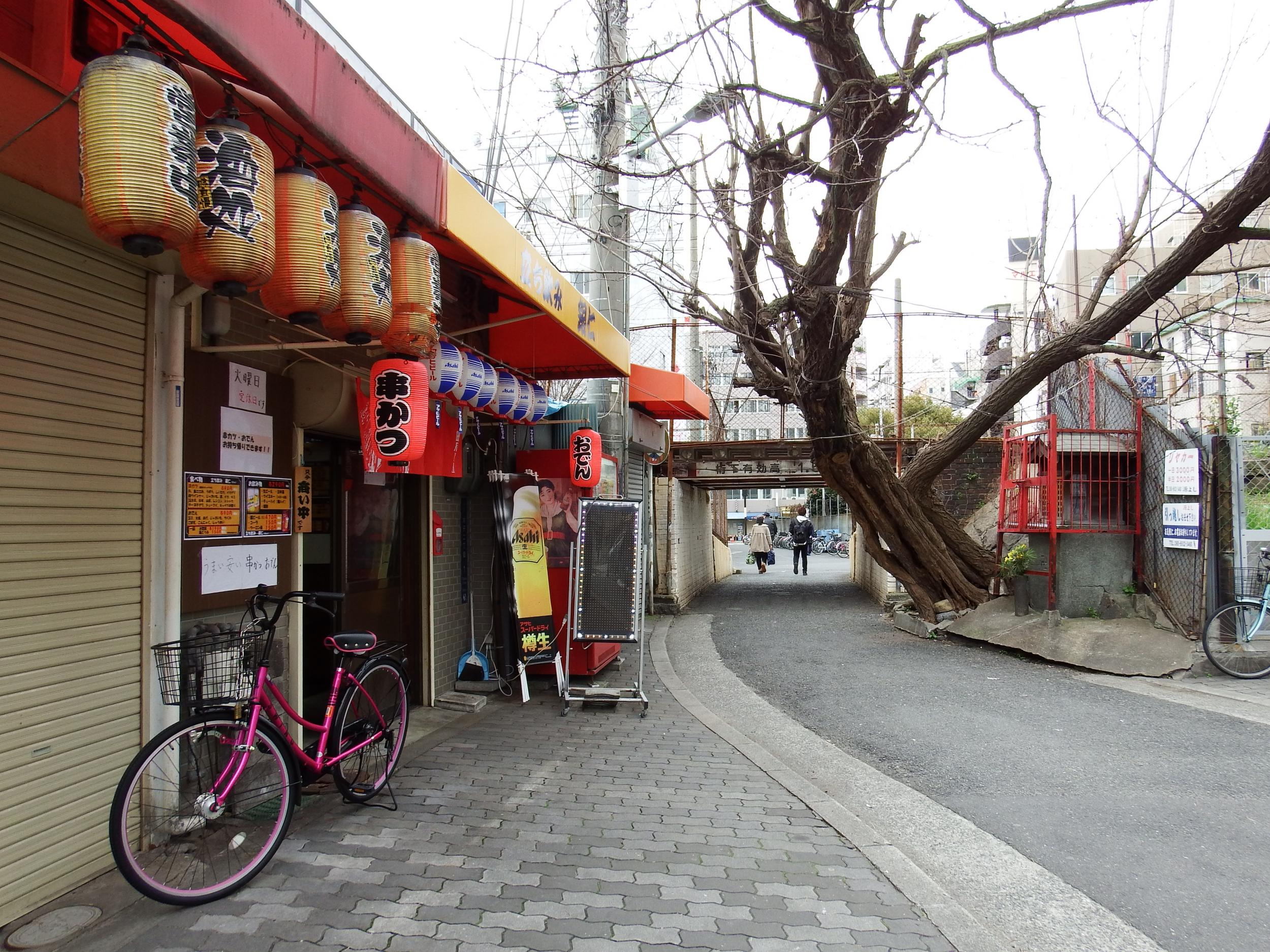 敷金礼金無し家賃26000円〜のアパートとかが並んでいます。お世話になりたくたいという思いと、だからこそ安心という思いが交錯します。向かい側阪堺線に沿って200mくらいの無料駐輪場が整備されていて、20m程きっちり間隔を空けてひとりずつおっちゃんたちが腰を下ろしていたり飲んでいたりします。その先では地べたで将棋を打っていて集まったギャラリーにはなぜかキャピキャピの若い女の子も。