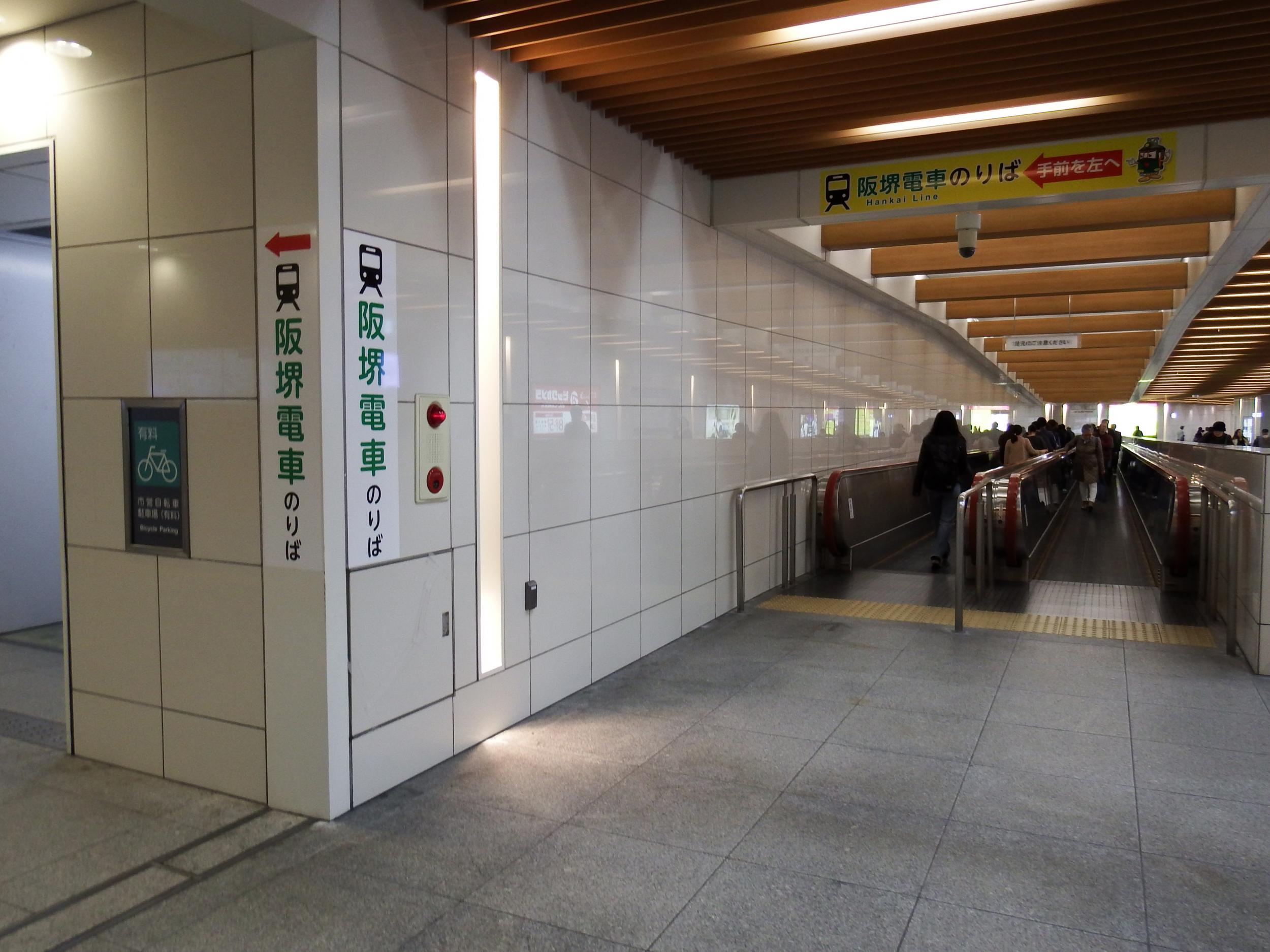 地下鉄から阪堺電車のりばへの階段はQ'sモールへのムービングウォークの手前に移動していました。エレベーターも設置され、堺トラムと合わせてバリアフリーが漸く一応完成したようです。