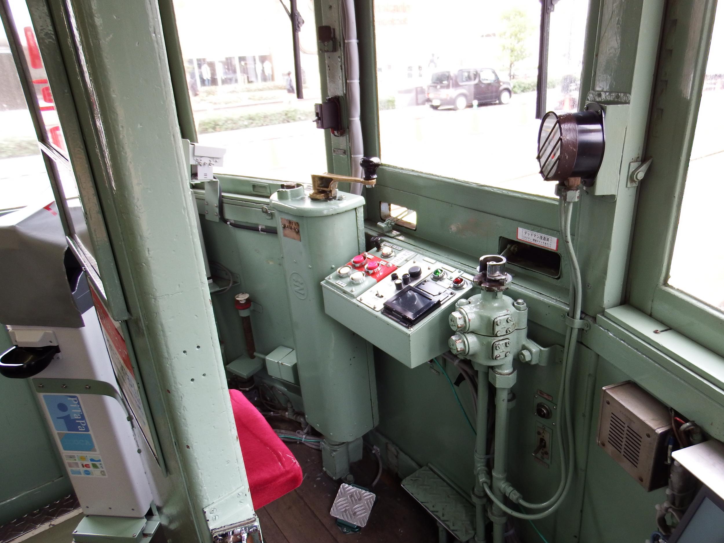 車番プレートの下の垂木が割れているのが気になりますが、飾り金具で柱としっかり固定されていて、車体自体は金属製なので問題ないかと。運転台の計器類は圧力計だけで速度計はなく、運転士さんが体感で速度を把握しています。