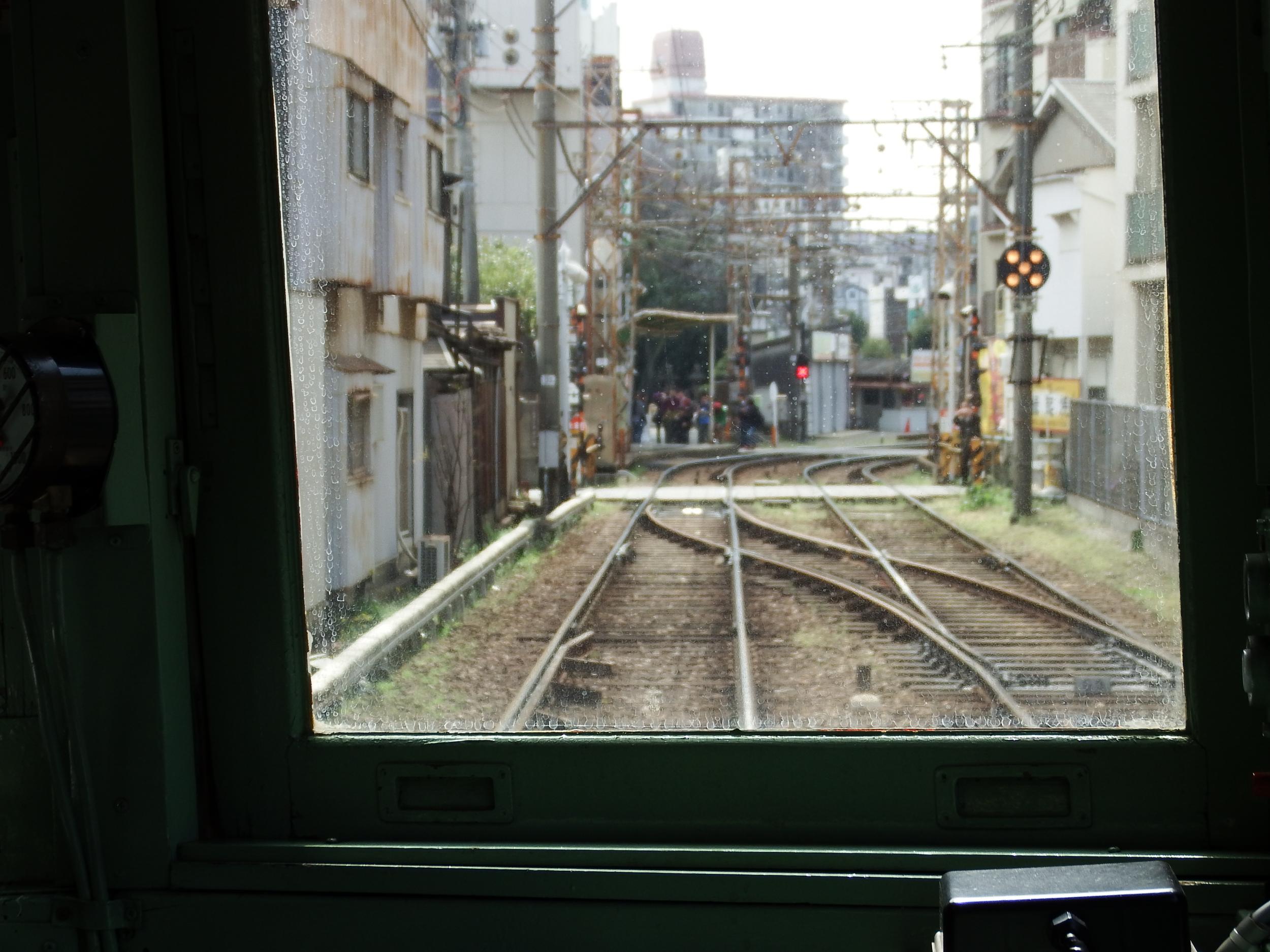 住吉で若い撮り鉄君たちが10数人、撮るだけじゃなくてぜひ乗ってツリカケ音をたっぷり味わって欲しいと思います。車内から立浪部屋の幟、今日は中日です。