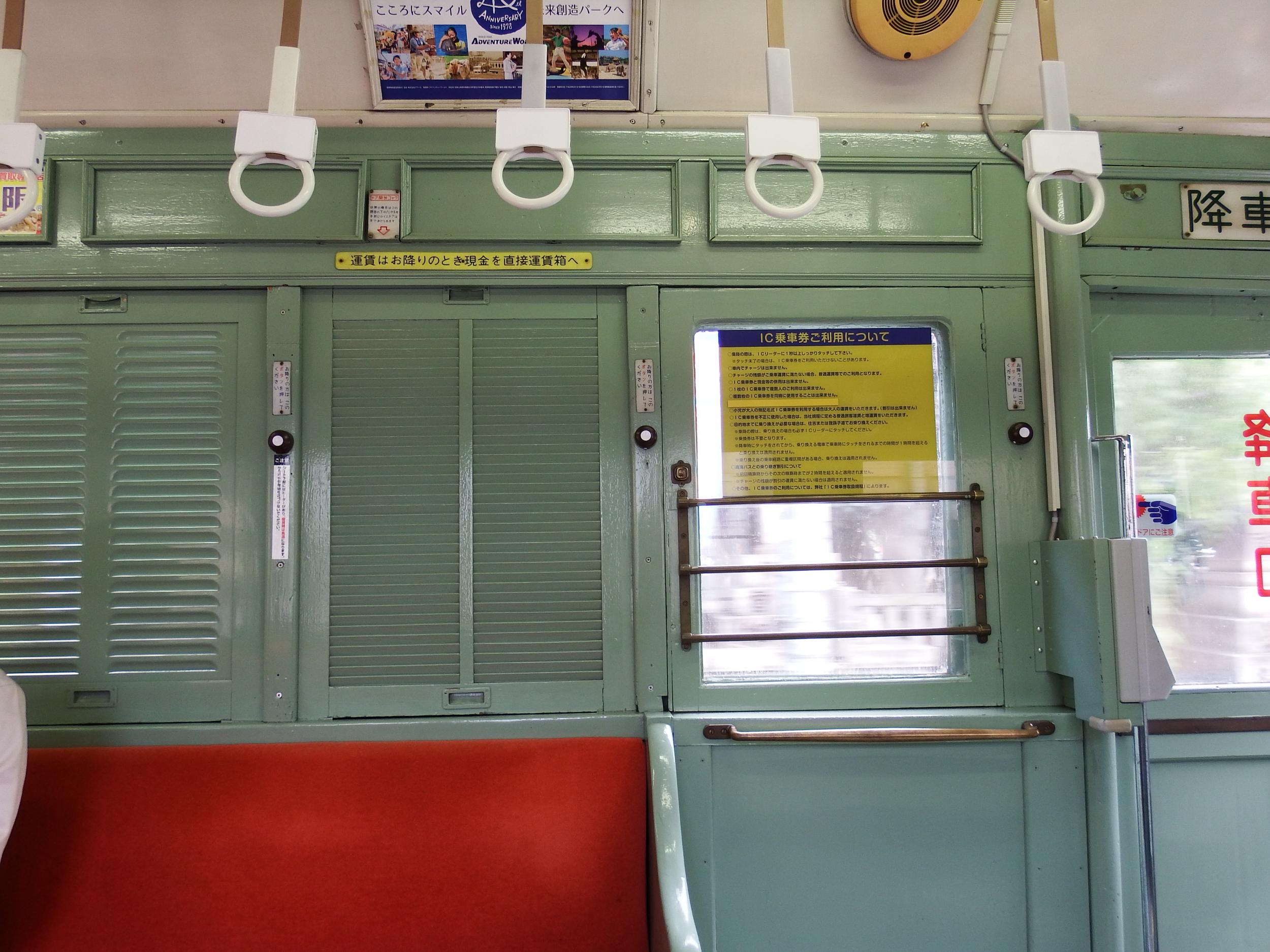 「顔なじみ今日も乗ってる阪堺電車」の他に「笑顔ふれあいチンチン電車」のバージョンもあります。昭和初期の意匠の飾り金具が車内のチャームポイント。