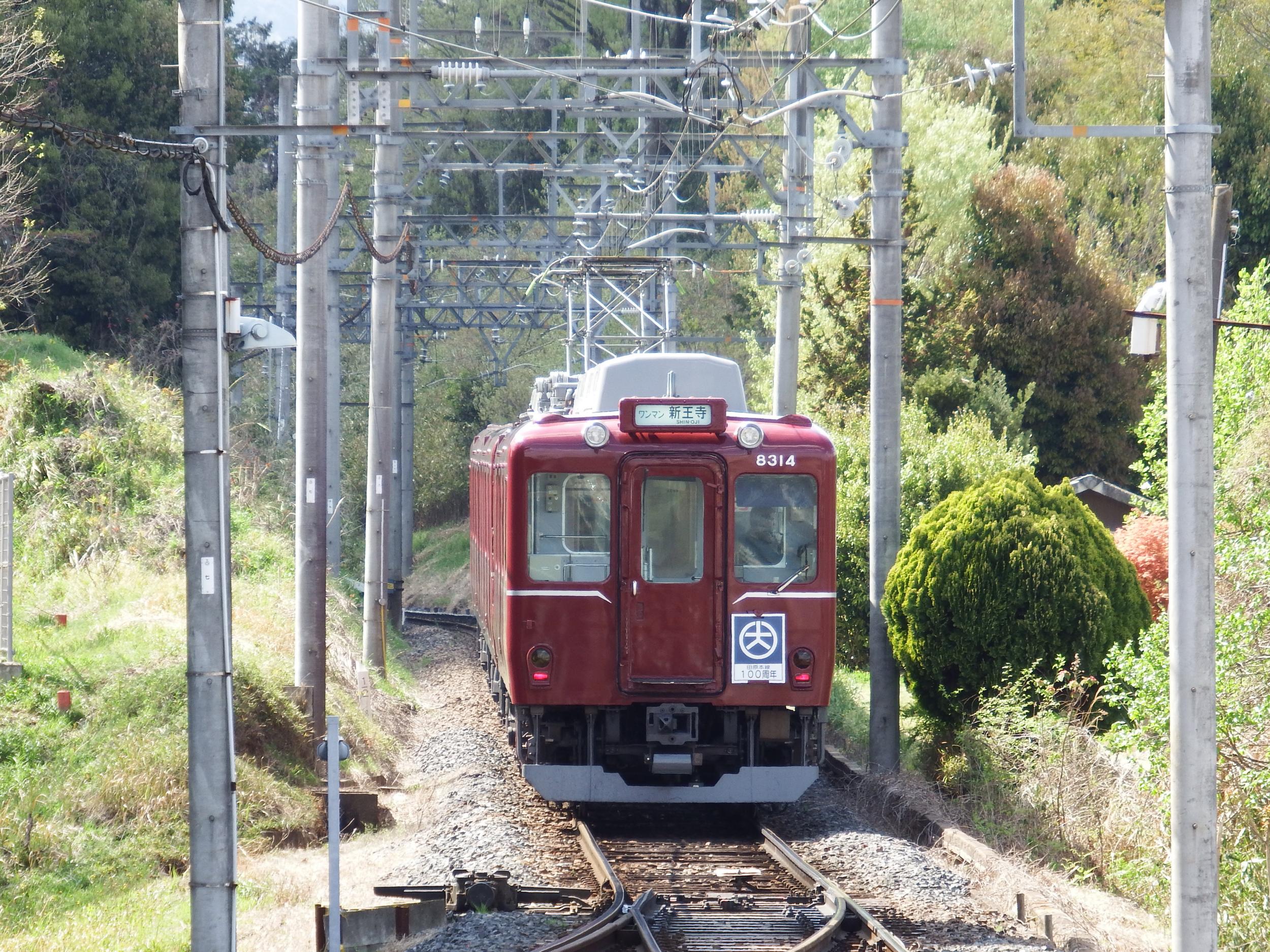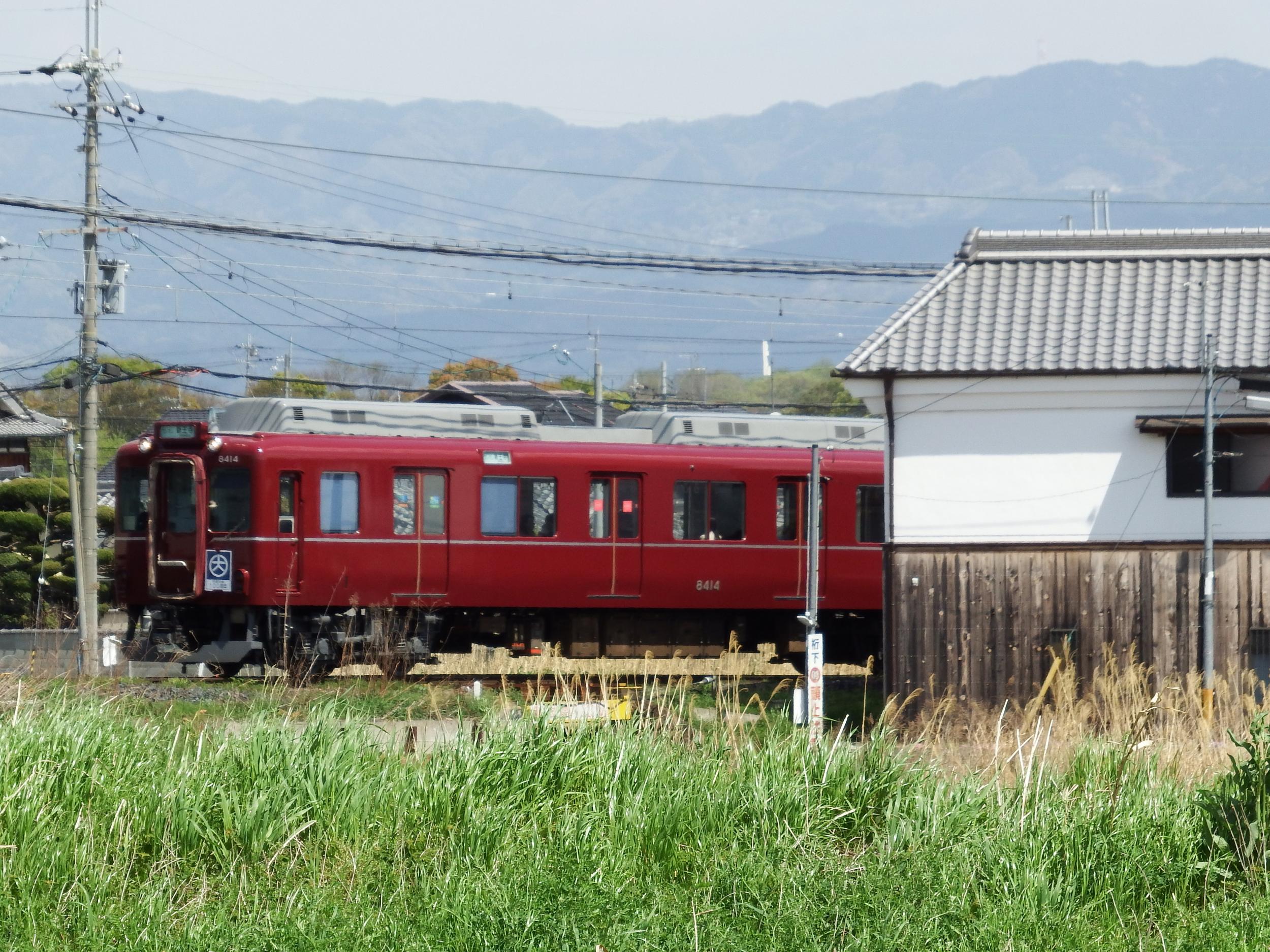 外装は復刻塗装も車内は普通に8400系なので、乗るまでもなくB13編成で先行しB14編成を撮り鉄することにします。まずはB13編成最後尾からB14編成。箸尾駅で下車、B13編成を見送ります。
