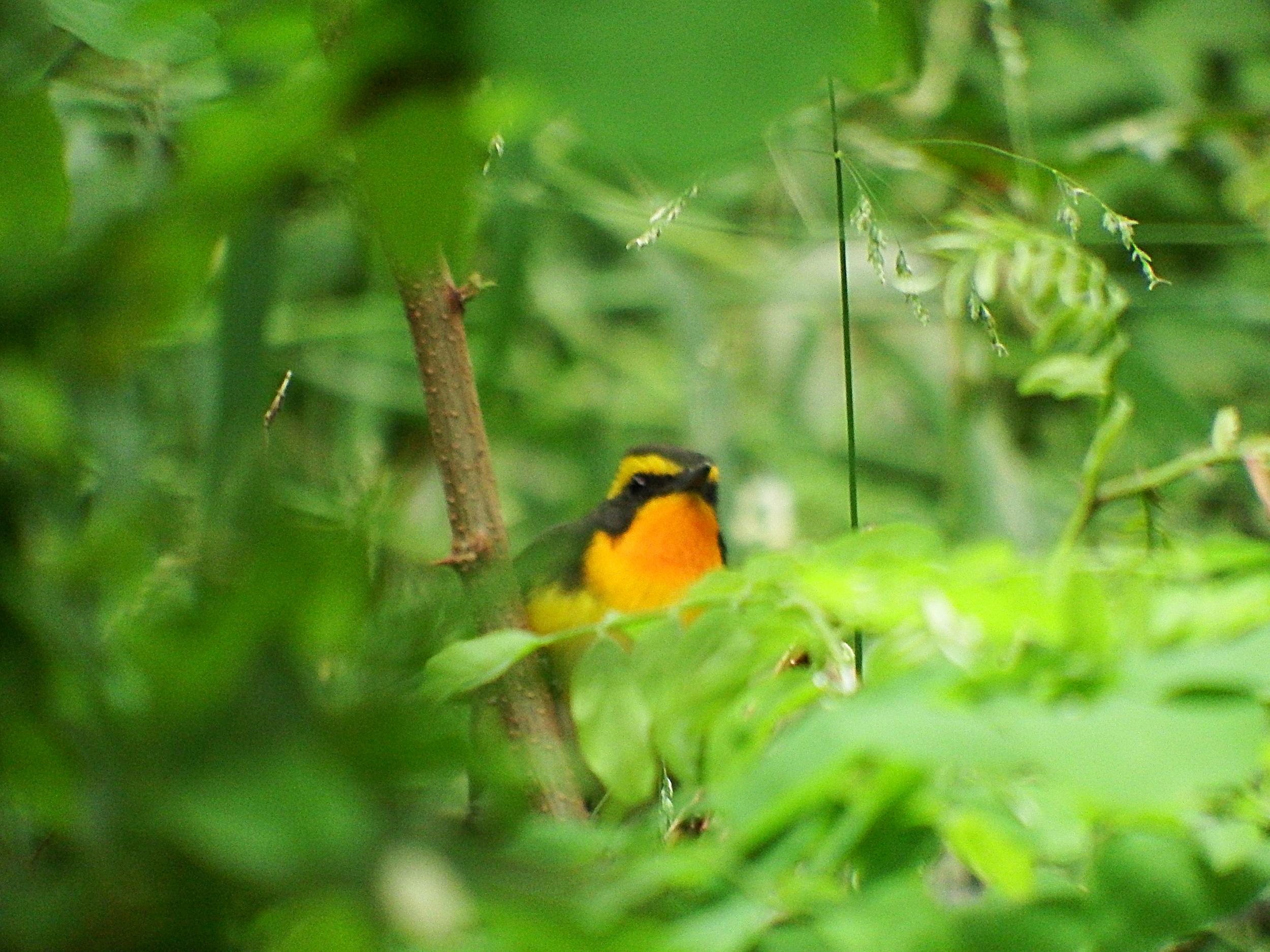 沖縄復帰の森の東の崖の下の段の小径に下りると、向こうからこちらを向いてじっとしている人が、ほらそこにいるよと教えてくれたたキビタキ。すぐ脇の真っすぐ伸びた草にピントが合ってしまったものの、いい感じです。上の方でしきりに鳴いていたウグイスも下りてきました。