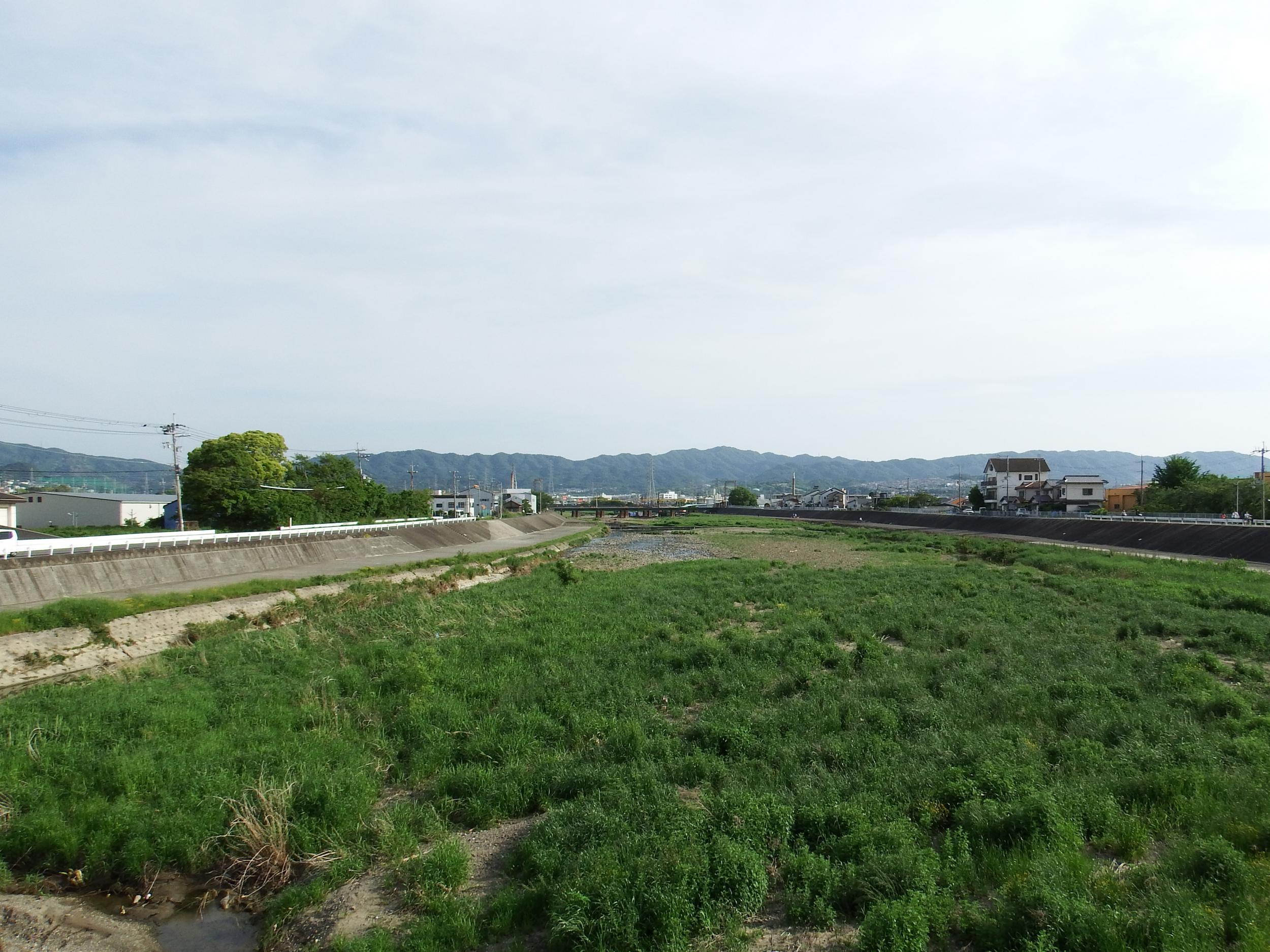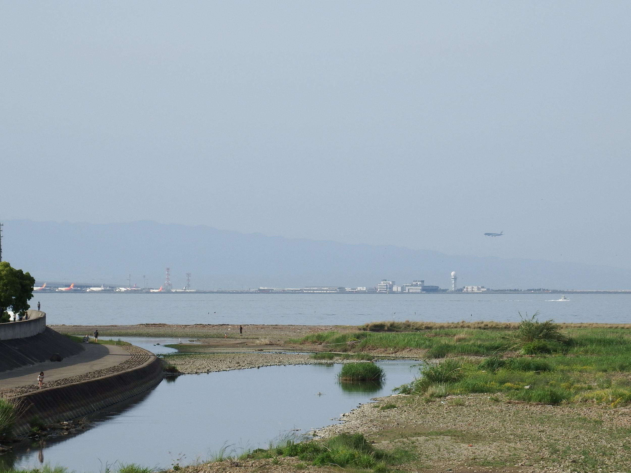 阪南市へ渡る菟砥橋から南側の眺め、パコッとは晴れていないものの和泉山脈の南端紀泉アルプスがとても綺麗に見えます。中央が雲山峰490m、山中渓駅から2時間半くらいで登れるようです。北側の河口の沖には関空に駐機している飛行機もくっきり見えます。