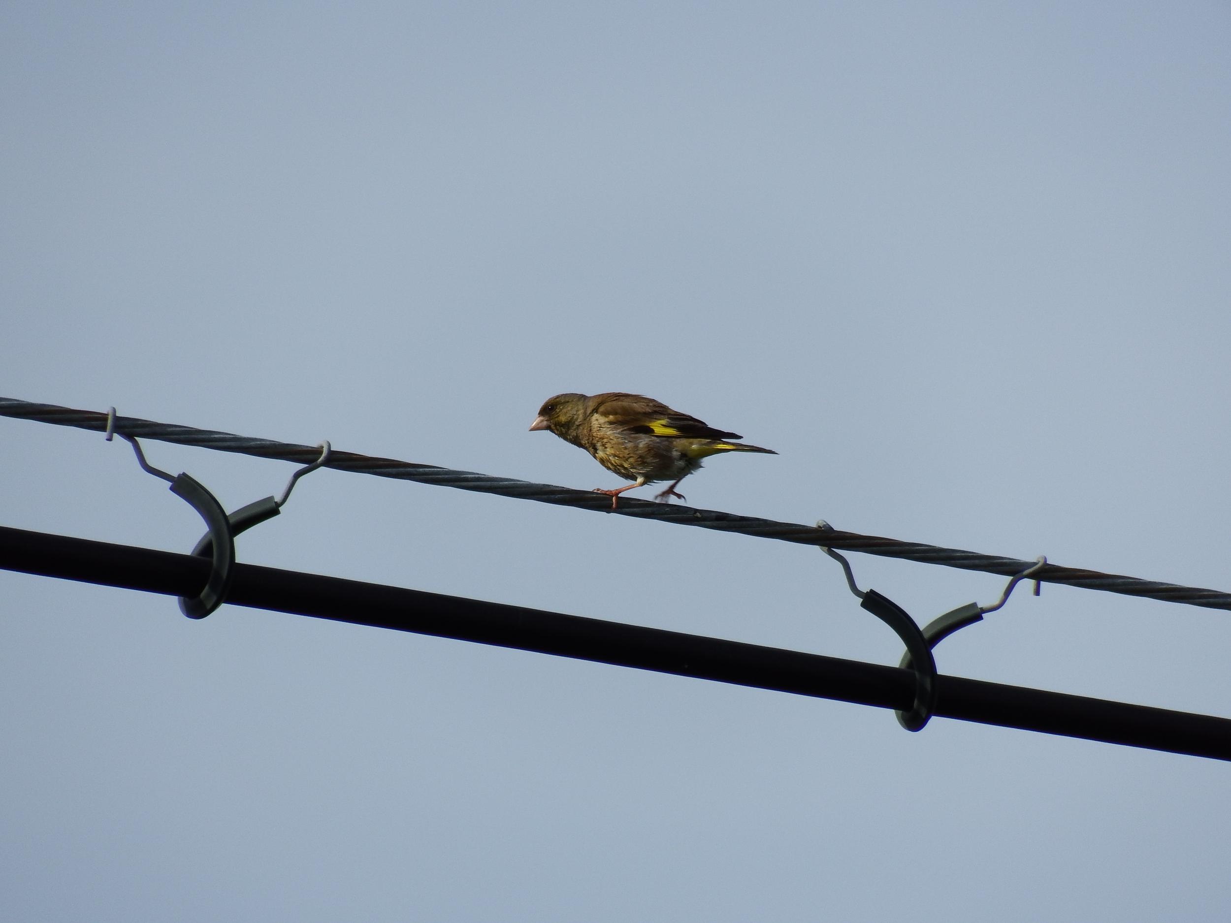 電線にカワラヒワ。目と嘴の間が綺麗なピンクの婚姻色のコサギ。