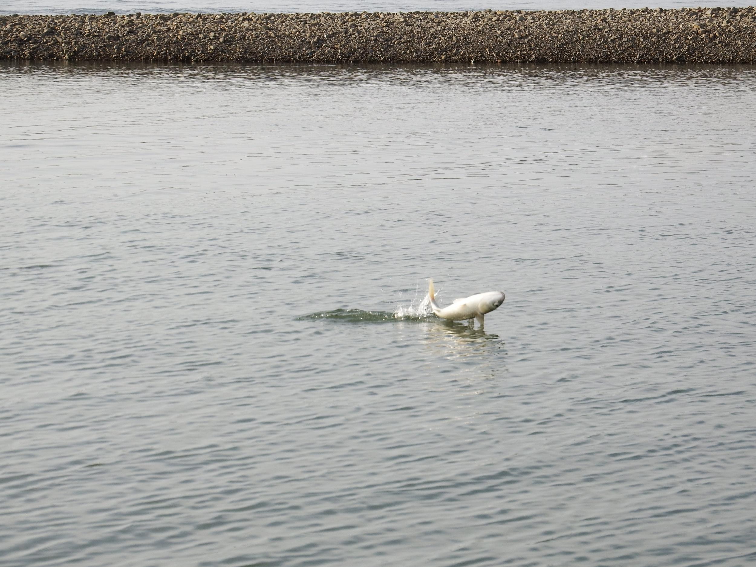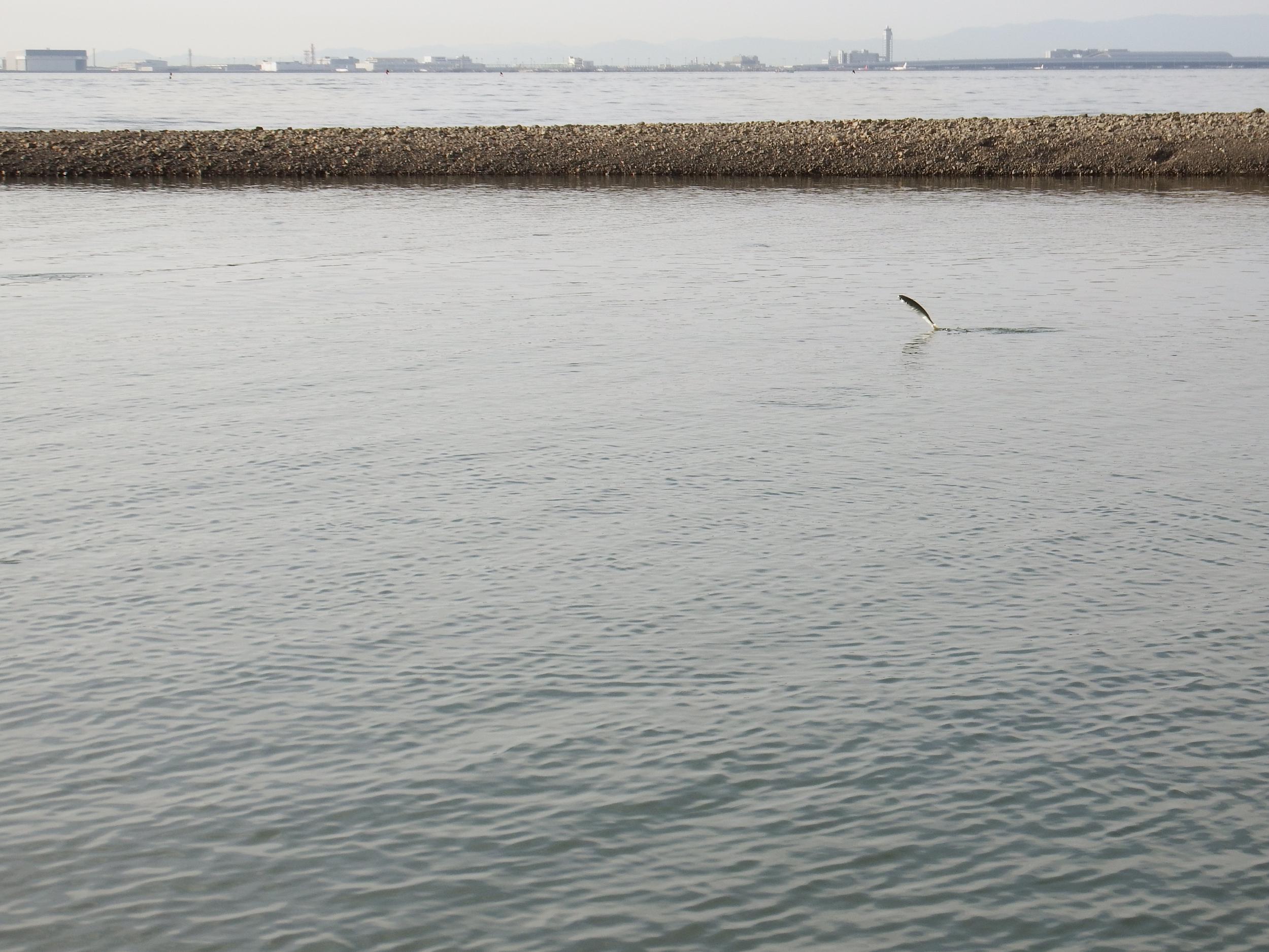ボラのジャンプ。そうそう撮れないはずのひっくり返って背中から飛び込むシーン、50cmはありそうです。