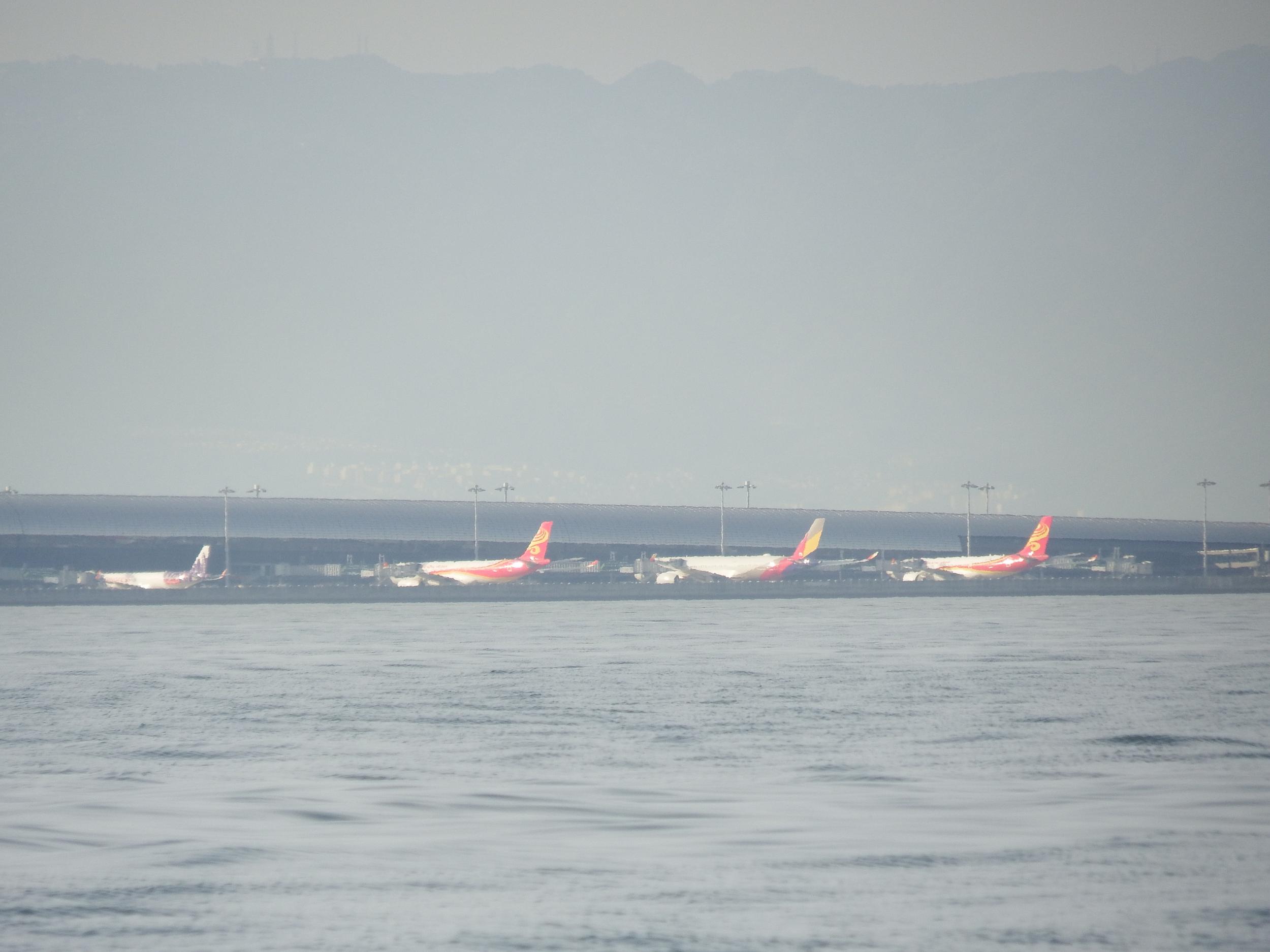 駐機中の飛行機は左から香港エクスプレス航空、深セン航空、アシアナ航空、深セン航空。エバー航空のハローキティジェットが着陸態勢。