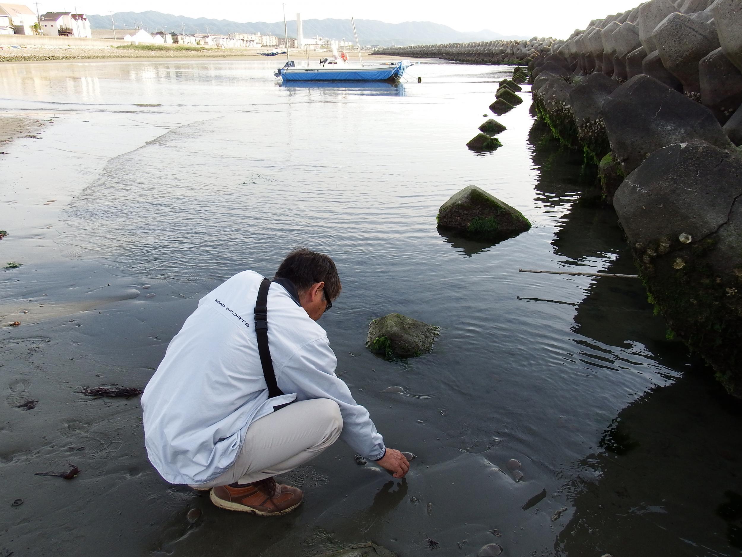 T君の興味はシギチよりも浜にいっぱいいるクラゲのようなセリー状の生物。T君が砂から引っ張り出すと砂の底の方に根が生えているようになっていてクラゲとちゃうで、とのこと。お互いええおっちゃんになってしまったものの、高校時代と変わらない少年のような風貌と行動パターンのT君です。