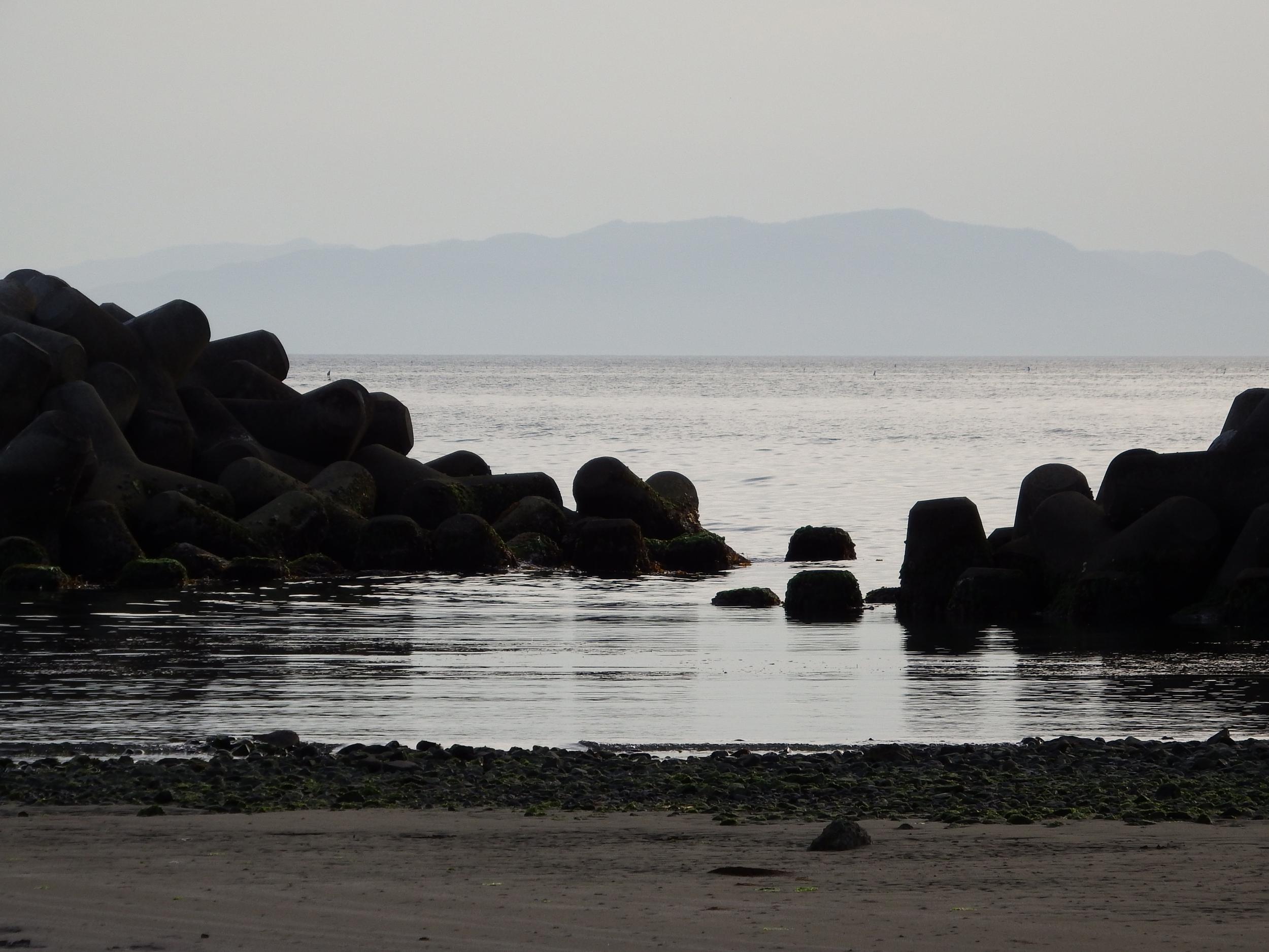 テトラポッドの防波堤の間から見えるのは淡路島の妙見山522m。