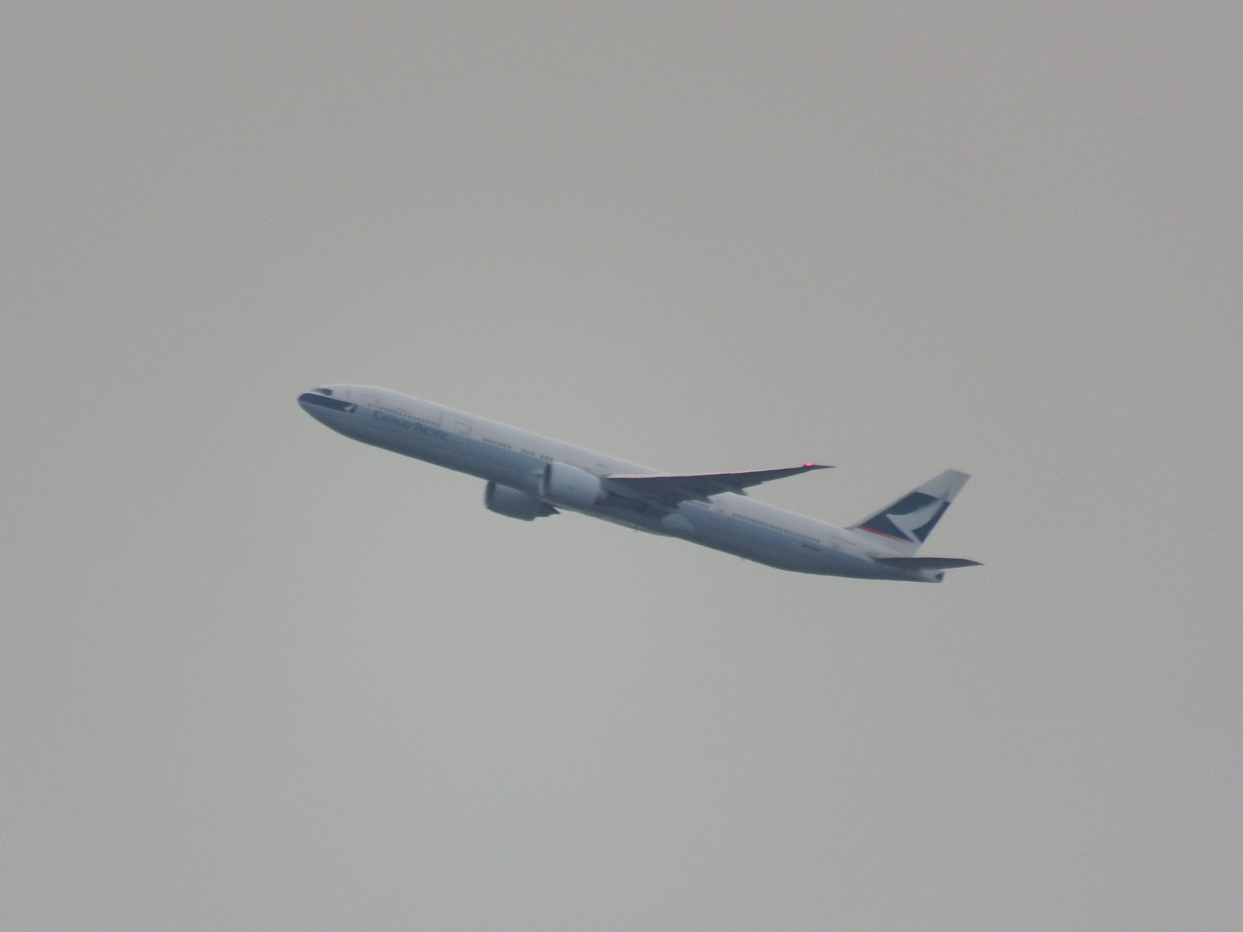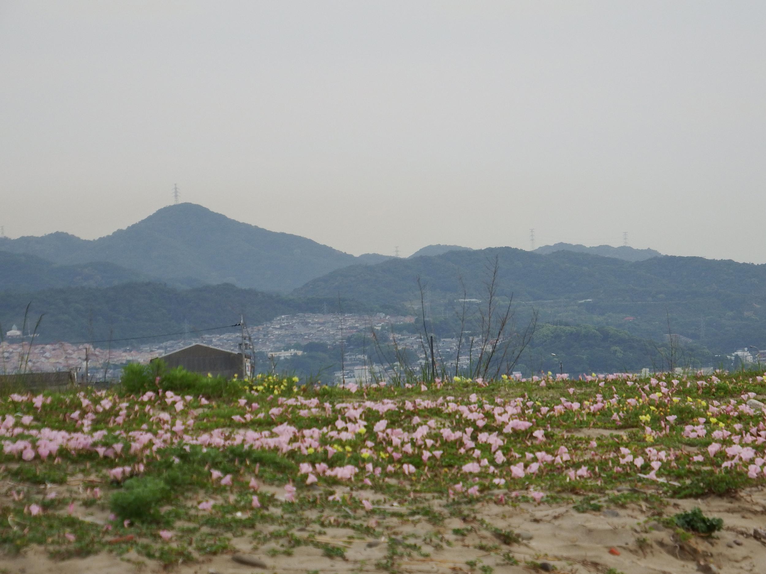 ハマヒルガオの丘の向こうは飯盛山。ジモティの友人たちより、もう自分の方がこの辺の地理に詳しいはずです。キャセイ航空機が香港へ向け離陸。
