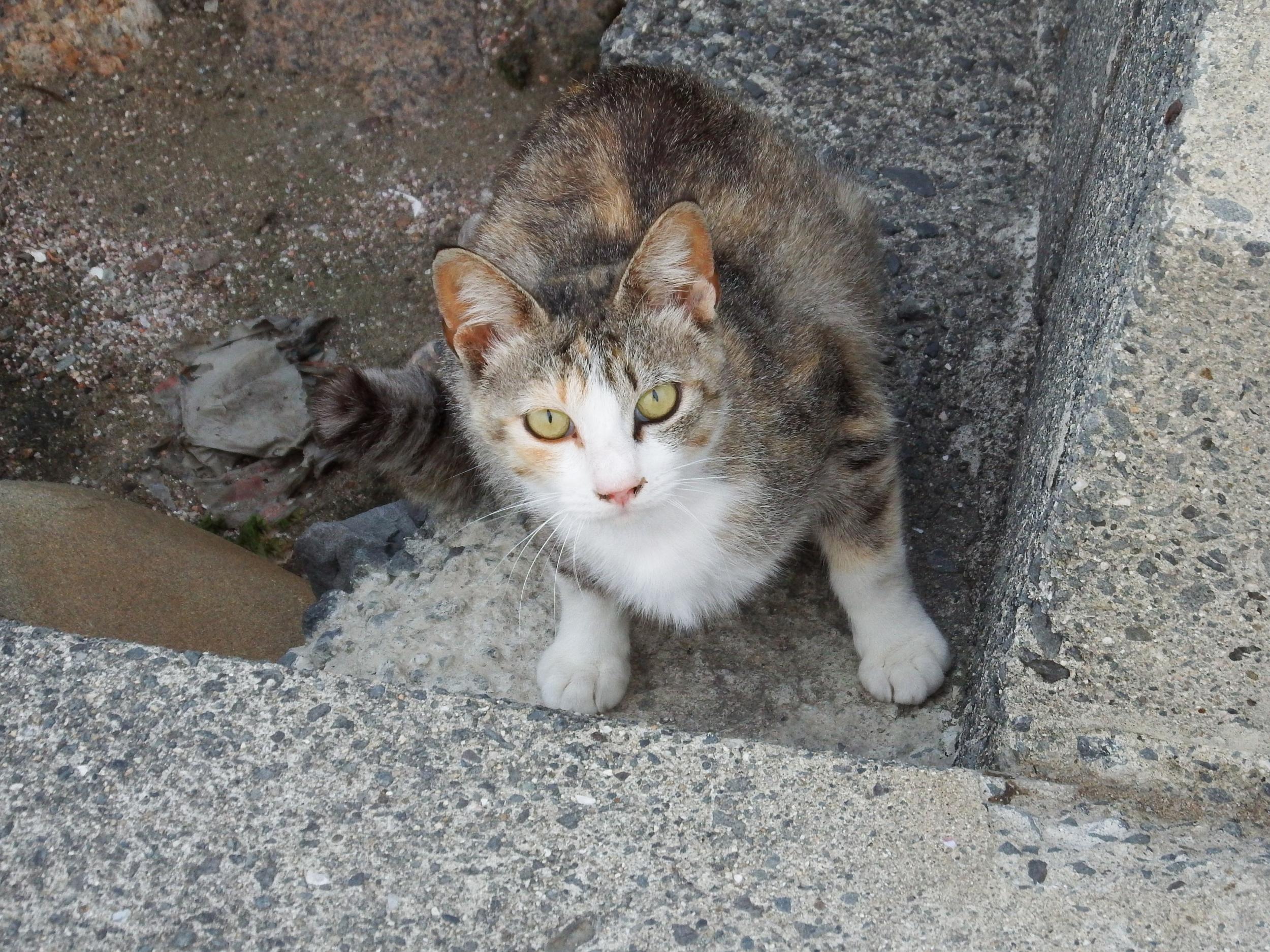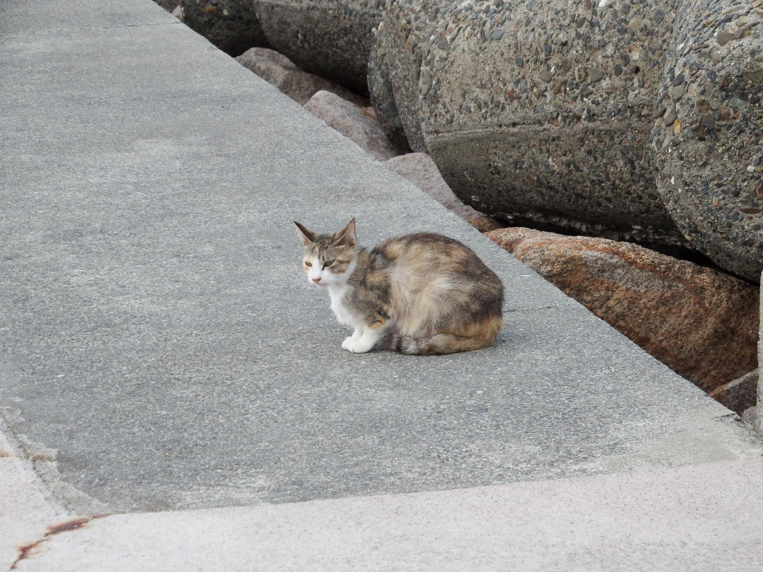 尾崎の浜南側の階段状の防波堤にいつもノラたちが何匹かいます。その中でこの子が一番可愛い。
