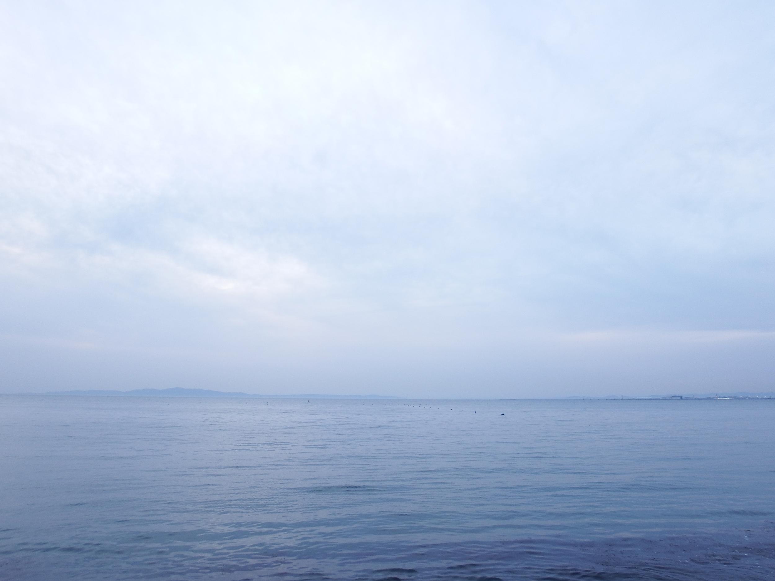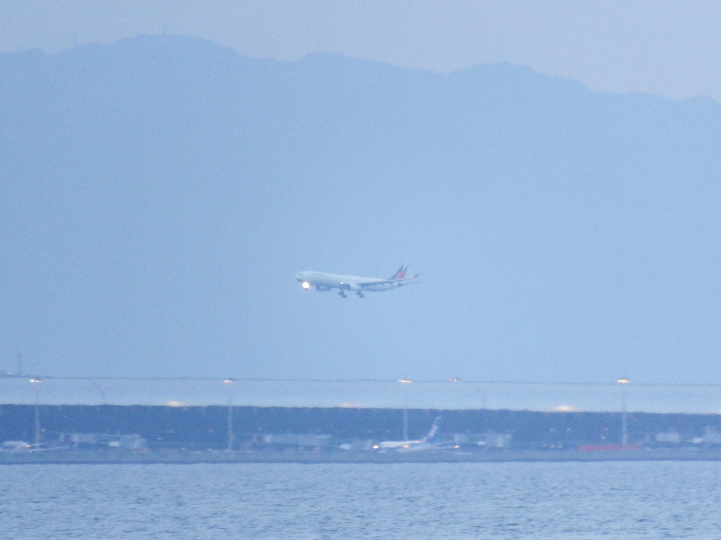 今日の夕日は無理ですがうっすら明石海峡大橋も見えます。この辺りの海にはスナメリが棲んでいるはずです。もちろん見つけられません。フィリピン航空機がランディングライトを光らせて着陸。