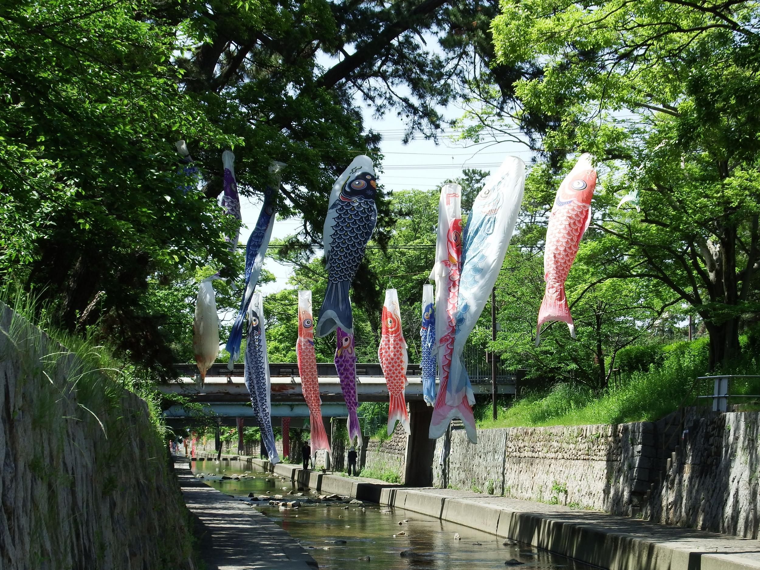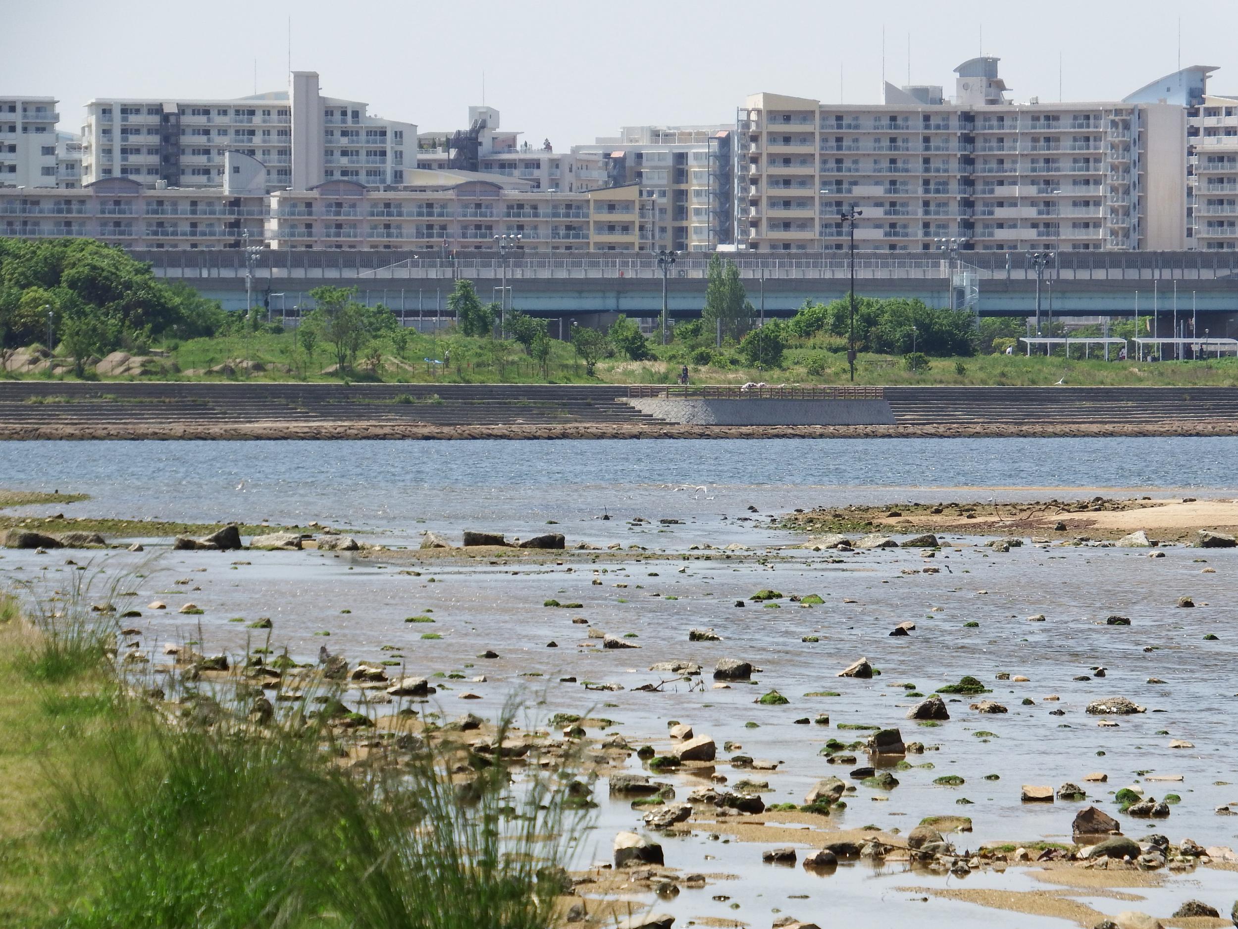 夙川にはまだ鯉のぼり、お雛様のように節句を過ぎたらすぐ片付けないとダメ、とかはないみたいです。香櫨園浜に到着、干潮で右岸河口に姿を表した干潟に白い鳥が見えます。