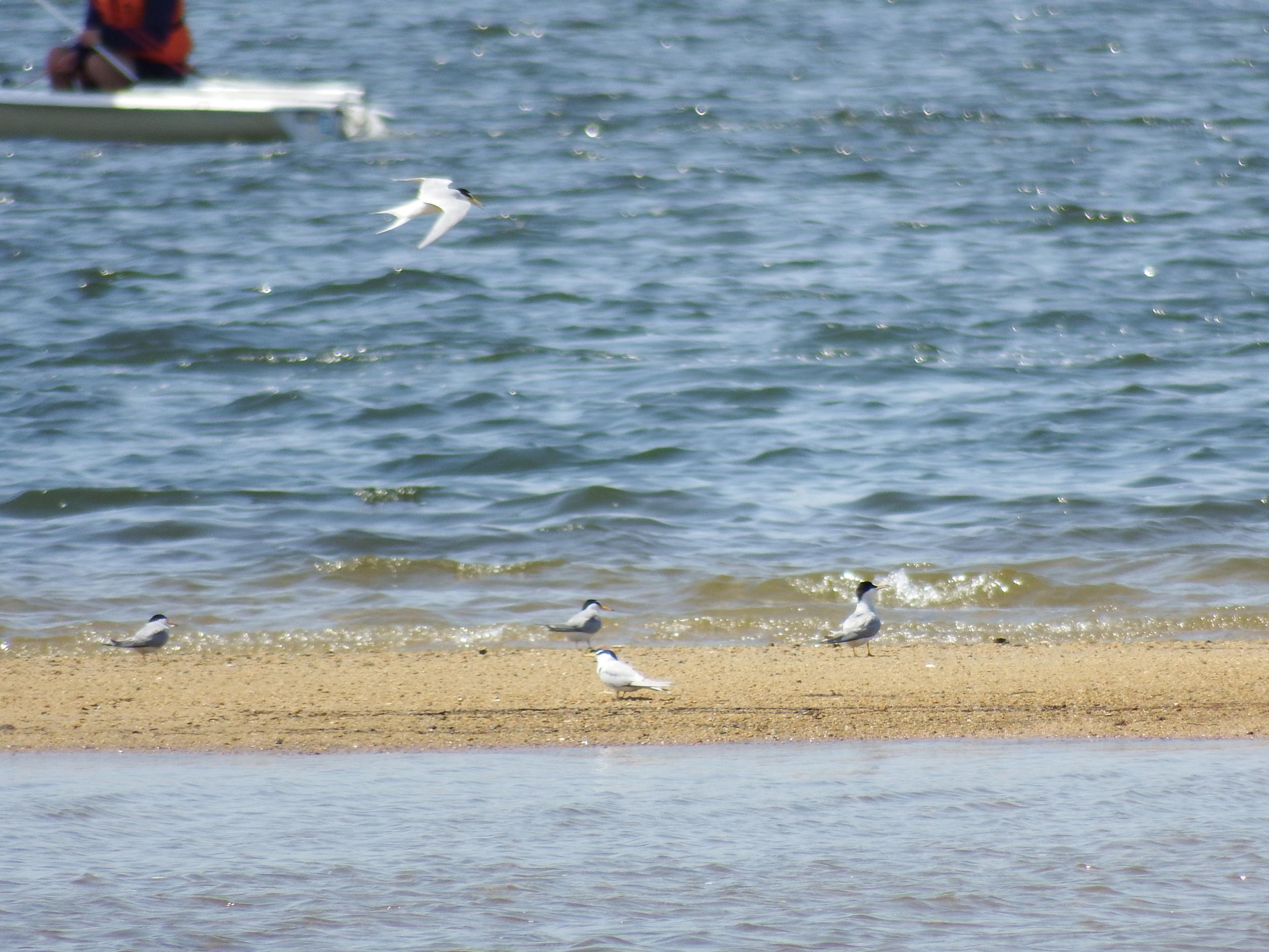 コアジサシは50羽くらいいそうです。すぐ向うでヨットスクールの講習中。